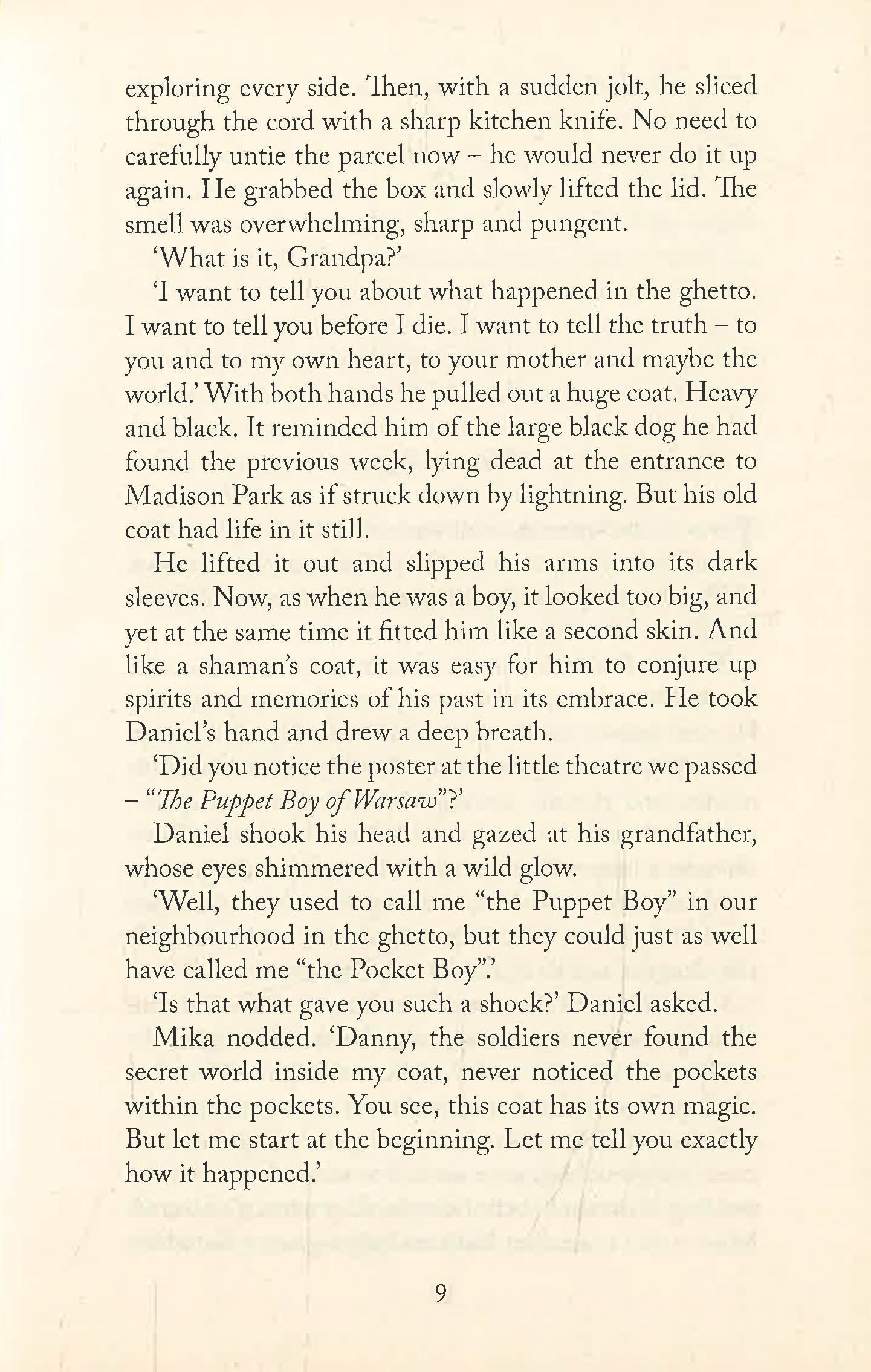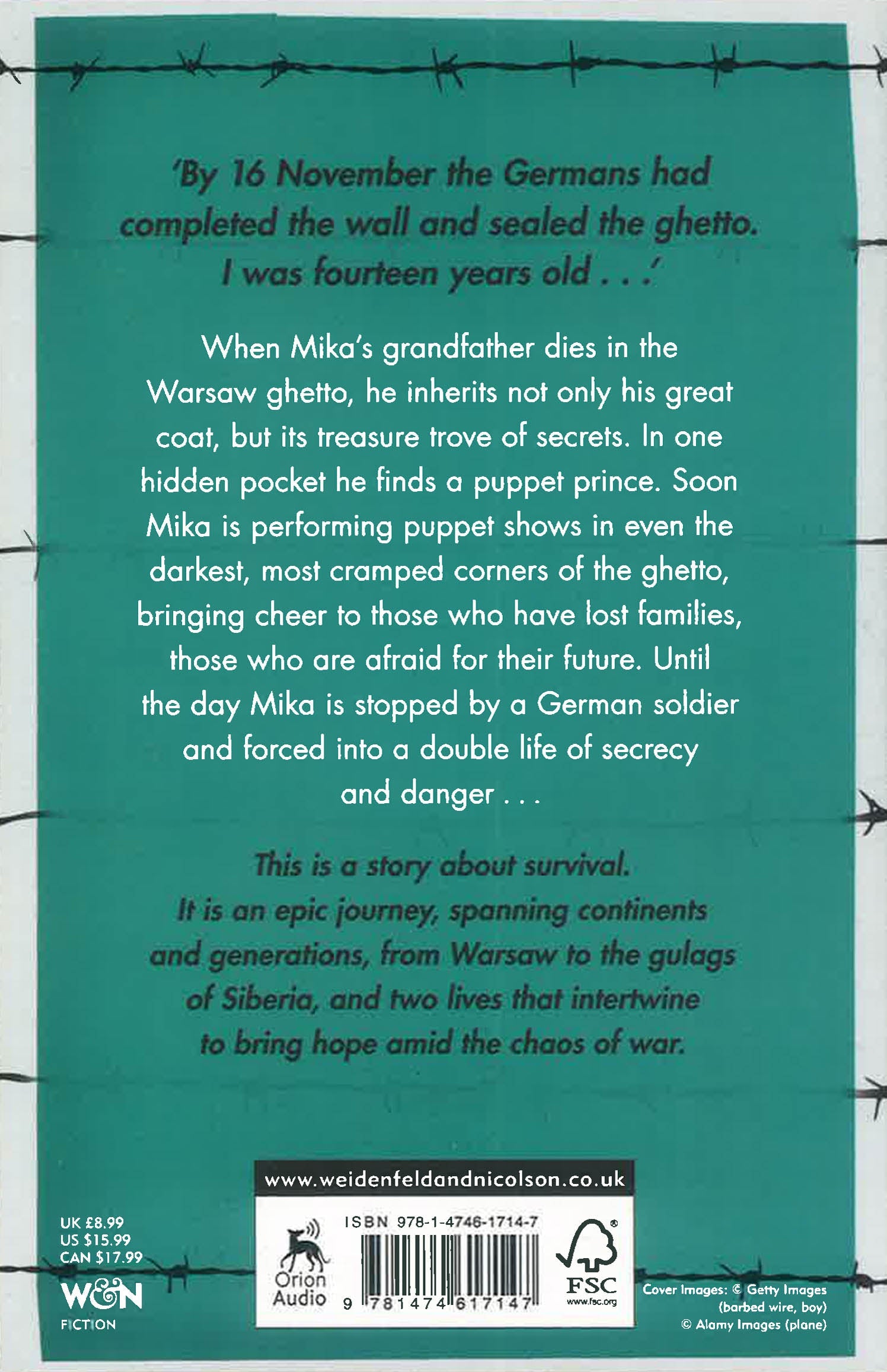 Even in the most difficult of lives, there is hope. When Mika's grandfather dies in the Warsaw ghetto, he inherits not only his great coat, but its treasure trove of secrets. In one remote pocket, he finds a papier mache head, a scrap of cloth... a puppet prince. And what better way to cheer the cousin who has lost her father, the little boy who is ill, the neighbours living in one cramped room, than a puppet show? Soon the whole ghetto is talking about the puppet boy - until the day when Mika is stopped by a German officer and is forced into a secret life...
