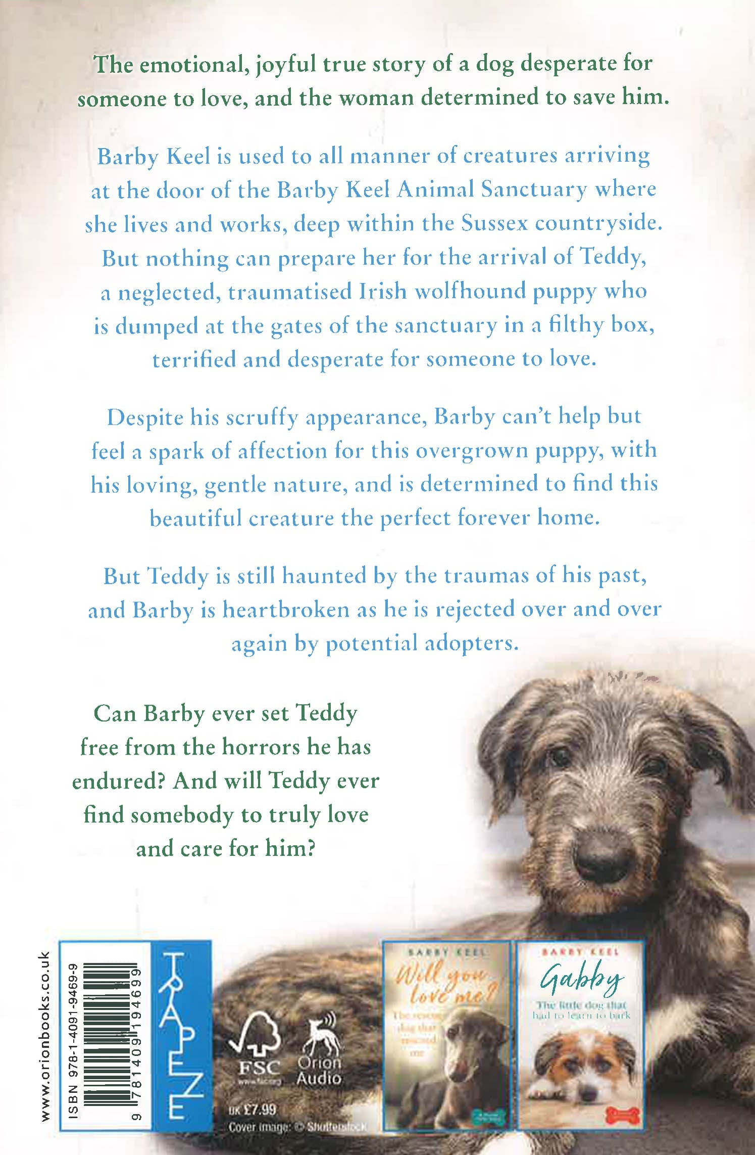 Barby Keel is used to all manner of creatures arriving at the door of the Barby Keel Animal Sanctuary where she lives and works, deep within the Sussex countryside. Nothing can prepare her for the arrival of Teddy, however, a neglected, traumatised puppy who is dumped at the gates of the sanctuary in a filthy box, terrified and desperate for someone to love.Despite his scruffy appearance, Barby can't help but feel a spark of affection for the overgrown puppy. But with Barby living in a caravan along with her four other dogs, she knows in her heart of hearts that Teddy deserves a more stable forever home. Wiping away tears, she waves Teddy away to his new life with a young couple, knowing that she's done what's best for the animal. But barely a few days later, Teddy is returned to the sanctuary, his new family unable to cope with his boisterous behaviour and his ever-growing size. Barby tries desperately to re-home him, but Teddy is rejected over and over again by his new foster families. Anxious and terrified of being separated from her, Barby is now faced with the impossible task of working through the traumas of Teddy's past to help the young dog. But when she receives the devastating news that her beloved younger brother has received a shocking diagnosis, Barby's life as she knows it is thrown into disarray. Can the love of a gentle giant help Barby through the unimaginable? And will Barby's unwavering devotion set Teddy free from the suffering he has endured?