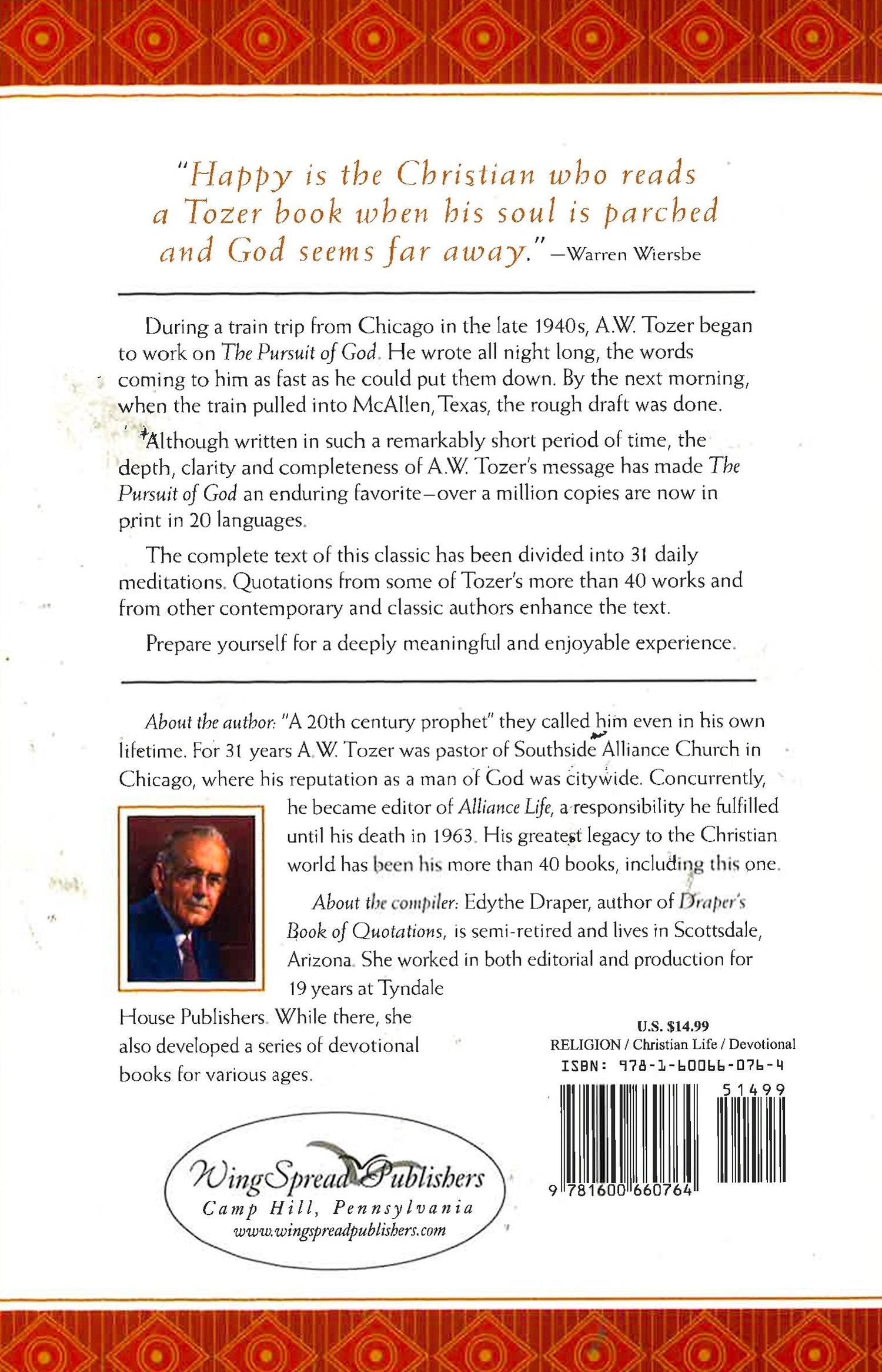 This book of readings is a book about the pursuit of God as a noble duty, not for the faint of heart. It is one that is divinely inspired, as Tozer says, by an urge placed in us by God to spur us on to the pursuit. The pursuit is asking God to reveal His Glory. It is coming to God humbly and simply. This 31-day devotional will fill your heart with the warmth and regenerative power of the Holy Spirit. Each day for 31 days, A.W. Tozer offers a new meditation on the nature of faith as he sees it. He challenges the devotee to come to God with a humble heart, and an uncluttered mind by the materialism of the sinful world. Over and over again he asserts the challenge of denying the self-life in exchange for a full devotion to the Lord. God is speaking, he says, and it is up to the believer to listen, be receptive and pursue! Also included in this book are several various special features; One is the excerpts from other works of Tozer as well as some poems and the rare Rules for Self-Discovery which is a great tool to have in your possession! Prepare yourself for a deeply meaningful and humbling experience in meditation and fellowship with God.