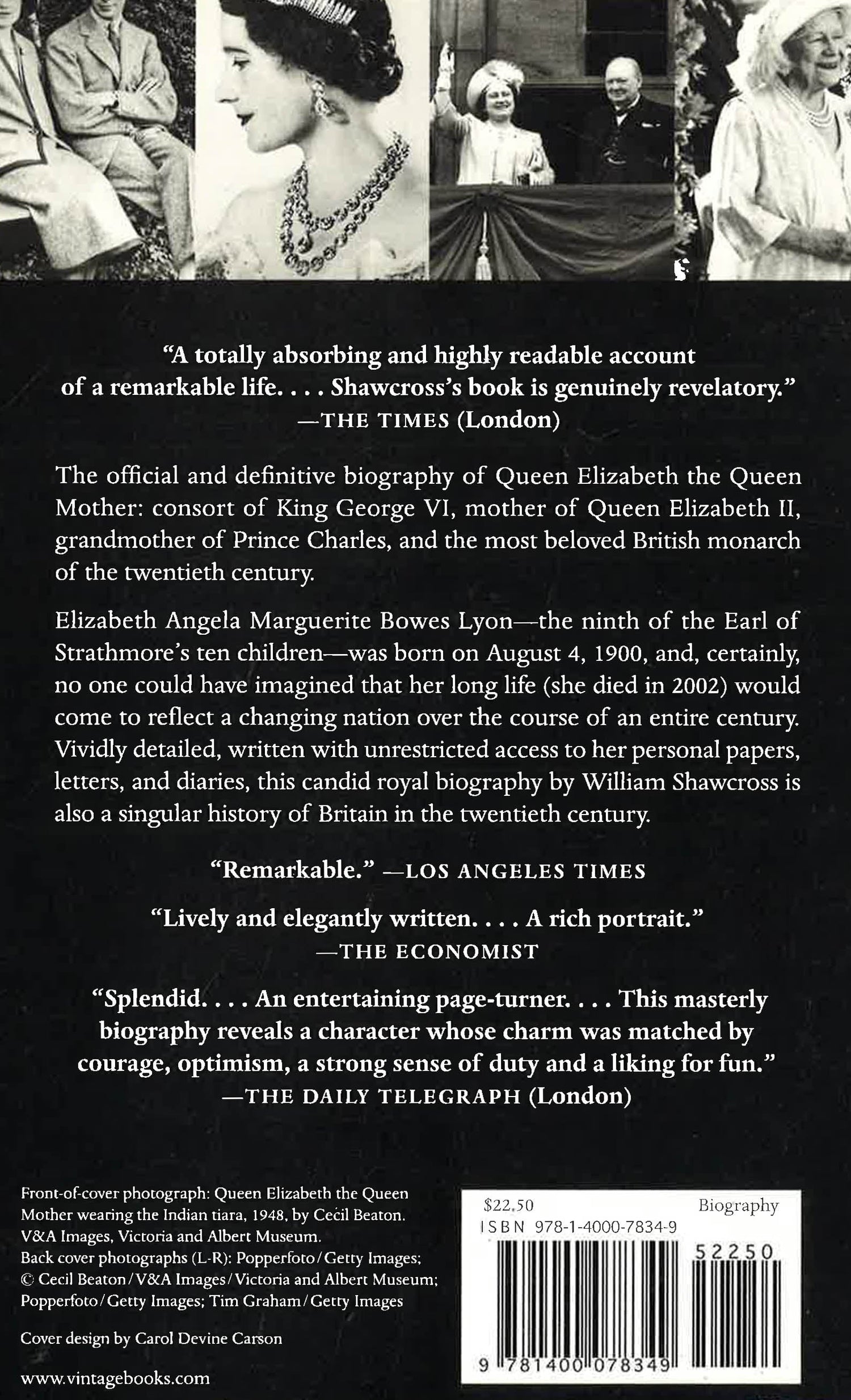 The official and definitive biography of Queen Elizabeth the Queen Mother, the most beloved British monarch of the twentieth century. Consort of King George VI, mother of Queen Elizabeth II, and grandmother of Prince Charles, Elizabeth Angela Marguerite Bowes-Lyon--the ninth of the Earl of Strathmore's ten children--was born on August 4, 1900, and, certainly, no one could have imagined that her long life (she died in 2002) would come to reflect a changing nation over the course of an entire century. Vividly detailed, written with unrestricted access to her personal papers, letters, and diaries, this candid royal biography by William Shawcross is also a singular history of Britain in the twentieth century.