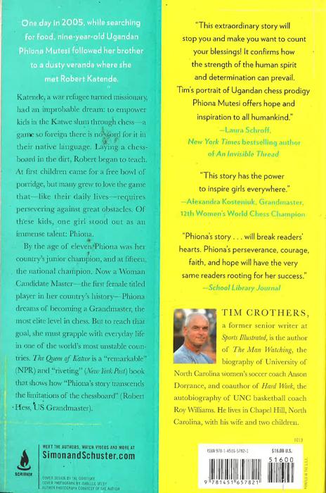 One day in 2005 while searching for food, nine-year-old Ugandan Phiona Mutesi followed her brother to a dusty veranda where she met Robert Katende. Katende, a war refugee turned missionary, had an improbable dream: to empower kids in the Katwe slum through chess-a game so foreign there is no word for it in their native language. Laying a chess-board in the dirt, Robert began to teach. At first children came for a free bowl of porridge, but many grew to love the game that-like their daily lives-requires persevering against great obstacles. Of these kids, one girl stood out as an immense talent: Phiona. By the age of eleven Phiona was her country's junior champion, and at fifteen, the national champion. Now a Woman Candidate Master-the first female titled player in her country's history-Phiona dreams of becoming a Grandmaster, the most elite level in chess. But to reach that goal, she must grapple with everyday life in one of the world's most unstable coun-tries. The Queen of Katwe is a "remarkable" (NPR) and "riveting" (New York Post) book that shows how "Phiona's story transcends the limitations of the chessboard" (Robert Hess, US Grandmaster).