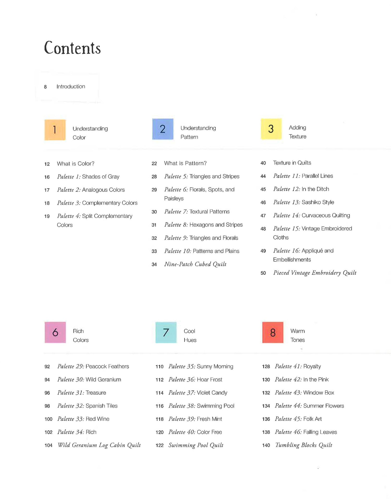 It is an everyday challenge for crafters of all types to make choices about color, pattern and texture for their projects. The range of options makes this challenge nearly impossible and often the end result can be disappointing. Fear not! "The Quilter's Palette" offers readers more than 400 color swatches and a library of 60 different color palette combinations to help guide quilters in their choices for each project. "The Quilter's Palette" is a comprehensive guide to the myriad color and texture choices available and offers inspiration and instructions for getting the final results you want with each project. Each chapter tackles a new technique, along with palettes and swatches. Each palette illustrates variations on effects, patterns, and designs. Whether you are a beginner or intermediate quilter, this instructive guide helps you choose successful fabric combinations and define your unique project style. "The Quilter's Palette" is perfect for exploring color and texture combinations in a visually appealing and instantly understandable way. Each palette offers a specific theme that allows you to see what the result will be before jumping in. With over 150 fabric combinations arranged in 52 palettes and divided into easy-to-understand chapters, each revealing a different aspect of color or pattern, this book will provide you with eight full quilt designs with illustrated step-by-step instructions and 50 quilt block patterns with templates.