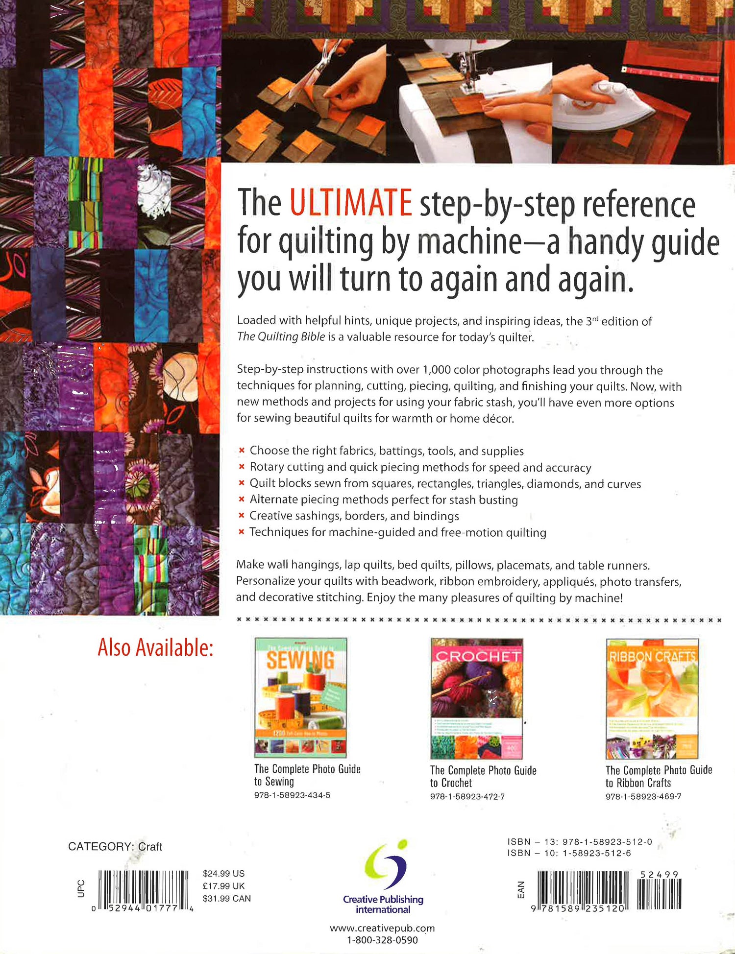 This is the one reference every quilter needs. Its 352 pages and 1,000 photographs cover every aspect of machine quilting. Sections include quilt basics, block-pieced quilts, appliqué quilts, special piecing methods, embellishing quilts, and a sampler quilt with related projects. Quilters from beginners to the skilled will turn to this book again and again. Revised with new photography and updated content to be more complete, this is the only reference machine quilters will need.