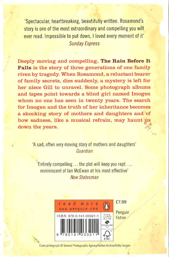 When Rosamund, a reluctant bearer of family secrets, dies suddenly, a mystery is left for her niece Gill to unravel. Some photograph albums and tapes point towards a blind girl named Imogen whom no one has seen in twenty years. The Rain Before it Falls - Jonathan Coe's heartbreaking novel of family secrets Deeply moving and compelling, The Rain Before it Falls is the story of three generations of one family riven by tragedy. When Rosamund, a reluctant bearer of family secrets, dies suddenly, a mystery is left for her niece Gill to unravel. Some photograph albums and tapes point towards a blind girl named Imogen whom no one has seen in twenty years. The search for Imogen and the truth of her inheritance becomes a shocking story of mothers and daughters and of how sadness, like a musical refrain, may haunt us down the years. 'Spectacular, heartbreaking, beautifully written. Rosamund's story is one of the most extraordinary and compelling you will ever read. Impossible to put down, I loved every minute of it' Sunday Express 'A sad, often very moving story of mothers and daughters' Guardian 'Entirely compelling...the plot will keep you rapt...reminiscent of Ian McEwan at his most effective' New Statesman Jonathan Coe's novels are filled with moving, astute observations of life and love, and are written with a revealing honesty that has captivated a generation of readers. His other titles, The Accidental Woman, The Rotters' Club (winner of the Everyman Wodehouse prize), The Closed Circle, The Dwarves of Death, The Terrible Privacy of Maxwell Sim, The House of Sleep (winner of the 1998 Prix Medicis Etranger), A Touch of Love, and What a Carve Up! (winner of the 1995 John Llewellyn Rhys Prize), are all available in Penguin paperback.