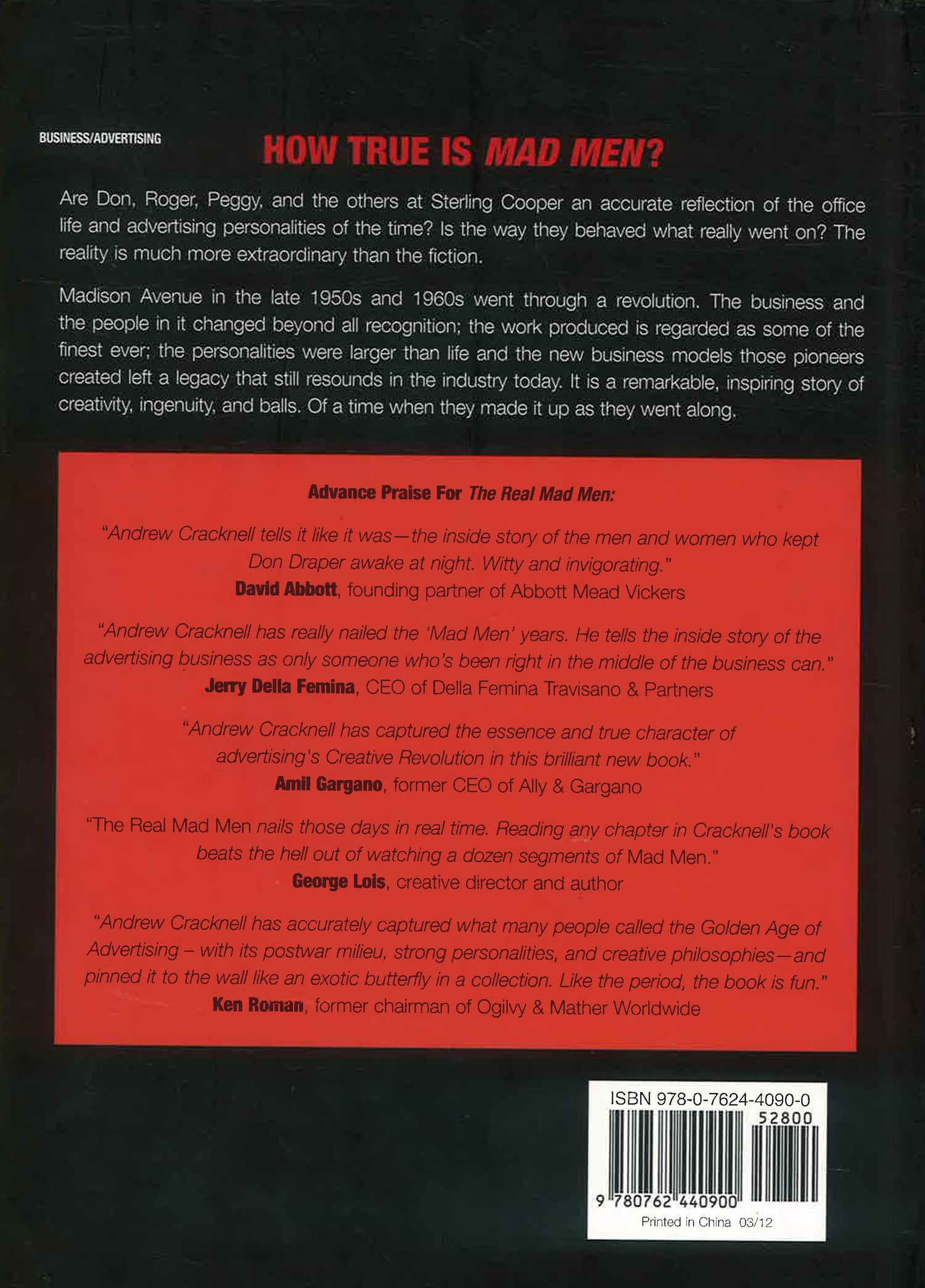 AMC's award-winning drama Mad Men has garnered awards for its portrayal of advertising executives. This engaging, insightful narrative reveals, for the first time, the lives and work of the real advertising men and women of that era. Just as portrayed in the series, these creative people were the stars of the real Madison Avenue. Their innate eccentricity, vanity, and imagination meant their behavior and lifestyle was as candid and original as their advertising. They had it and they flaunted it. People like Bill Bernbach, George Lois, Ed McCabe, Mary Wells, Marion Harper, Julian Koenig, Steve Frankfurt, and Amil Gargano, and others, who in that small space, in that short time, created some of the most radical and influential advertising ever and sparked a revolution in the methods, practice, and execution of the business. Including over 100 full-color illustrations, the book details iconic campaigns such as VW, Avis, Alka Seltzer, Benson & Hedges, Polaroid, and Braniff Airways.