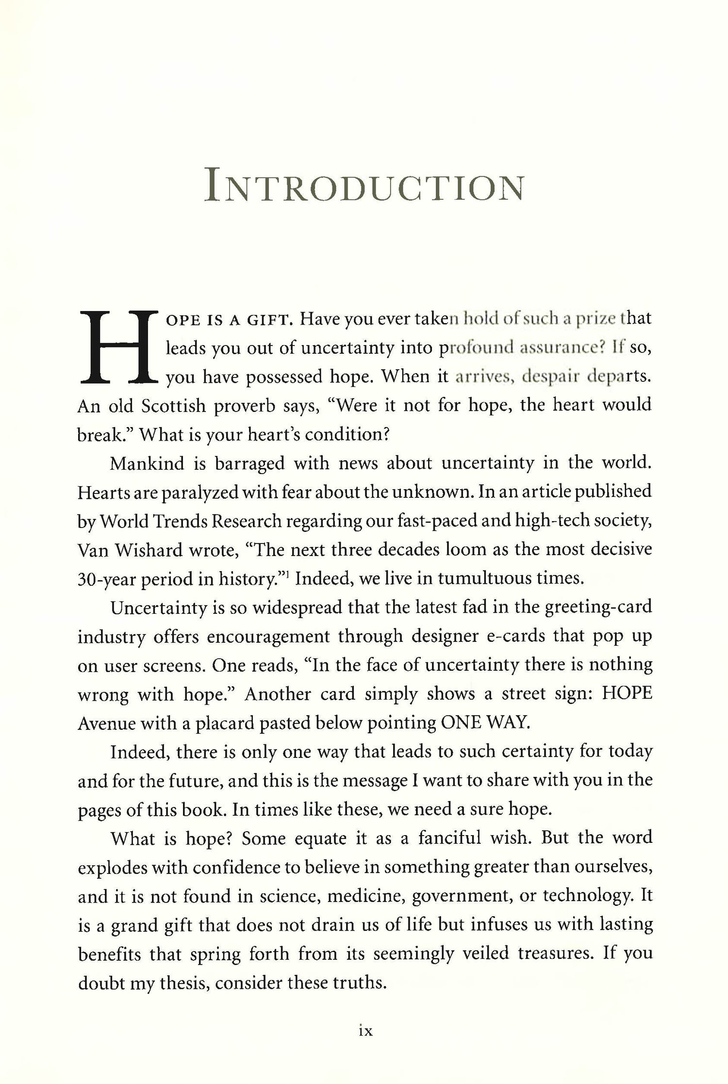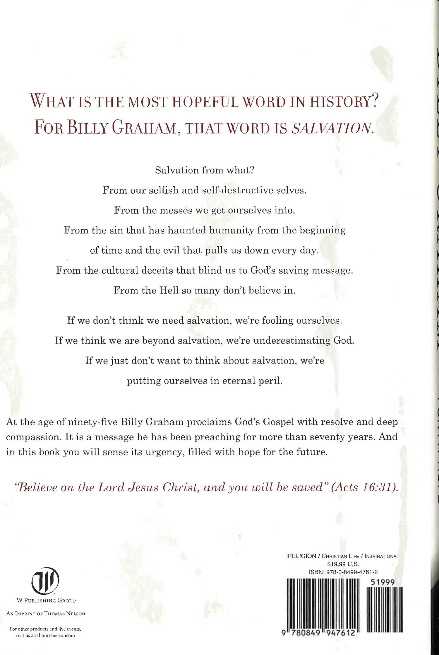 Back cover: What is the most hopeful word in History? For Billy Graham, that word is SALVATION. Salvation from what? From our selfish and self-destructive selves. From the messes we get ourselves into. From the sin that has haunted humanity from the beginning of time and the evil that pulls us down every day. From the cultural deceits that blind us to God's saving message. From the Hell so many don't believe in. If we don't think we need salvation, we're fooling ourselves. If we think we are beyond salvation, we're underestimating God. If we just don't want to think about salvation, we're putting ourselves in eternal peril. At the age of ninety-five Billy Graham proclaims God's Gospel with resolve and deep compassion. It is a message he has been preaching for more than seventy years. And in this book you will sense its urgency, filled with hope for the future. "Believe on the Lord Jesus Christ, and you will be saved" (Acts 16:31) From America's evangelistic elder statesman Salvation is what we all long for, when we are lost or in danger or have made a mess of our lives. And salvation belongs to us, when we reach out for the only One who can rescue us-Jesus. The saving message of the Gospel is the heartbeat of this preacher and evangelist. Millions around the world have heard Billy Graham proclaim this unchanging truth. He has never forgotten the transformation of his own life, when he first said yes to God's gift of salvation, and he has witnessed multitudes turn their hearts to the God of Hope. The Reason for My Hope: Salvation presents the essence of that transformative message. It is biblical and timeless, and though simple and direct, it is far from easy. There are hard words, prophetic words, directed toward a culture that denies the reality of sin and distracts us from the veracity of Hell. But through its ominous warnings shines a light that cannot be extinguished-a beacon of hope that Jesus came "to seek and to save that which was lost" (Luke 19:10).
