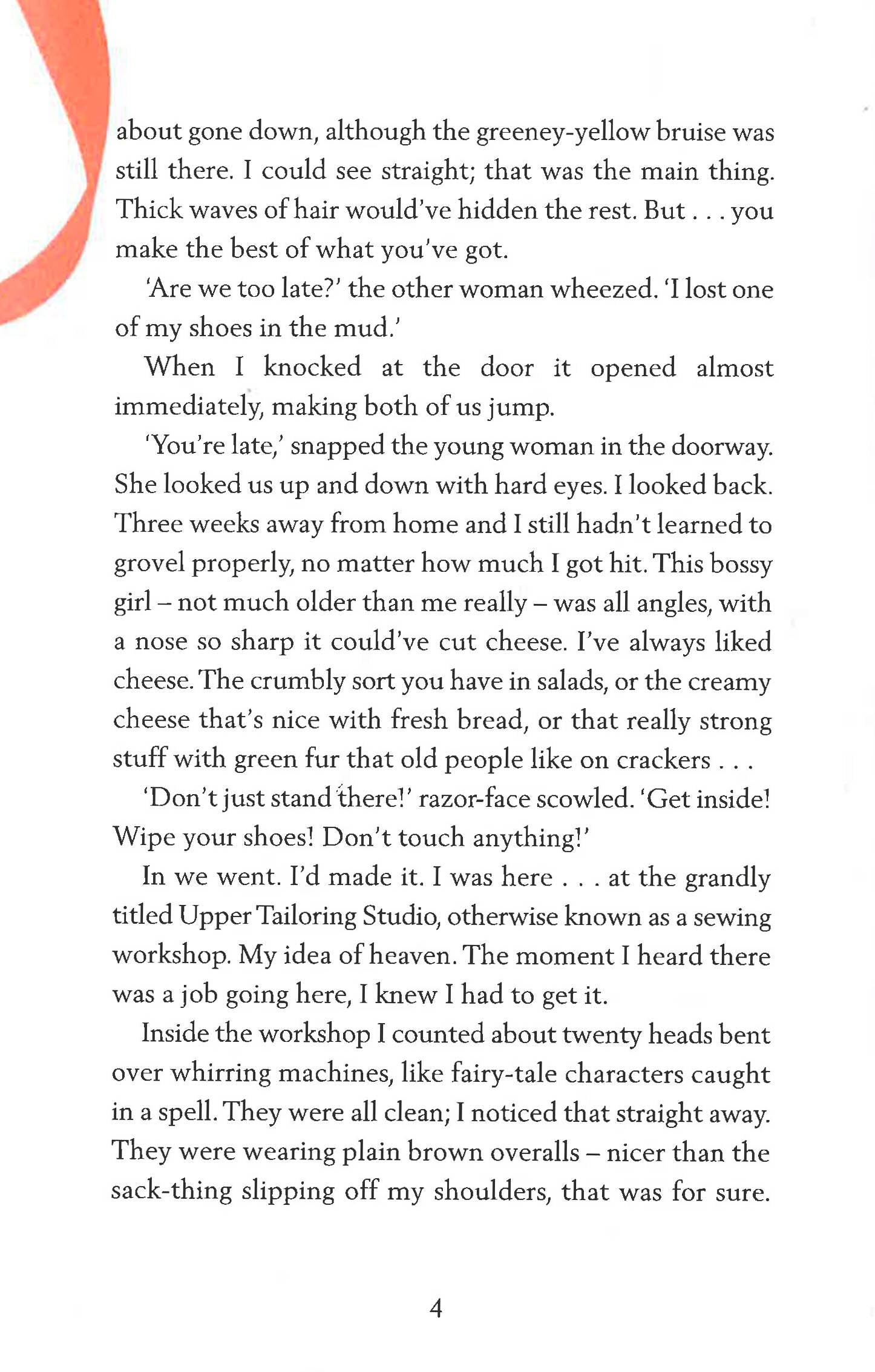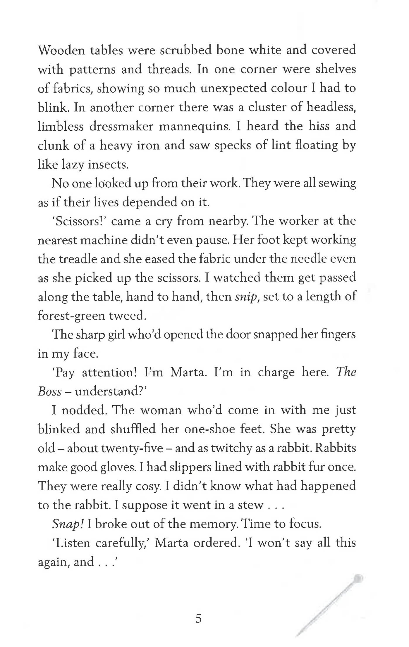 As fourteen-year-old Ella begins her first day at work she steps into a world of silks, seams, scissors, pins, hems and trimmings. She is a dressmaker, but this is no ordinary sewing workshop. Hers are no ordinary clients.