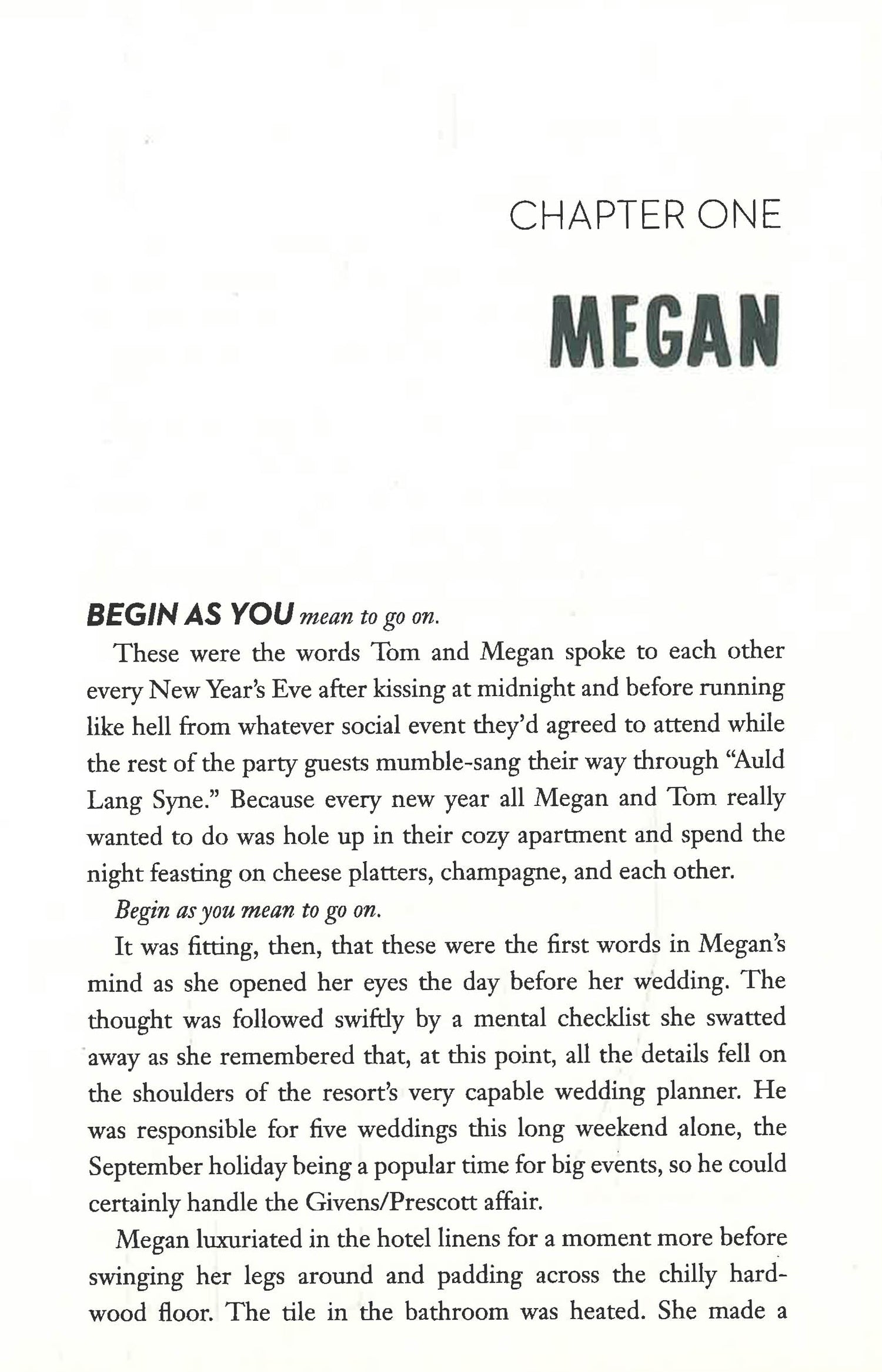 Megan Givens and Tom Prescott are heading into what is supposed to be their magical wedding weekend on beautiful San Juan Island. But with two difficult families, ten years of history, and all too many secrets, things quickly go wrong. After a disastrous rehearsal dinner they vow to call the whole thing off--only to wake up the next morning stuck together in a time loop. Are they really destined to relive the worst day of their lives, over and over? And what happens if their wedding day does arrive?