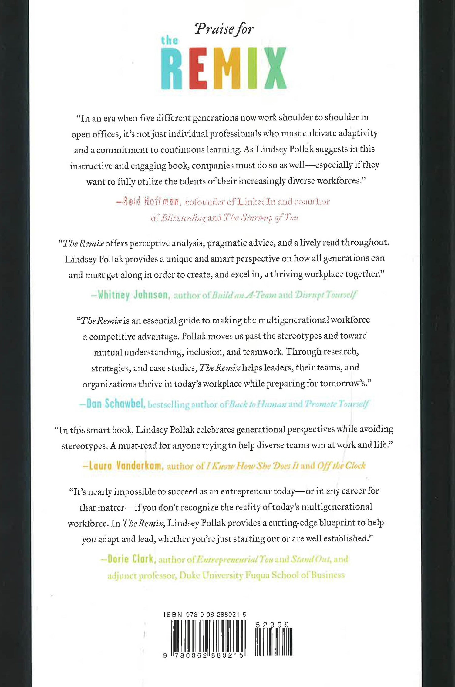 A Wall Street Journal and Financial Times book of the monthMillennials have become the largest generation in the U.S. workforce, and Generation Z workers are right behind them. Leaders and organizations must embrace the new ways of working that appeal to the digital-first generations, while continuing to appeal to Baby Boomers and Generation X, who will likely remain in the workforce for decades to come.Within any organization, team, meeting, or marketing opportunity, you will likely find any combination of generations, each with their own attitudes, expectations, and professional styles. To lead and succeed in business today, you must adjust to how Millennials work, continue to accommodate experienced colleagues and pay attention to the next generations coming up. The Remix shows you how to adapt and win through proven strategies that serve all generations' needs. The result is a workplace that blends the best of each generation's ideas and practices to design a smarter, more inclusive work environment for everyone.As a leading expert on the multigenerational workplace, Lindsey Pollak combines the most recent data with her own original research, as well as detailed case studies from Fortune 500 companies and other top organizations. Pollak outlines the ways businesses, executives, mid-level managers, employees, and entrepreneurs can tackle situations that may arise when diverse styles clash and provides clear strategies to turn generational diversity into business opportunity. Generational change is impacting all industries, all types of organizations, and all leaders. The Remix is an essential guide for anyone looking to navigate today's multigenerational workplace, which is more diverse and varied than ever before.