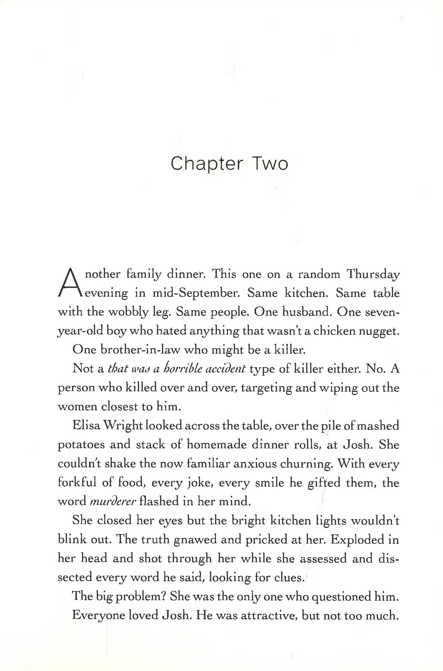 Elisa Wright is a mom and wife, living a nice, quiet life in a nice, quiet town. She’s also convinced her brother-in-law is a murderer. Josh has one dead wife and one missing fiancée, and though he grieved for them he starts dating someone new. Elisa fears for that woman’s safety, and she desperately wants to know what happened to her friend, Josh’s missing fiancée.