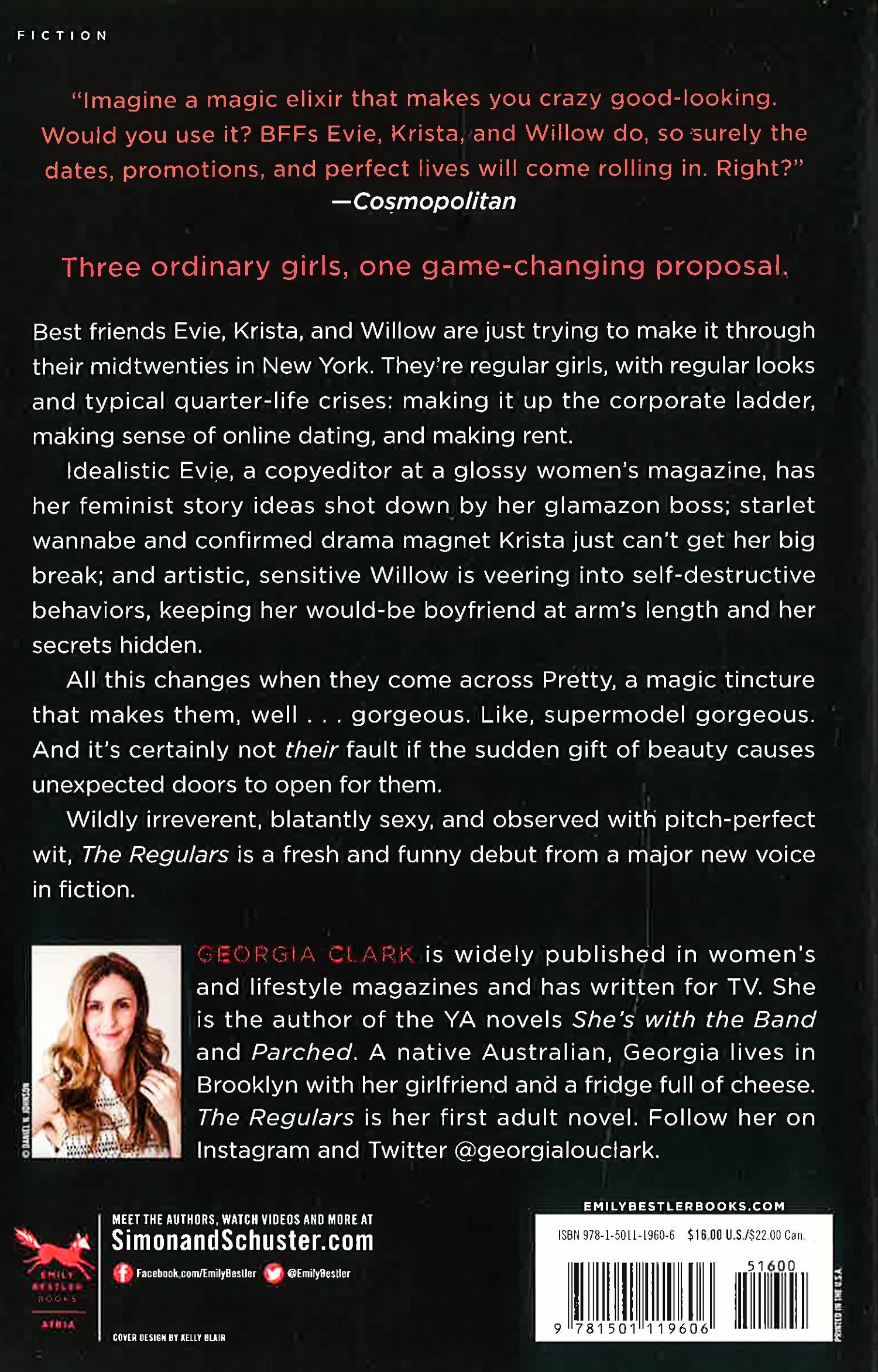 Redbook Best of the Year Pick PopSugar's Best Books of the Year Teen Vogue's Best Books of the Year Reading with Robin 2016 Favorite A fierce, feisty, and "compulsively delicious" (Redbook) debut with a magical twist about three ordinary, regular young women who suddenly have their fantasies come true...or do they? Best friends Evie, Krista, and Willow are just trying to make it through their mid-twenties in New York. With average looks and typical quarter-life crises, they're trying to make it up the corporate ladder, make sense of online dating, and make rent. Until they come across Pretty, a magic tincture that makes them, well...gorgeous. Like, supermodel gorgeous. And it's certainly not their fault if the sudden gift of beauty causes unexpected doors to open for them. But there's a dark side to Pretty, too, and as the gloss fades for these modern-day Cinderellas, there's just one question left: What would you sacrifice to be Pretty? Wildly irreverent, blatantly sexy, and observed with pitch-perfect wit, The Regulars is a fresh, "twisted, modern-day take on Cinderella." (InStyle), perfect for fans of Jennifer Close and Kevin Kwan.