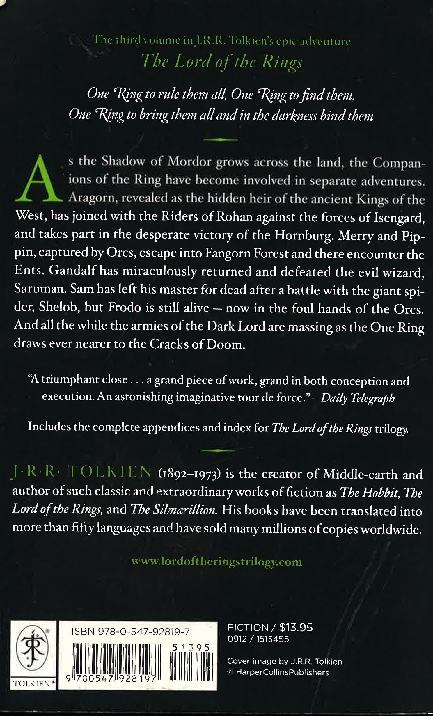 The third volume in J.R.R. Tolkien's epic adventure THE LORD OF THE RINGS One Ring to rule them all, One Ring to find them, One Ring to bring them all and in the darkness bind them As the Shadow of Mordor grows across the land, the Companions of the Ring have become involved in separate adventures. Aragorn, revealed as the hidden heir of the ancient Kings of the West, has joined with the Riders of Rohan against the forces of Isengard, and takes part in the desperate victory of the Hornburg. Merry and Pippin, captured by Orcs, escape into Fangorn Forest and there encounter the Ents. Gandalf has miraculously returned and defeated the evil wizard, Saruman. Sam has left his master for dead after a battle with the giant spider, Shelob; but Frodo is still alive--now in the foul hands of the Orcs. And all the while the armies of the Dark Lord are massing as the One Ring draws ever nearer to the Cracks of Doom. "A triumphant close . . . a grand piece of work, grand in both conception and execution. An astonishing imaginative tour de force." - Daily Telegraph Includes the complete appendices and index for The Lord of the Rings trilogy.
