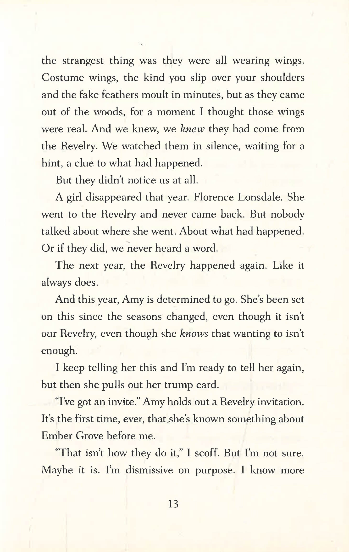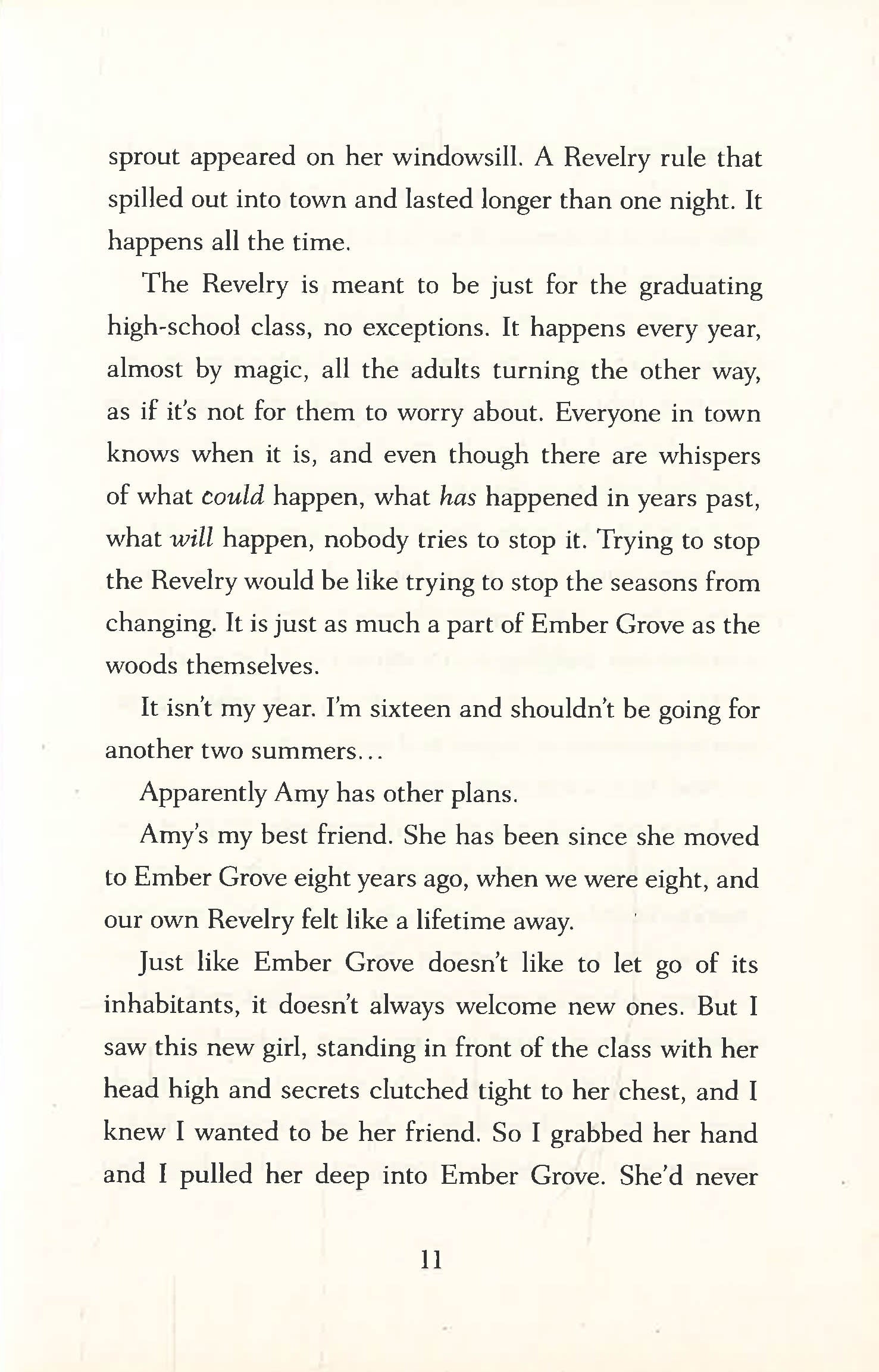 Growing up in Ember Grove, Bitsy Clark knows better than to break the rules around the Revelry, the mysterious end-of-year party in the woods. So when her best friend, Amy, persuades her to sneak in, Bitsy is full of misgivings.