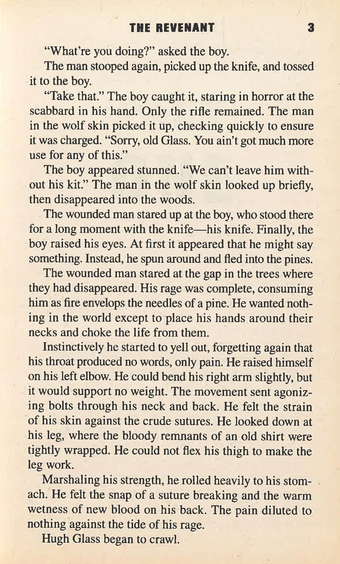 An unforgettable novel of revenge, soon to be a major motion picture, starring Leonardo DiCaprio, to be released in Fall 2015. A mesmerizing, nail-biting tale of survival and the human will. On his quest for revenge, Glass must contend with the unforgiving elements of the western frontier, mortally wounded with few supplies, while being assailed throughout by bands of Native Americans.
