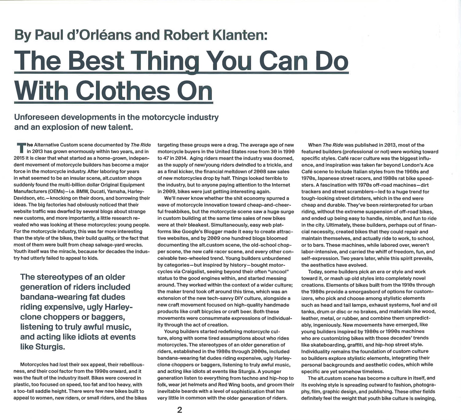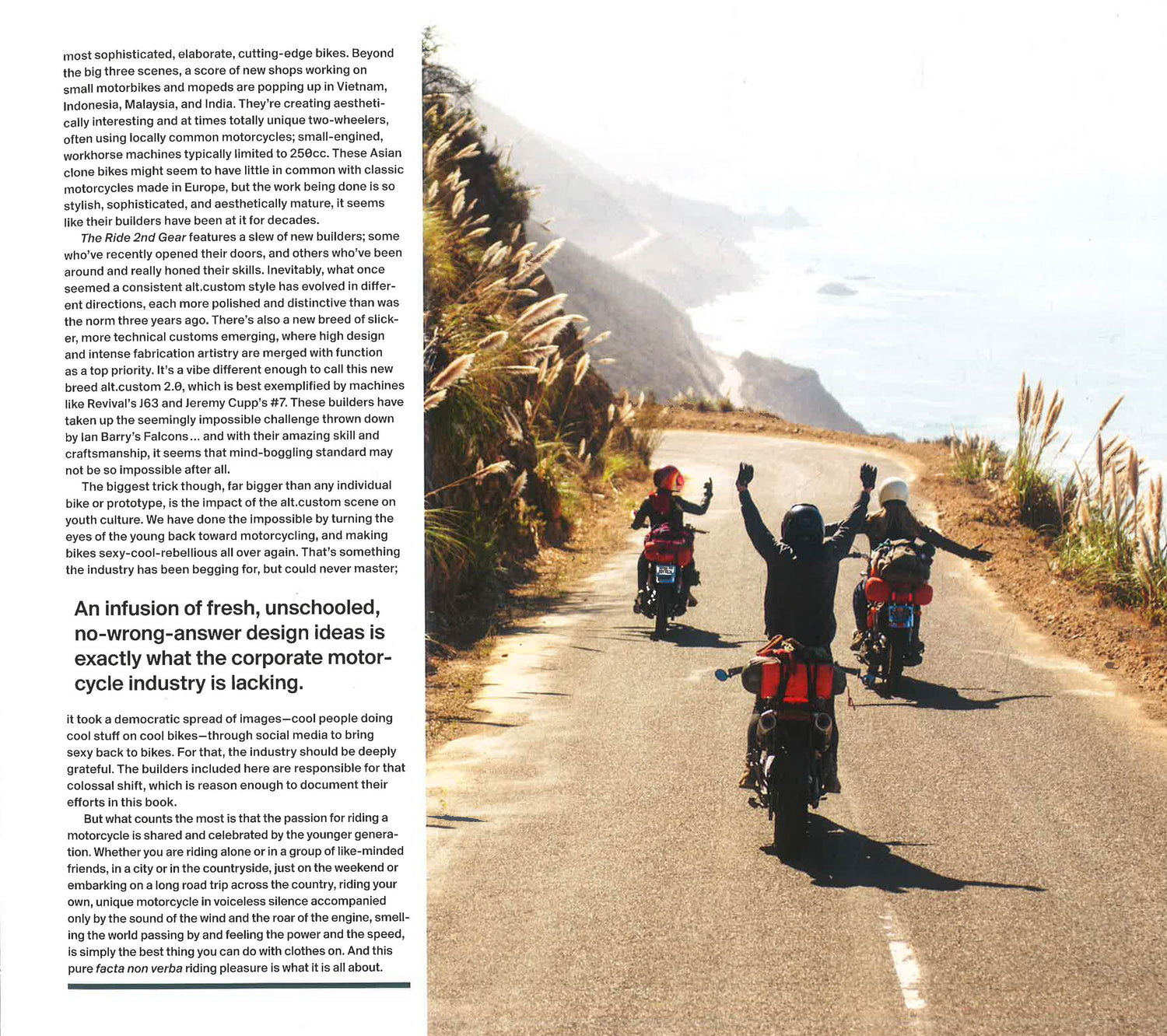 Men and motorcycles: a story that has vacillated somewhere between cult and cliché for years. Custom bikes, in particular, have a history that is deeply rooted in the spirit of freedom and change of the 1960s, as well as man's primal urge to build something with his own hands --or, in this case, tools. The Ride 2nd Gear is a showcase of the power and beauty of these bikes. The book presents a stunning selection of recent custom motorcycles, as well as the small, local workshops around the globe in which they are built. Hotbeds of creativity and craftsmanship, these workshops are mostly run by single individuals and attract a small yet devoted community of fans and fellow builders. Rather than coveting the newest luxury models to come off the assembly line, this community is more concerned with transformations. They want to turn grandpa's old heap, a bargain found on eBay, or a soulless model from another era into something of their very own. They want to augment old motors and existing mechanics with modern technology or make their personal visions of aesthetics and handling a reality. This process takes time, dedication, technical expertise, and skilled handcraft. From limited series to one-offs made for personal pleasure or to order, The Ride 2nd Gear features the brilliant results of this process. Its pages are filled with bikes that offer extraordinary design and driving experiences. In fact, established brands are now acting on trends set by the custom scene whose bikes are often more radical and sophisticated because more attention can be paid to detail and each new idea can be fine-tuned to perfection. The models shown in The Ride 2nd Gear stem from or are based on classic bobbers and choppers, Italian-style racing machines, plastic Japanese motorcycles, and rare BMWs or Triumphs, some of which may very well be 30-50 or even 80 years old. They are vintage in the best sense of the word. They not only preserve, but also improve and expand upon the quality of traditional craftsmanship. Decked out with state-ofthe- art disk brakes, LED lights, gears, and drive components, these custom machines are more agile, faster, and therefore more fun than anything produced in the past.