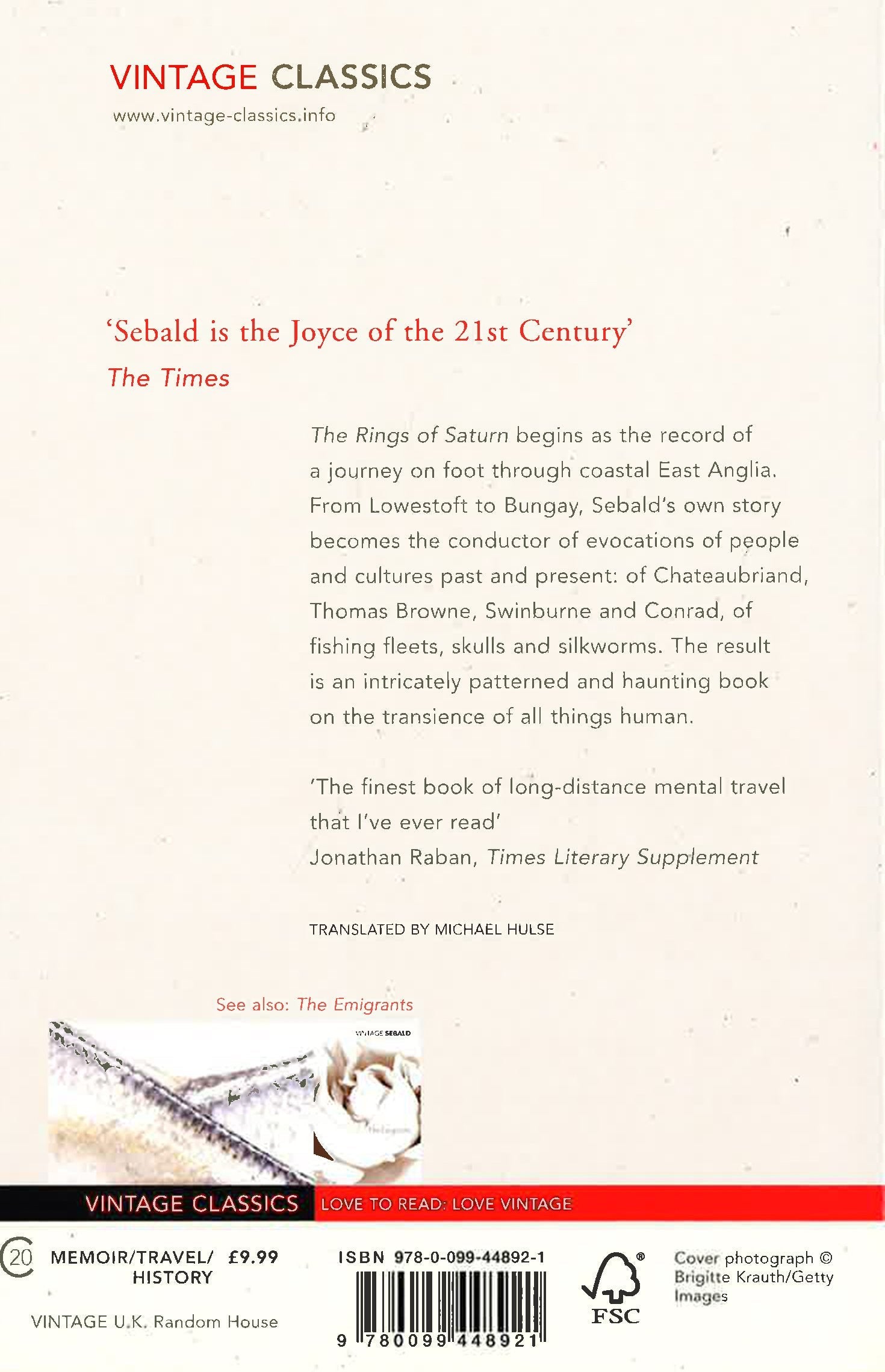 The Rings of Saturn begins as the record of a journey on foot through coastal East Anglia. From Lowestoft to Bungay, Sebald's own story becomes the conductor of evocations of people and cultures past and present: of Chateaubriand, Thomas Browne, Swinburne and Conrad, of fishing fleets, skulls and silkworms. The result is a rich meditation on the past via a melancholy trip along the Suffolk coast, and an intricately patterned and haunting book on the transience of all things human.'Sebald is the Joyce of the 21st Century' The Times