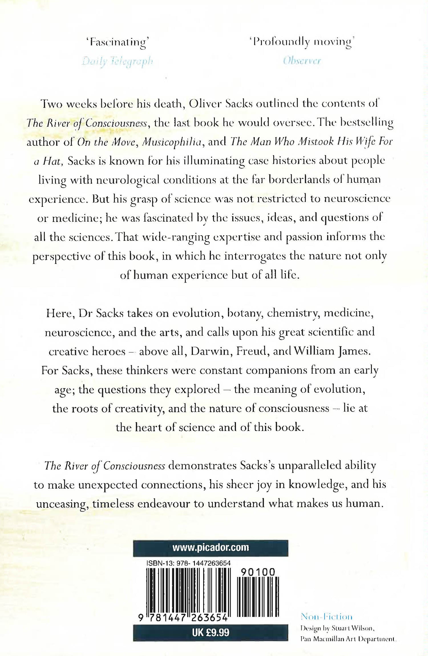 In The River of Consciousness, Dr. Sacks takes on evolution, botany, chemistry, medicine, neuroscience, and the arts, and calls upon his great scientific and creative heroes - above all, Darwin, Freud, and William James. For Sacks, these thinkers were constant companions from an early age; the questions they explored - the meaning of evolution, the roots of creativity, and the nature of consciousness - lie at the heart of science and of this book.