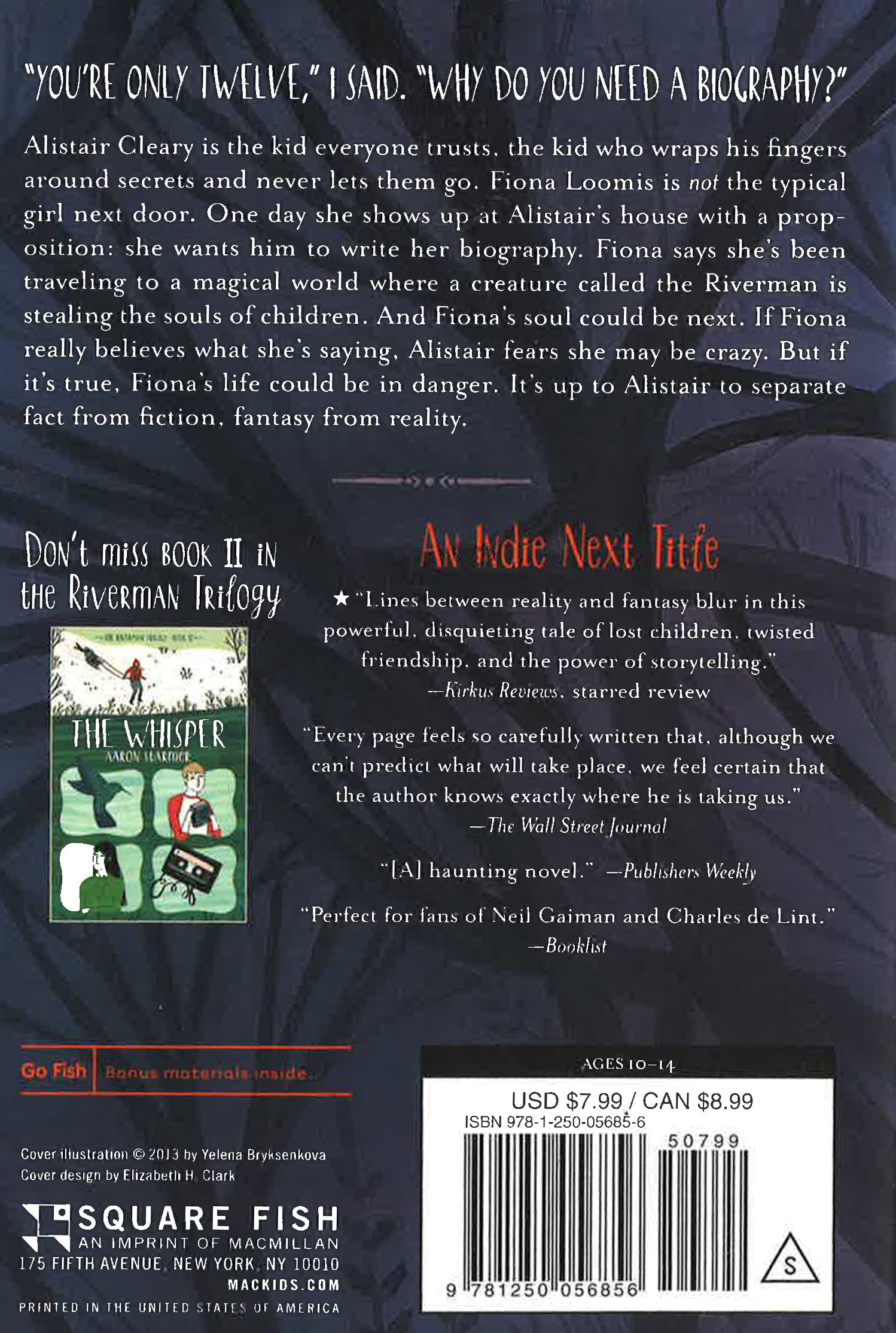 Alistair Cleary is the kid who everyone trusts. Fiona Loomis is not the typical girl next door. Alistair hasn't really thought of her since they were little kids until she shows up at his doorstep with a proposition: She wants him to write her biography. What begins as an odd vanity project gradually turns into a frightening glimpse into the mind of a potentially troubled girl. Fiona says that in her basement, there's a portal that leads to a magical world where a creature called the Riverman is stealing the souls of children. And Fiona's soul could be next. If Fiona really believes what she's saying, Alistair fears she may be crazy. But if it's true, her life could be at risk. It's up to Alistair to separate fact from fiction, fantasy from reality. *this book may have remainder mark*