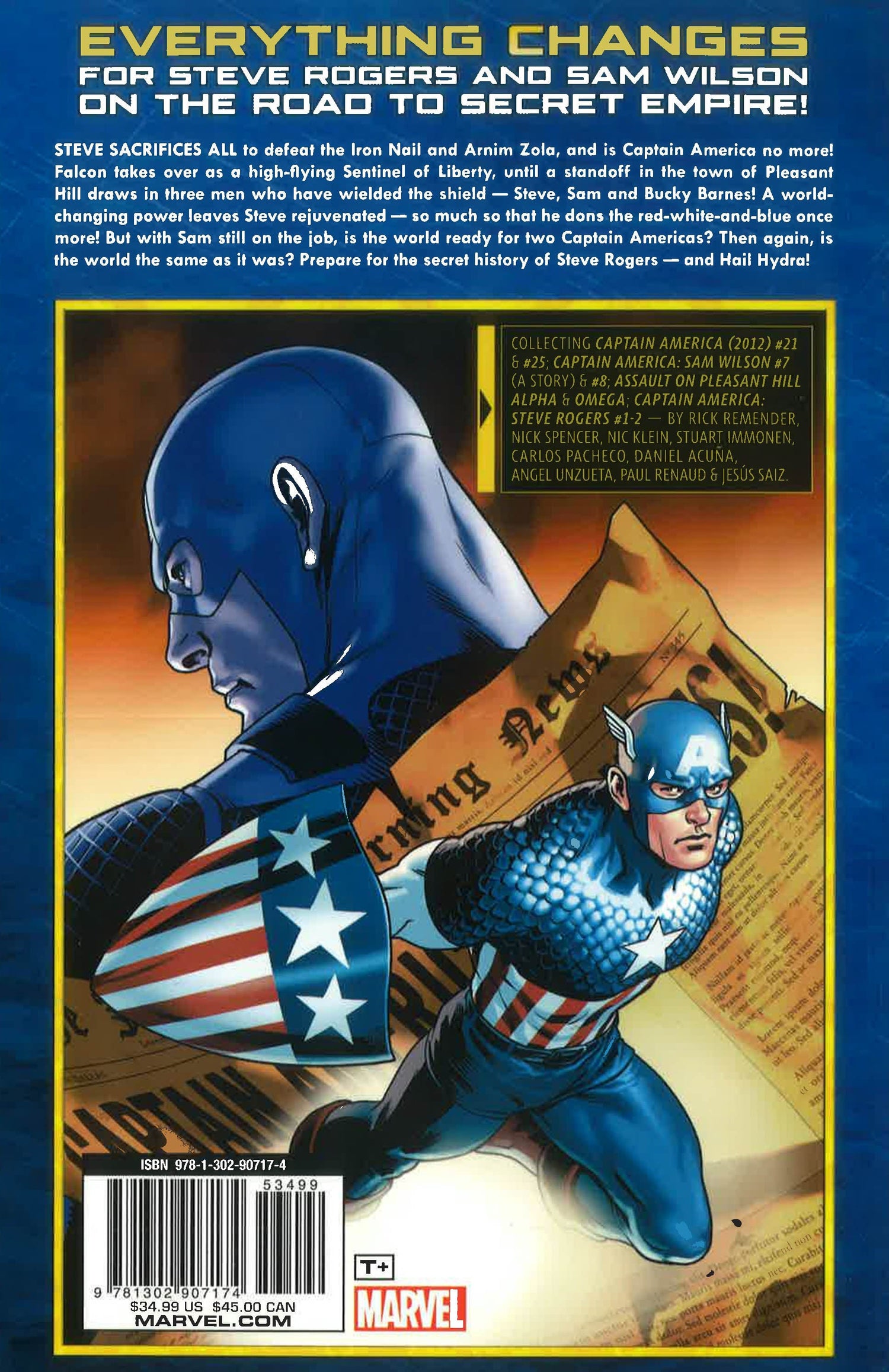 Everything changes for Steve Rogers and Sam Wilson on the road to SECRET EMPIRE! Steve sacrifices all to defeat the Iron Nail and Arnim Zola, and is Captain America no more! Falcon takes over as a high-flying Sentinel of Liberty, until a Standoff in the town of Pleasant Hill draws in three men who have wielded the shield - Steve, Sam and Bucky Barnes! A world-changing power leaves Steve rejuvenated - so much so that he dons the red-white-and-blue once more! But with Sam still on the job, is the world ready for two Captain Americas? Then again, is the world the same as it was? Prepare for the secret history of Steve Rogers - and Hail Hydra! RICK REMENDER, NICK SPENCER (W) NIC KLEIN, STUART IMMONEN, CARLOS PACHECO, DANIEL ACUÑA, ANGEL UNZUETA, PAUL RENAUD, JESÚS SAIZ (A) COLLECTING: Captain America (2012) 21, 25; Captain America: Sam Wilson 7 (A story), 8; Assault on Pleasant Hill Alpha, Omega; Captain America: Steve Rogers 1-2