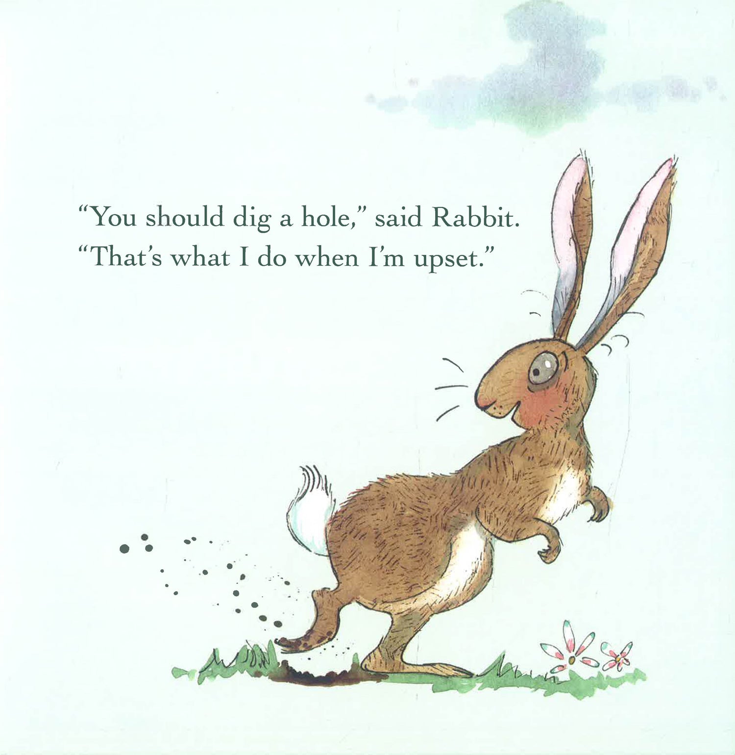 Tortoise is not having a good day and now he's stuck in a hole and is far too upset for hugs. Hedgehog sits and waits and then makes Tortoise laugh - taking the time to let the moment pass, and acknowledge how Tortoise feels.