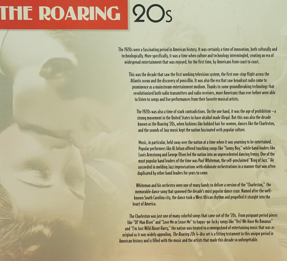 The Roaring 20's was a charismatic decade that produced groundbreaking technological innovations and colorful cultural expressions. Music was the soundtrack to this lively ecade with popular band leaders like Louis Armstrong and Paul Whiteman paving the way to the ance floor with spirite dance numbers like the "Charleston."