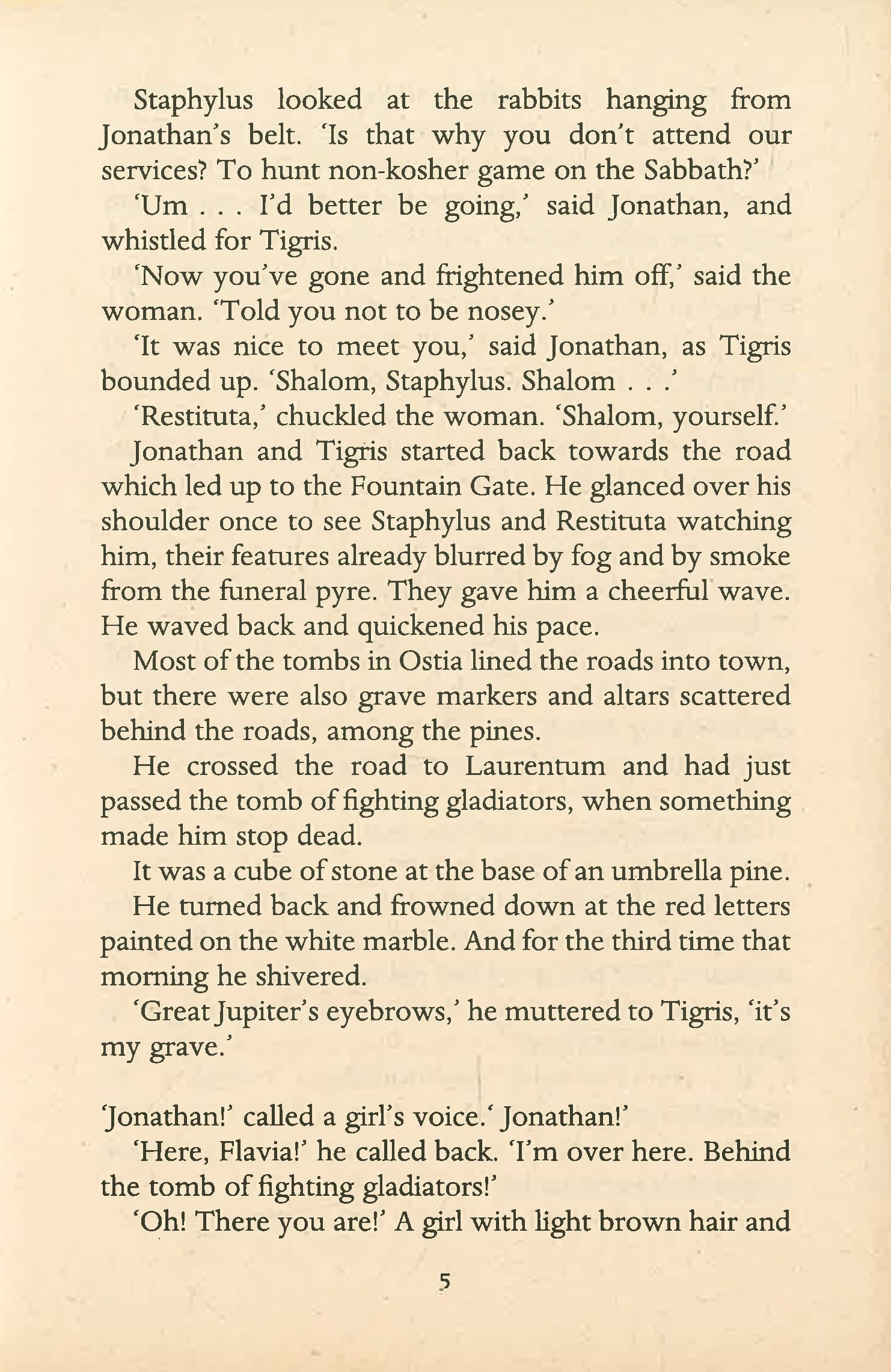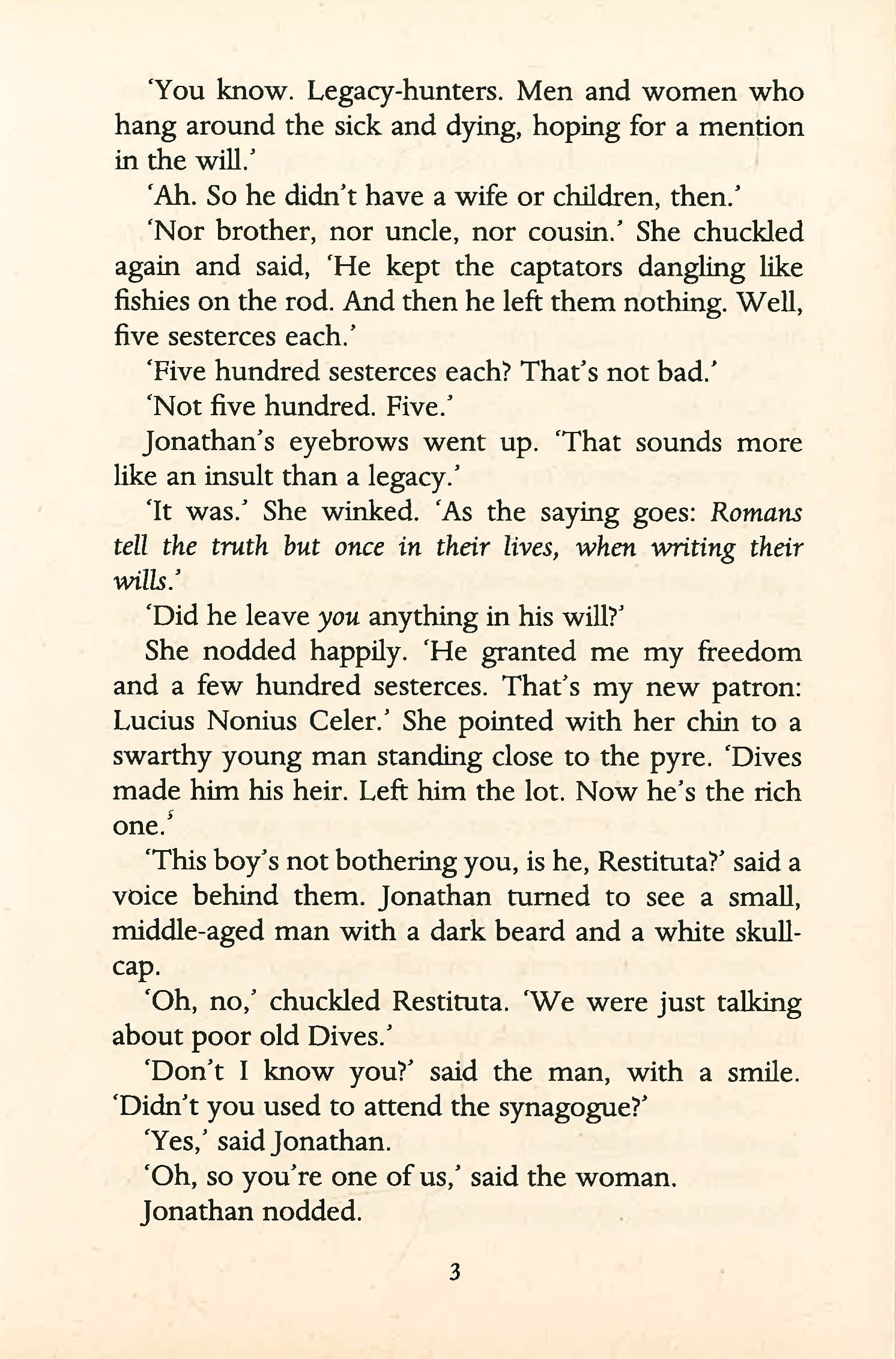 This exciting adventure recreates the siege of Masada, and reveals important developments in Jonathan's struggle with his guilt over past events. Also, there's terrific insight into the workings of the Roman legal system in a page-turning court room drama. As always, Caroline Lawrence springs new surprises for all the characters and provides motives, means and opportunities for one determined felon. And, as ever, it's up to the four young detectives to crack the case. And, for one of the popular characters, a tragic end awaits ...
