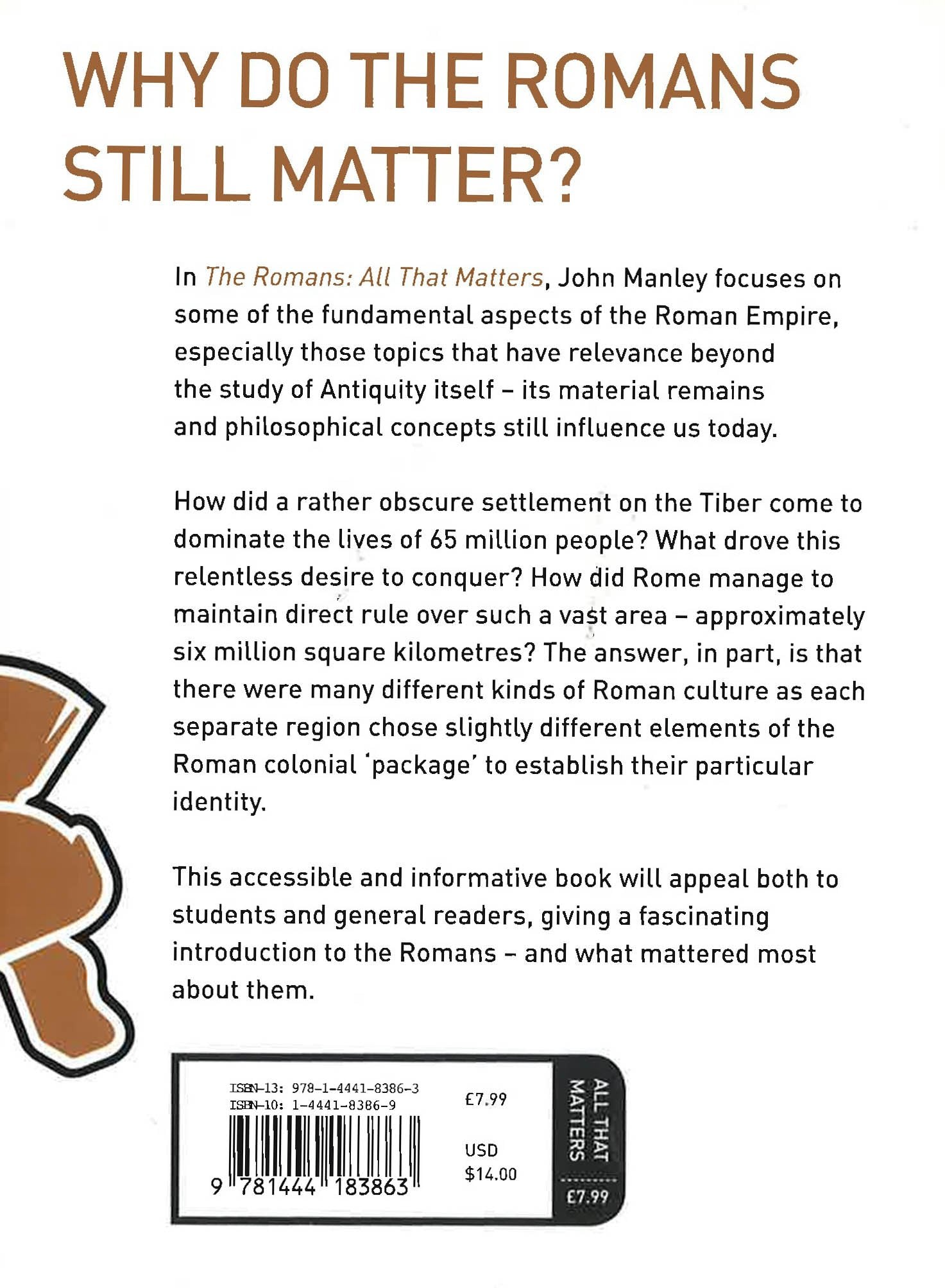 In The Romans: All That Matters, John Manley focuses on some of the fundamental aspects of the Roman Empire, especially those topics that have relevance beyond the study of Antiquity itself - how its material remains and philosophical concepts have survived and still influence us today. How did a rather obscure settlement spread over a few hills on the banks of the Tiber come to dominate the lives of 65 million people? What drove this relentless desire to conquer? How did Rome manage to maintain direct rule over such a vast area - from present-day Scotland to Syria - approximately 6 million square kilometres? The answer, in part, is that there were many different kinds of Roman culture, as each separate provincial elite, each region and each group of indigenous community leaders, chose slightly different elements of the Roman colonial 'package' to establish their particular identity. This accessible and readable book will appeal both to students and general readers, giving a fascinating introduction to the Romans - and what mattered most about them.
