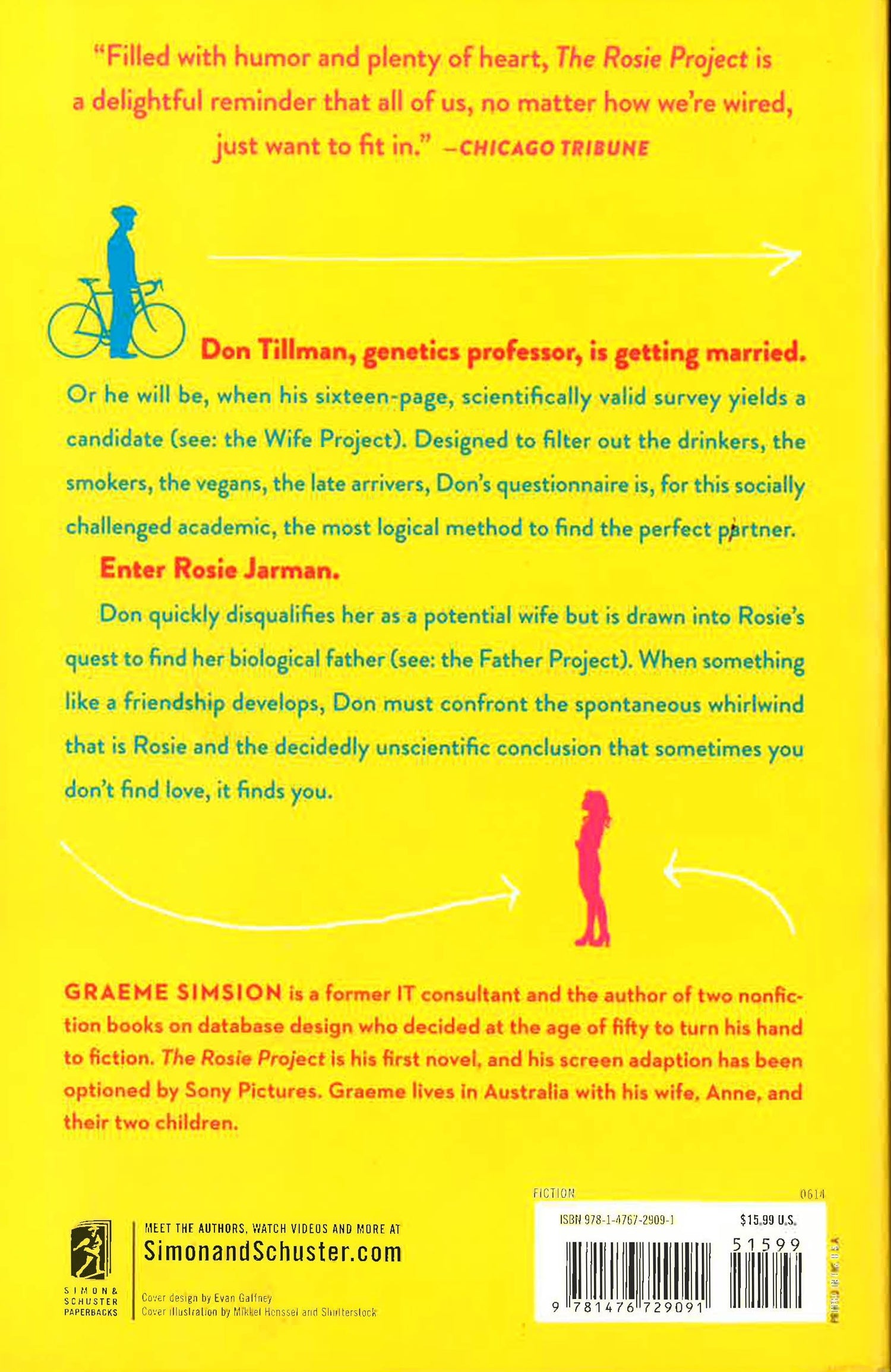 Now in paperback, the international bestselling romantic comedy "bursting with warmth, emotional depth, and...humor," (Entertainment Weekly) featuring the oddly charming, socially challenged genetics professor, Don, as he seeks true love. The art of love is never a science: Meet Don Tillman, a brilliant yet socially inept professor of genetics, who's decided it's time he found a wife. In the orderly, evidence-based manner with which Don approaches all things, he designs the Wife Project to find his perfect partner: a sixteen-page, scientifically valid survey to filter out the drinkers, the smokers, the late arrivers. Rosie Jarman possesses all these qualities. Don easily disqualifies her as a candidate for The Wife Project (even if she is "quite intelligent for a barmaid"). But Don is intrigued by Rosie's own quest to identify her biological father. When an unlikely relationship develops as they collaborate on The Father Project, Don is forced to confront the spontaneous whirlwind that is Rosieand the realization that, despite your best scientific efforts, you don't find love, it finds you. Arrestingly endearing and entirely unconventional, Graeme Simsion's distinctive debut "navigates the choppy waters of adult relationships, both romantic and platonic, with a fresh take (USA TODAY). "Filled with humor and plenty of heart, The Rosie Project is a delightful reminder that all of us, no matter how we're wired, just want to fit in" (Chicago Tribune).
