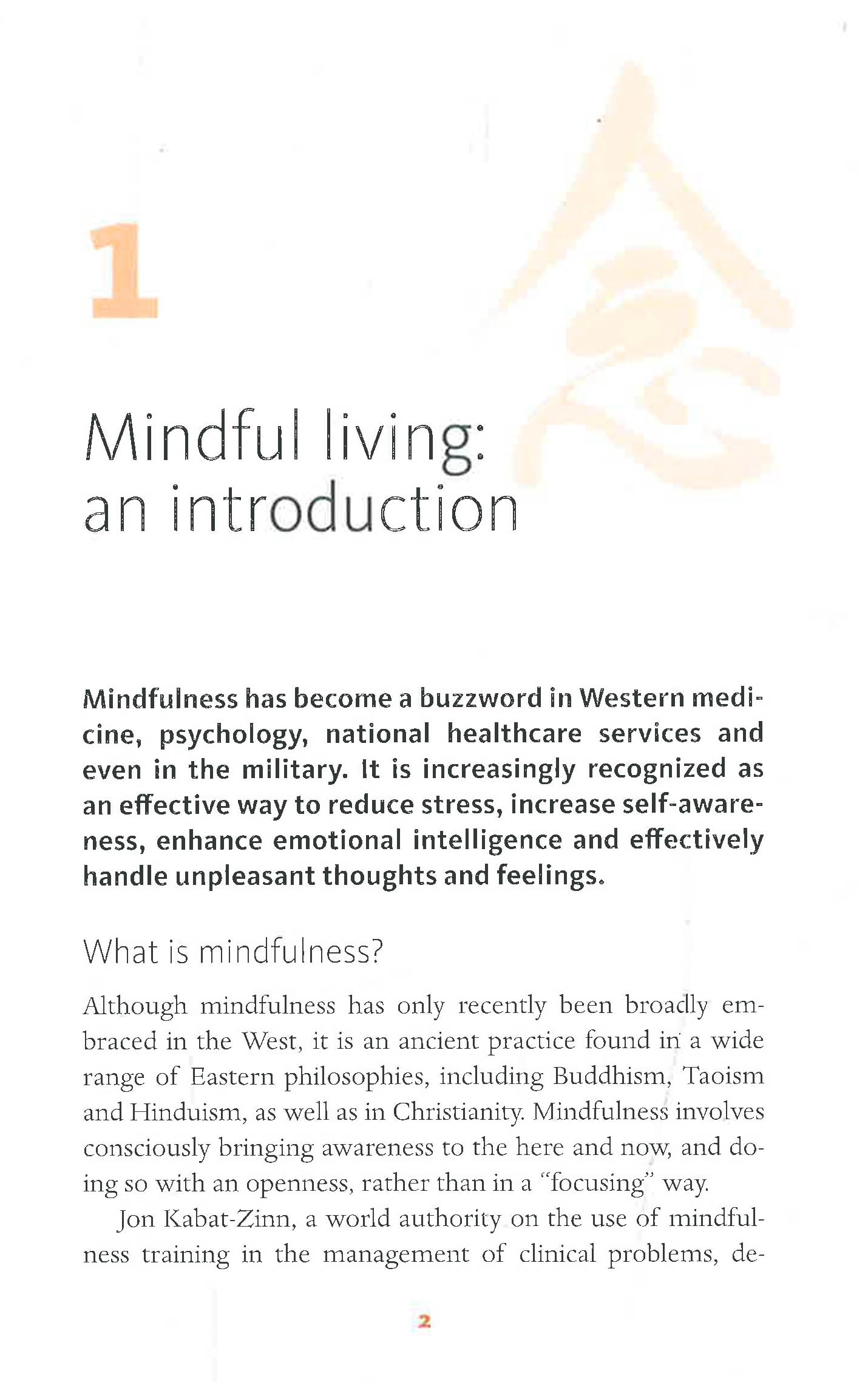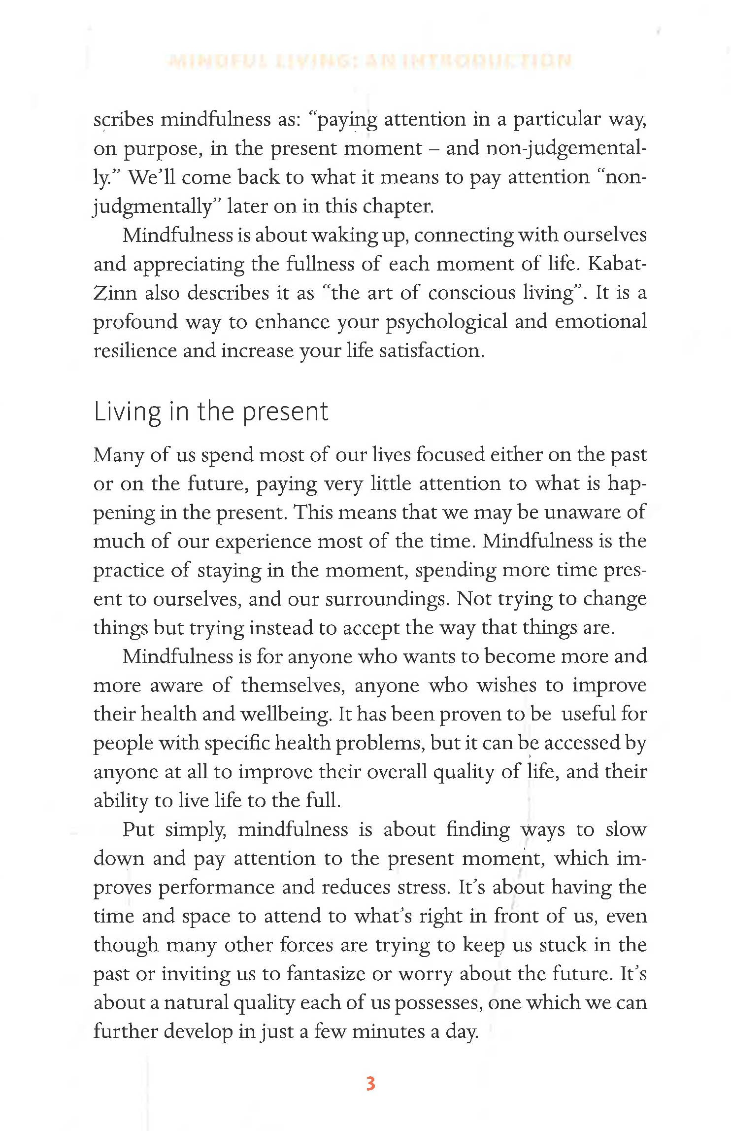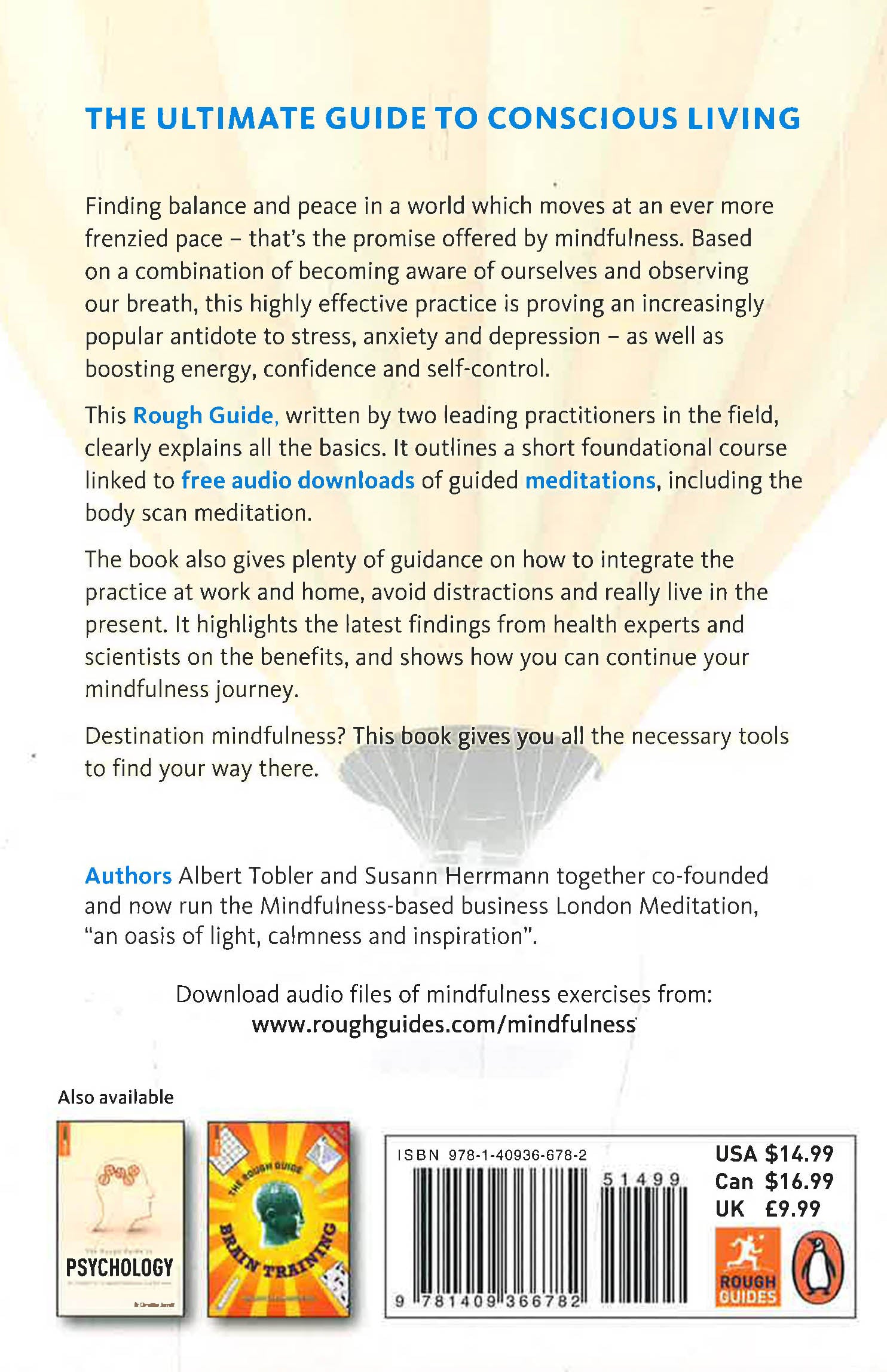 Written by two leading practitioners, this guide clearly explains all the basics of mindfulness from breathing techniques to self-awareness and meditation. It outlines a short foundational course linked to free audio downloads of guided meditations, including the Body Scan meditation. The book also gives plenty of guidance on how to integrate the practice at work and home, avoid distractions and really live in the present. It highlights the latest findings from health experts and scientists on the benefits, and shows how you can continue your mindfulness journey.