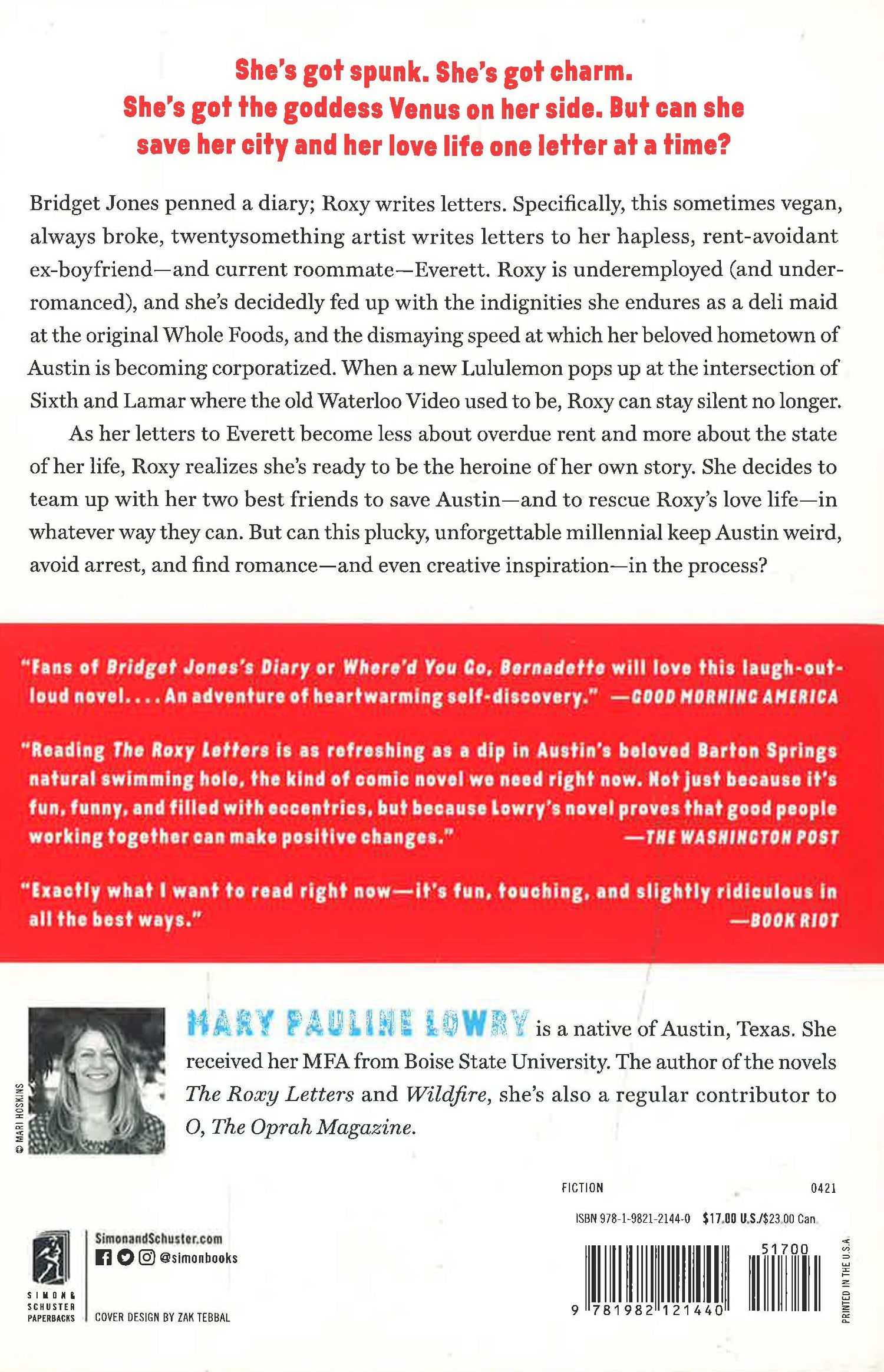 Meet Roxy. For fans of Where'd You Go, Bernadette and Bridget Jones's Diary comes "just the kind of comic novel we need right now" (The Washington Post) about an Austin artist trying to figure out her life one letter to her ex-boyfriend at a time.Bridget Jones penned a diary; Roxy writes letters. Specifically: she writes letters to her hapless, rent-avoidant ex-boyfriend-and current roommate-Everett. This charming and funny twenty-something is under-employed (and under-romanced), and she's decidedly fed up with the indignities she endures as a deli maid at Whole Foods (the original), and the dismaying speed at which her beloved Austin is becoming corporatized. When a new Lululemon pops up at the intersection of Sixth and Lamar where the old Waterloo Video used to be, Roxy can stay silent no longer. As her letters to Everett become less about overdue rent and more about the state of her life, Roxy realizes she's ready to be the heroine of her own story. She decides to team up with her two best friends to save Austin-and rescue Roxy's love life-in whatever way they can. But can this spunky, unforgettable millennial keep Austin weird, avoid arrest, and find romance-and even creative inspiration-in the process? With timely themes and hilarious, laugh-out-loud moments, Roxy Letters is a smart and clever story that is "bursting with originality, quirky wit, and delightful charm" (Hannah Orenstein, author of Playing with Matches).