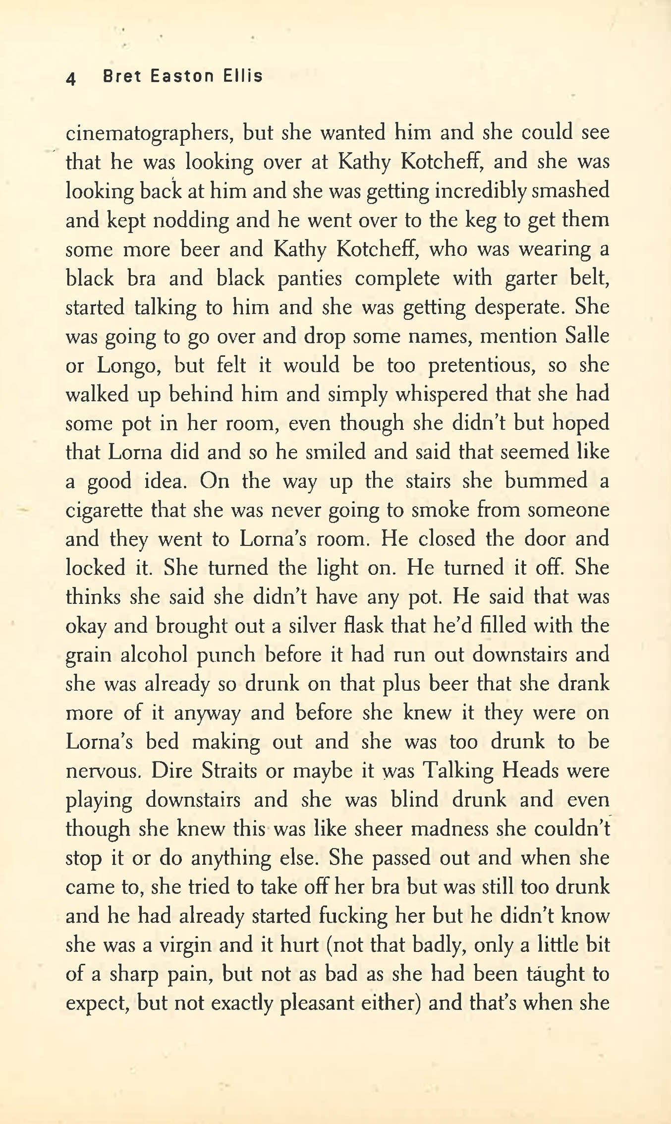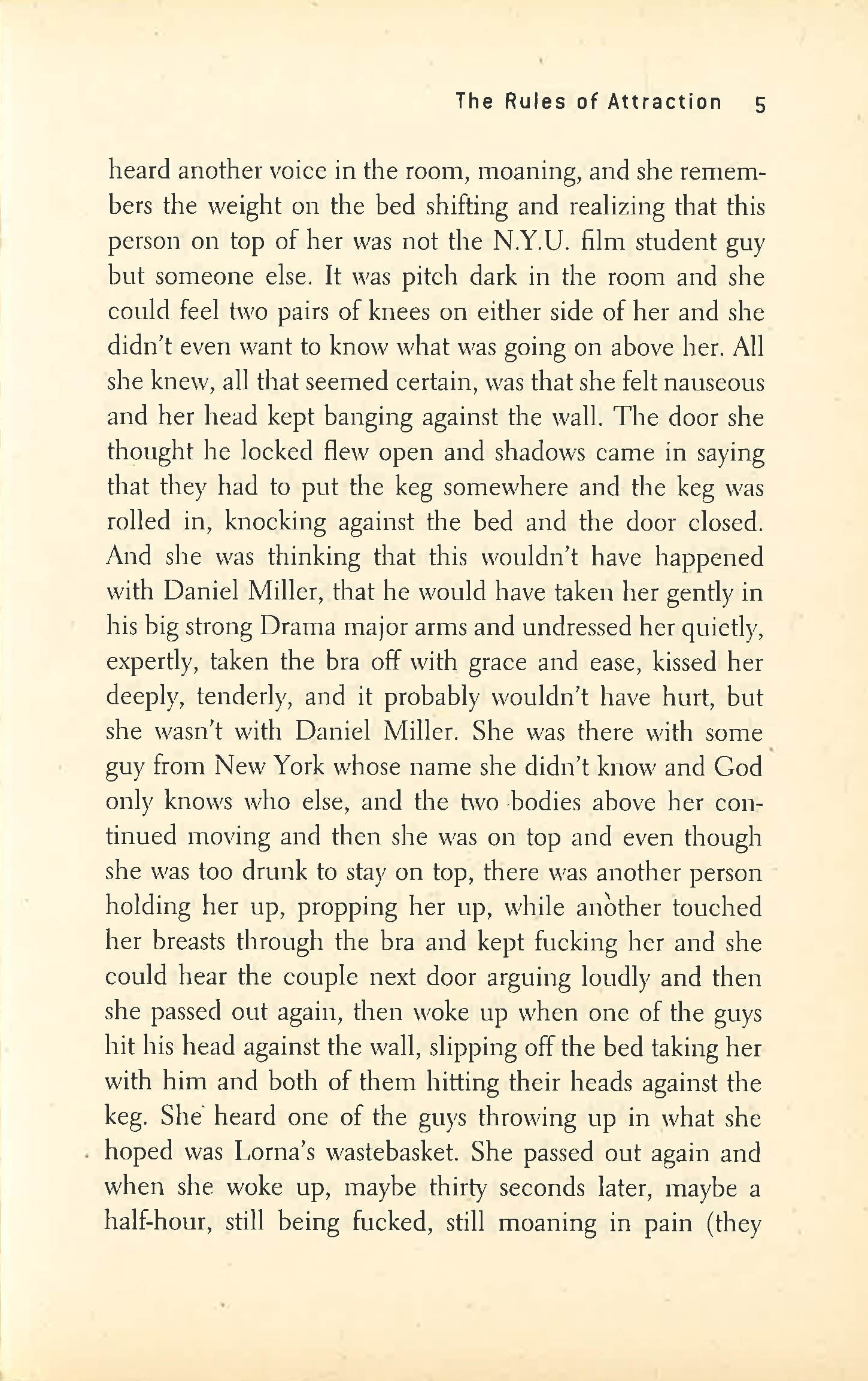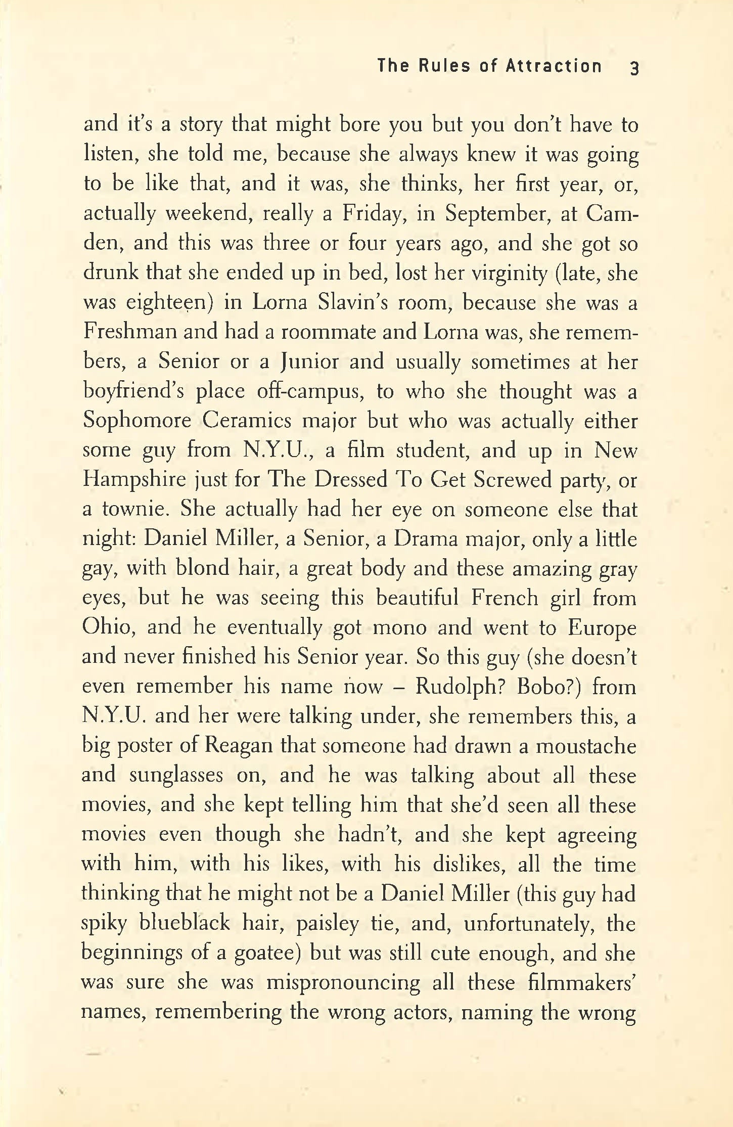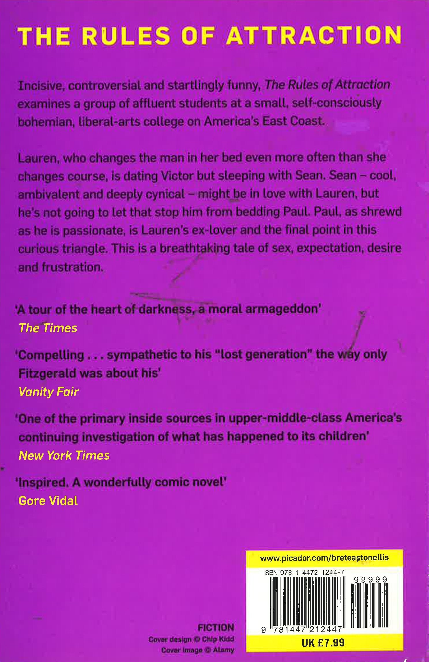 Set at a small, affluent liberal-arts college in New England at the height of the Reagan 80s, The Rules of Attraction is a startlingly funny, kaleidoscopic novel about three students with no plans for the future - or even the present - who become entangled in a curious romantic triangle. Bret Easton Ellis trains his incisive gaze on the kids at self-consciously bohemian Camden College and treats their sexual posturings and agonies with a mixture of acrid hilarity and compassion while exposing the moral vacuum at the centre of their lives. Lauren changes boyfriends every time she changes majors and still pines for Victor who split for Europe months ago and she might or might not be writing anonymous love letter to ambivalent, hard-drinking Sean, a hopeless romantic who only has eyes for Lauren, even if he ends up in bed with half the campus, and Paul, Lauren's ex, forthrightly bisexual and whose passion masks a shrewd pragmatism.They waste time getting wasted, race from Thirsty Thursday Happy Hours to Dressed To Get Screwed parties to drinks at The Edge of the World or The Graveyard. The Rules of Attraction is a poignant, hilarious take on the death of romance.