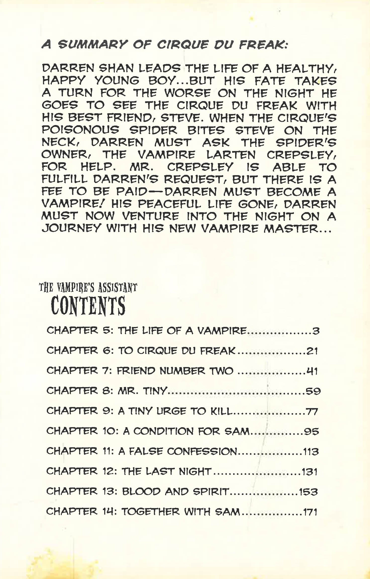 Darren begins to enjoy his life among the Cirque performers and starts coming to terms with his half-vampire existence. But he defiantly refuses to drink human blood and tries desperately to cling on to the part of him which is still human.