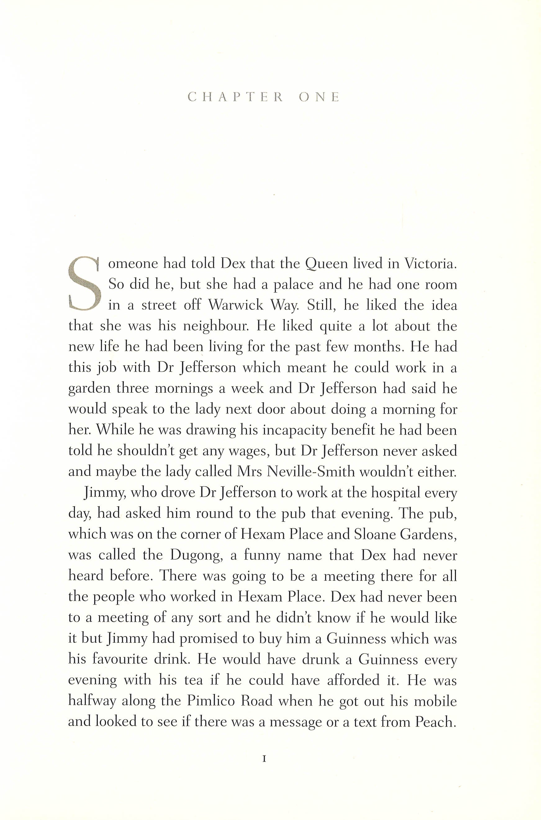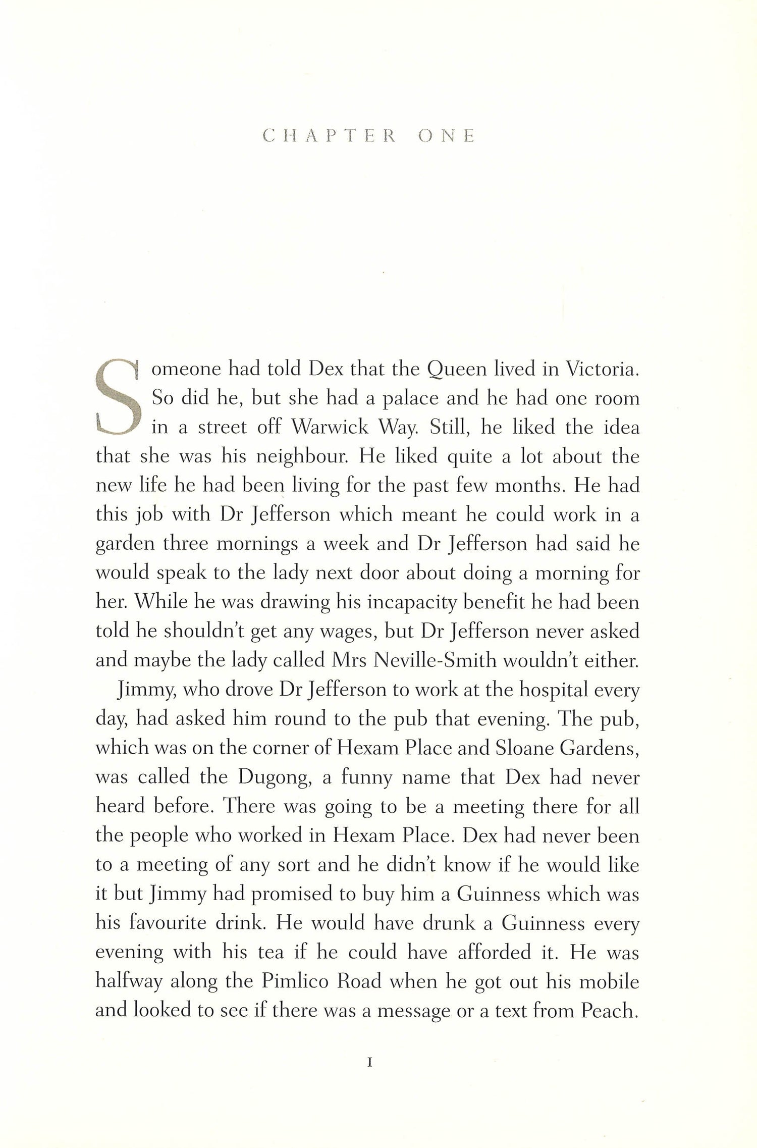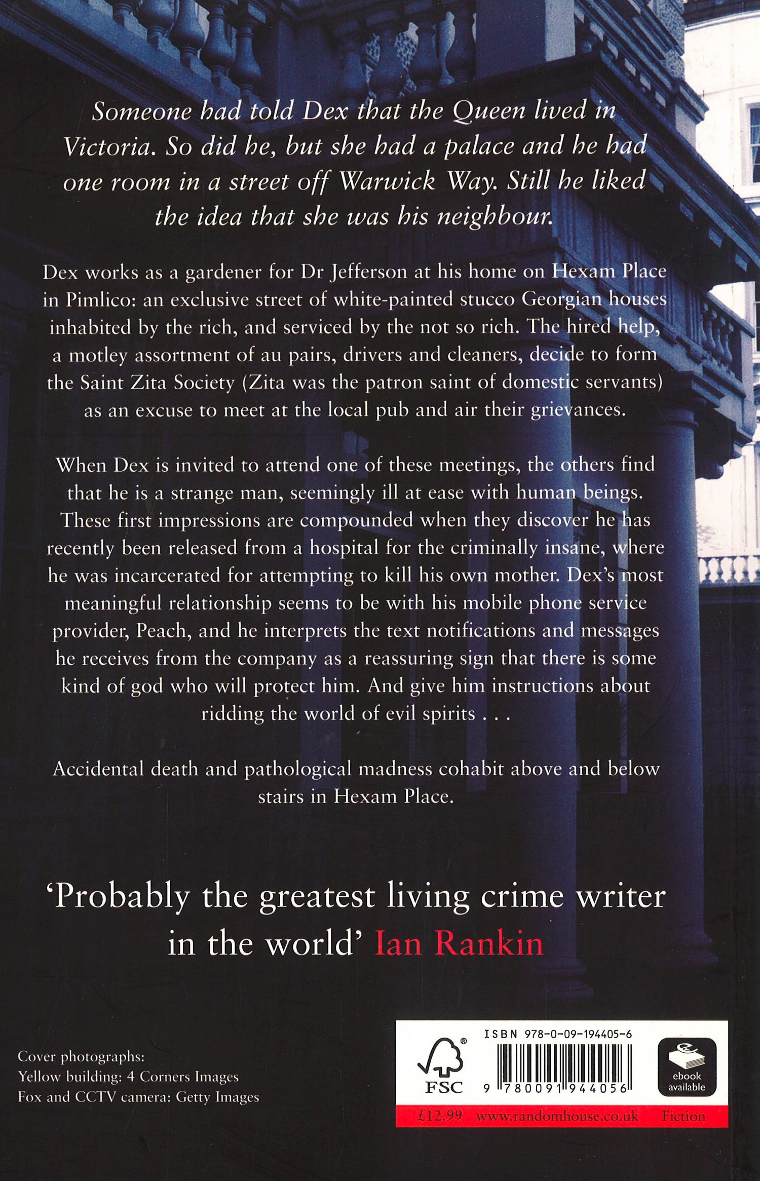 Someone had told Dex that the Queen lived in Victoria. So did he, but she had a palace and he had one room in a street off Warwick Way. Still he liked the idea that she was his neighbour'. Dex works as a gardener for Dr Jefferson at his home on Hexam Place in Pimlico: an exclusive street of white-painted stucco Georgian houses inhabited by the rich, and serviced by the not so rich. The hired help, a motley assortment of au pairs, drivers and cleaners, decide to form the St Zita Society (Zita was the patron saint of domestic servants) as an excuse to meet at the local pub and air their grievances. When Dex is invited to attend one of these meetings, the others find that he is a strange man, seemingly ill at ease with human beings. These first impressions are compounded when they discover he has recently been released from a hospital for the criminally insane, where he was incarcerated for attempting to kill his own mother. Dex's most meaningful relationship seems to be with his mobile phone service provider, Peach, and he interprets the text notifications and messages he receives from the company as a reassuring sign that there is some kind of god who will protect him. And give him instructions about ridding the world of evil spirits...Accidental death and pathological madness cohabit above and below stairs in Hexam Place.