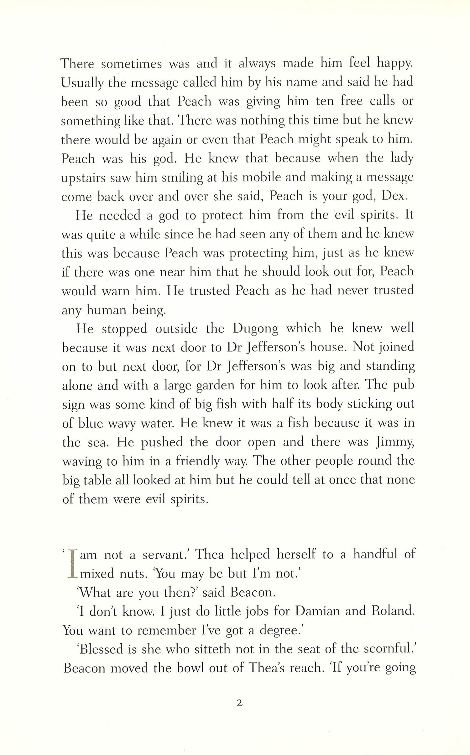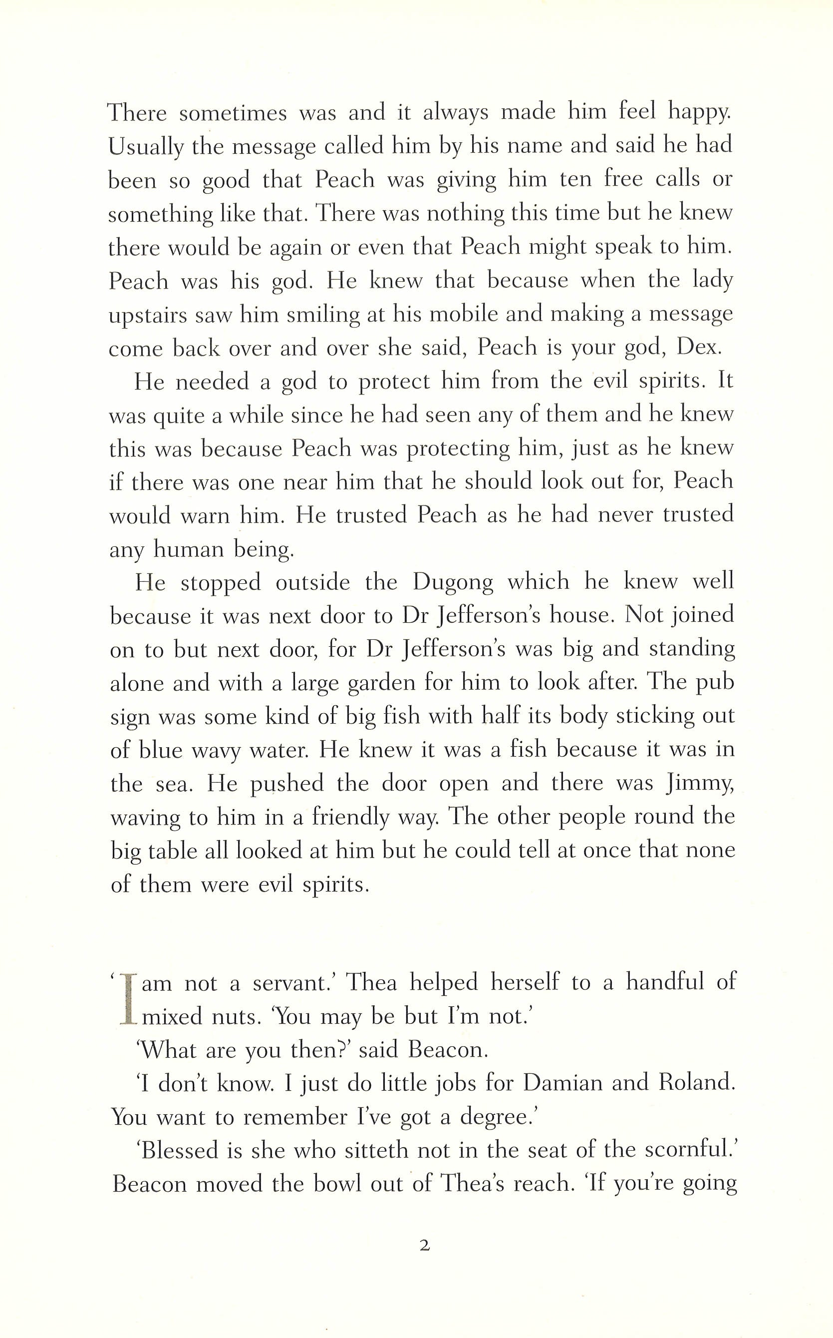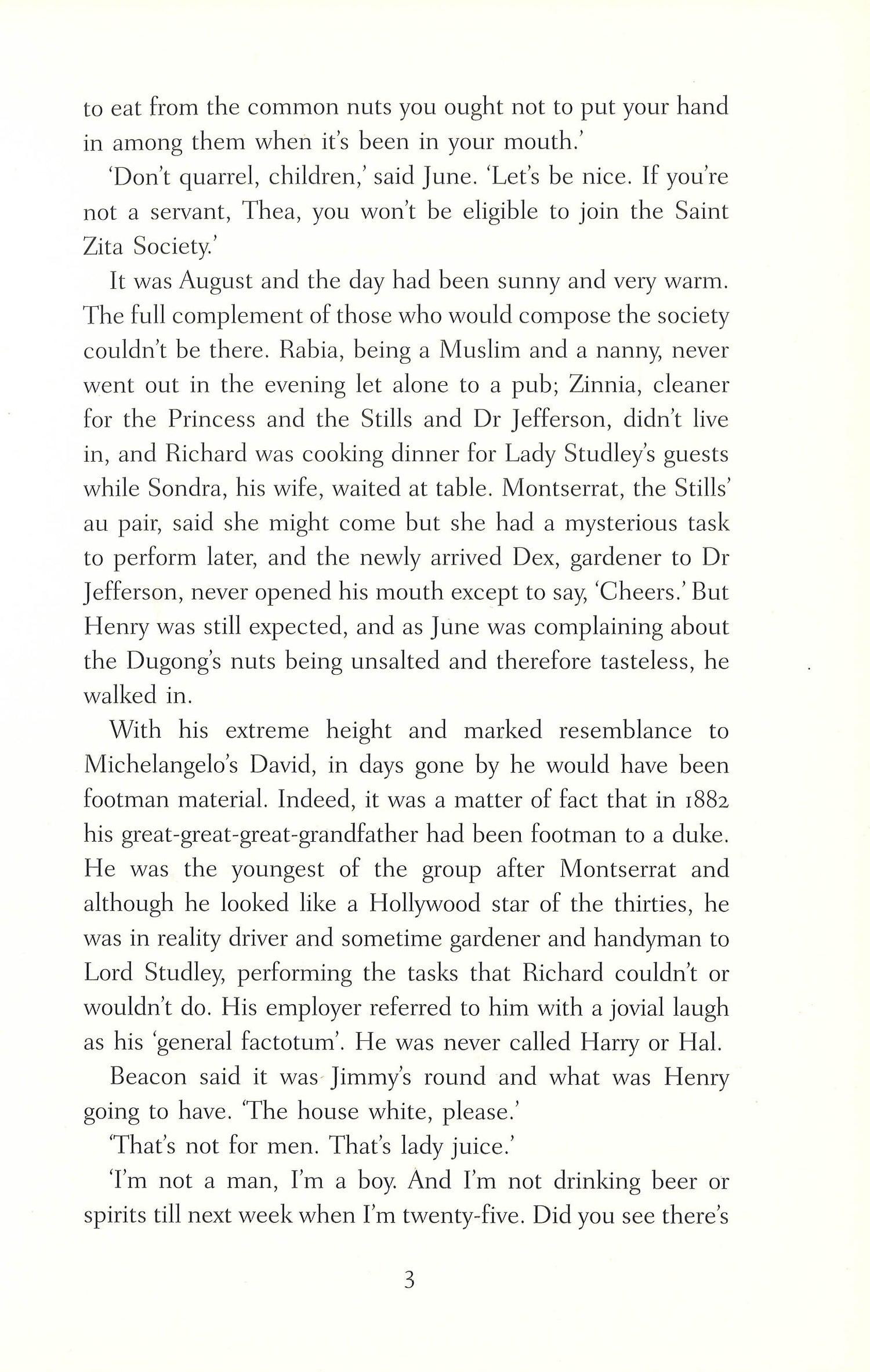 Someone had told Dex that the Queen lived in Victoria. So did he, but she had a palace and he had one room in a street off Warwick Way. Still he liked the idea that she was his neighbour'. Dex works as a gardener for Dr Jefferson at his home on Hexam Place in Pimlico: an exclusive street of white-painted stucco Georgian houses inhabited by the rich, and serviced by the not so rich. The hired help, a motley assortment of au pairs, drivers and cleaners, decide to form the St Zita Society (Zita was the patron saint of domestic servants) as an excuse to meet at the local pub and air their grievances. When Dex is invited to attend one of these meetings, the others find that he is a strange man, seemingly ill at ease with human beings. These first impressions are compounded when they discover he has recently been released from a hospital for the criminally insane, where he was incarcerated for attempting to kill his own mother. Dex's most meaningful relationship seems to be with his mobile phone service provider, Peach, and he interprets the text notifications and messages he receives from the company as a reassuring sign that there is some kind of god who will protect him. And give him instructions about ridding the world of evil spirits...Accidental death and pathological madness cohabit above and below stairs in Hexam Place.