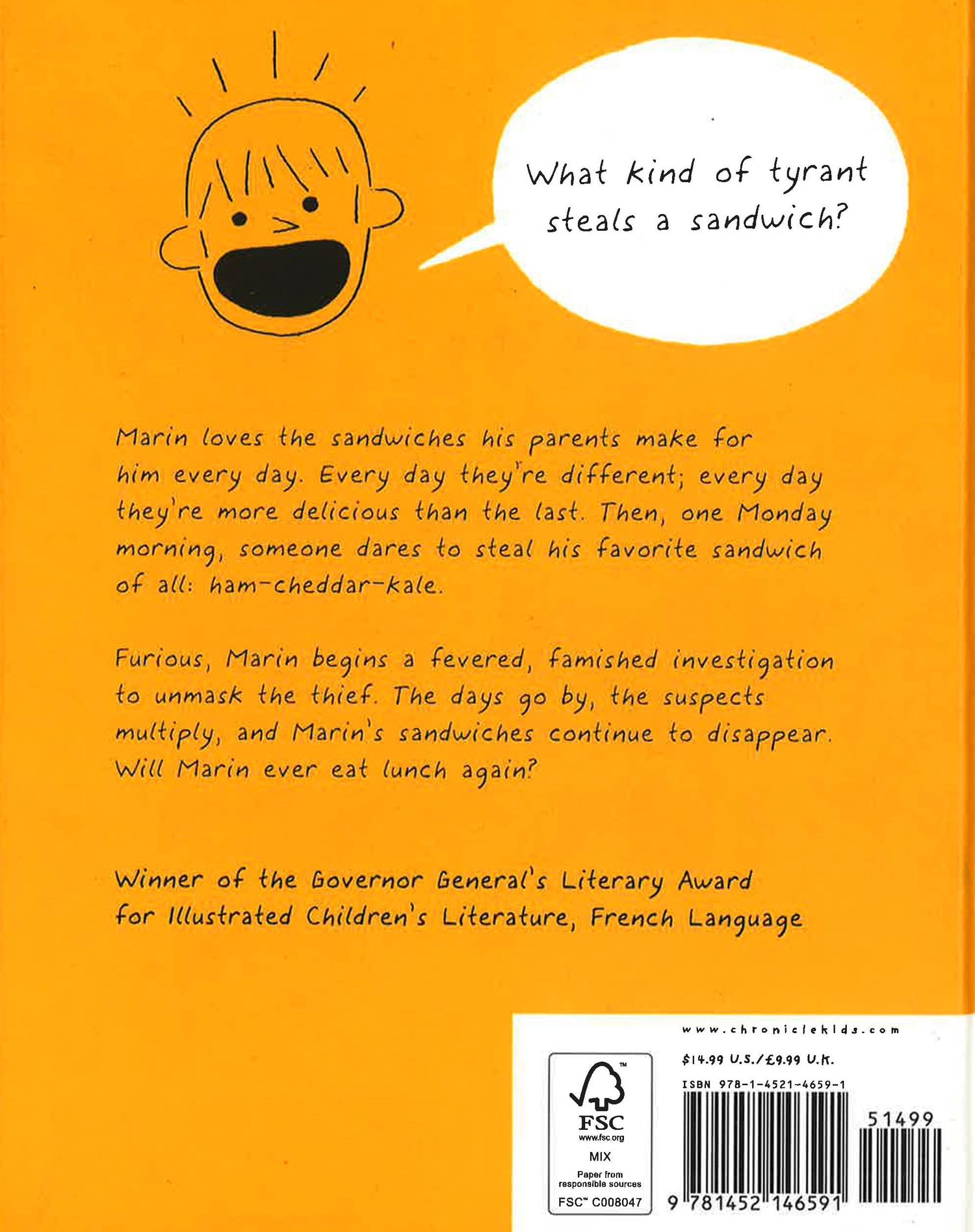 Marin loves the sandwiches his parents make for him - every day they're different and more delicious than the last. One morning, someone dares to steal his favorite sandwich: ham-cheddar-kale. Furious, Marin begins a fevered and famished investigation to unmask the thief. The days go by, the suspects multiply, and Marin's sandwiches continue to disappear. This droll, graphic caper is a funny school mystery exploring the high stakes of low blood sugar. The first in a series, the book's witty text and graphic illustrations make this funny school mystery perfect for early and advanced readers alike - and for anyone who's been the victim of lunchtime crime.
