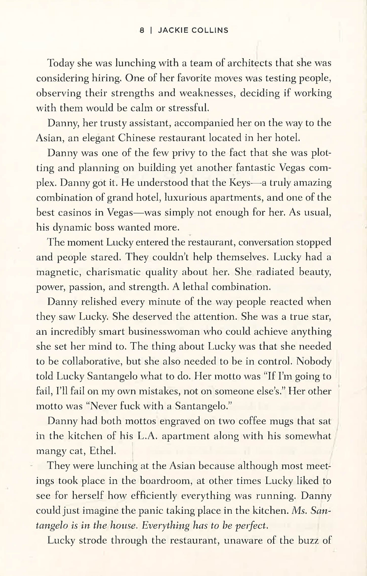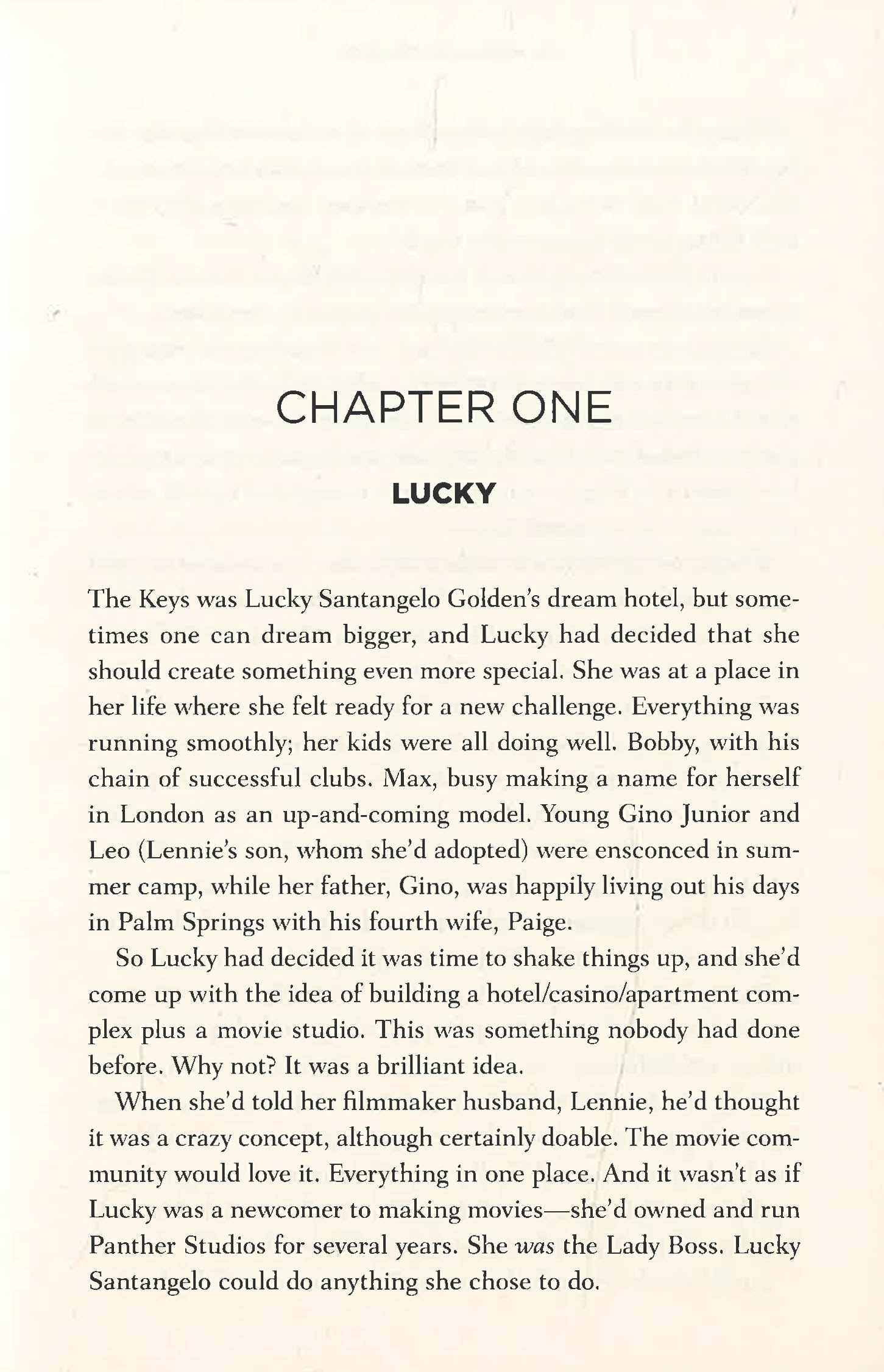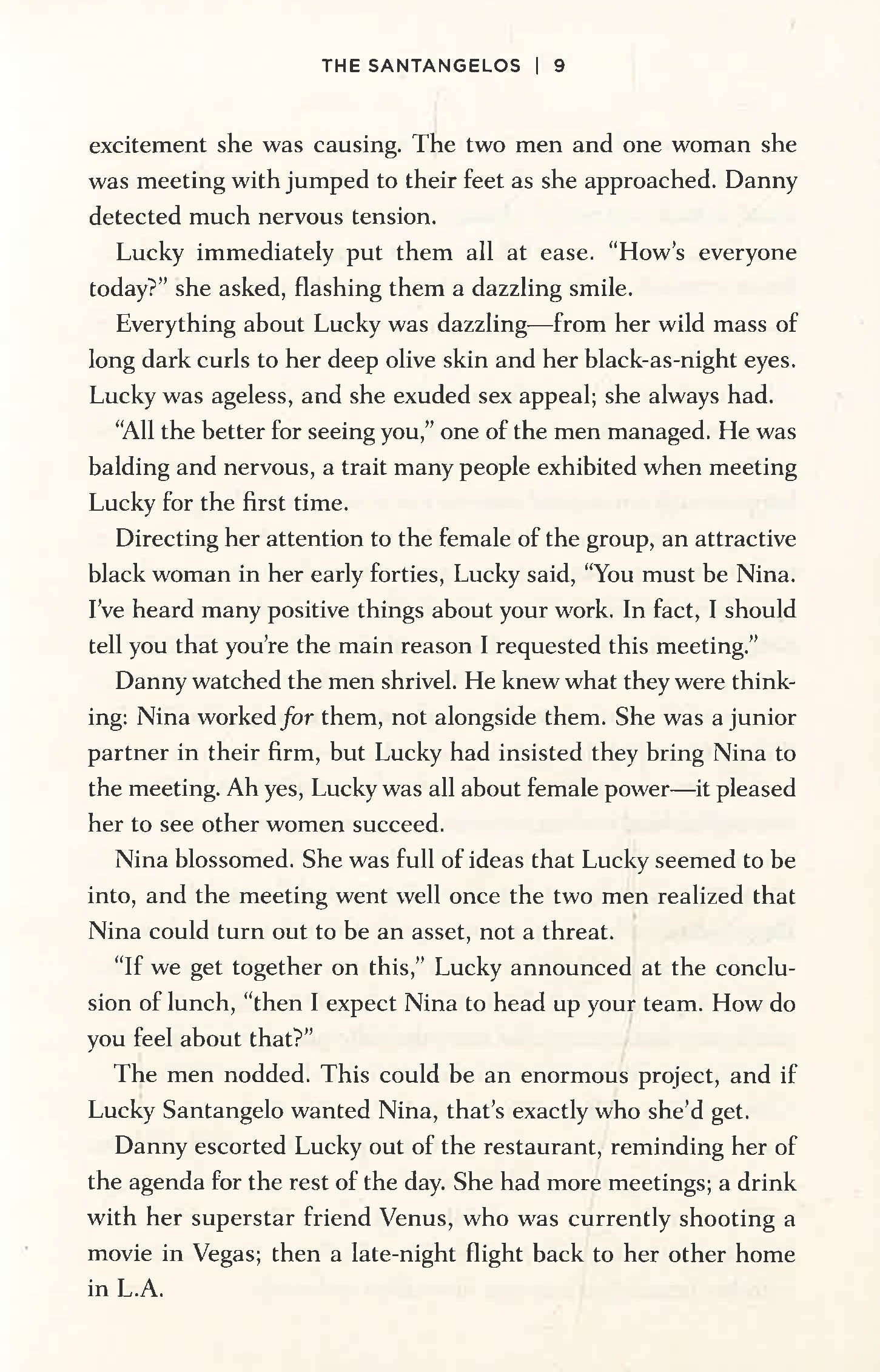 A vicious hit, a vengeful enemy, a drug addled Colombian club owner and a sex crazed Italian family... the ever powerful Lucky Santangelo has to deal with them all. Meanwhile Max - her teenage daughter - is becoming the"It" girl in Europe's modeling world. And her Kennedyesque son, Bobby, is being set up for a murder he didn't commit. But Lucky can deal. Always strong and unpredictable, with her husband Lennie by her side, she lives up to the family motto - Never fuck with a Santangelo. Lucky rules ... the Santangelos alwayscome out on top. The Santangelosis an epic family saga filled with love, lust, revenge and passion.