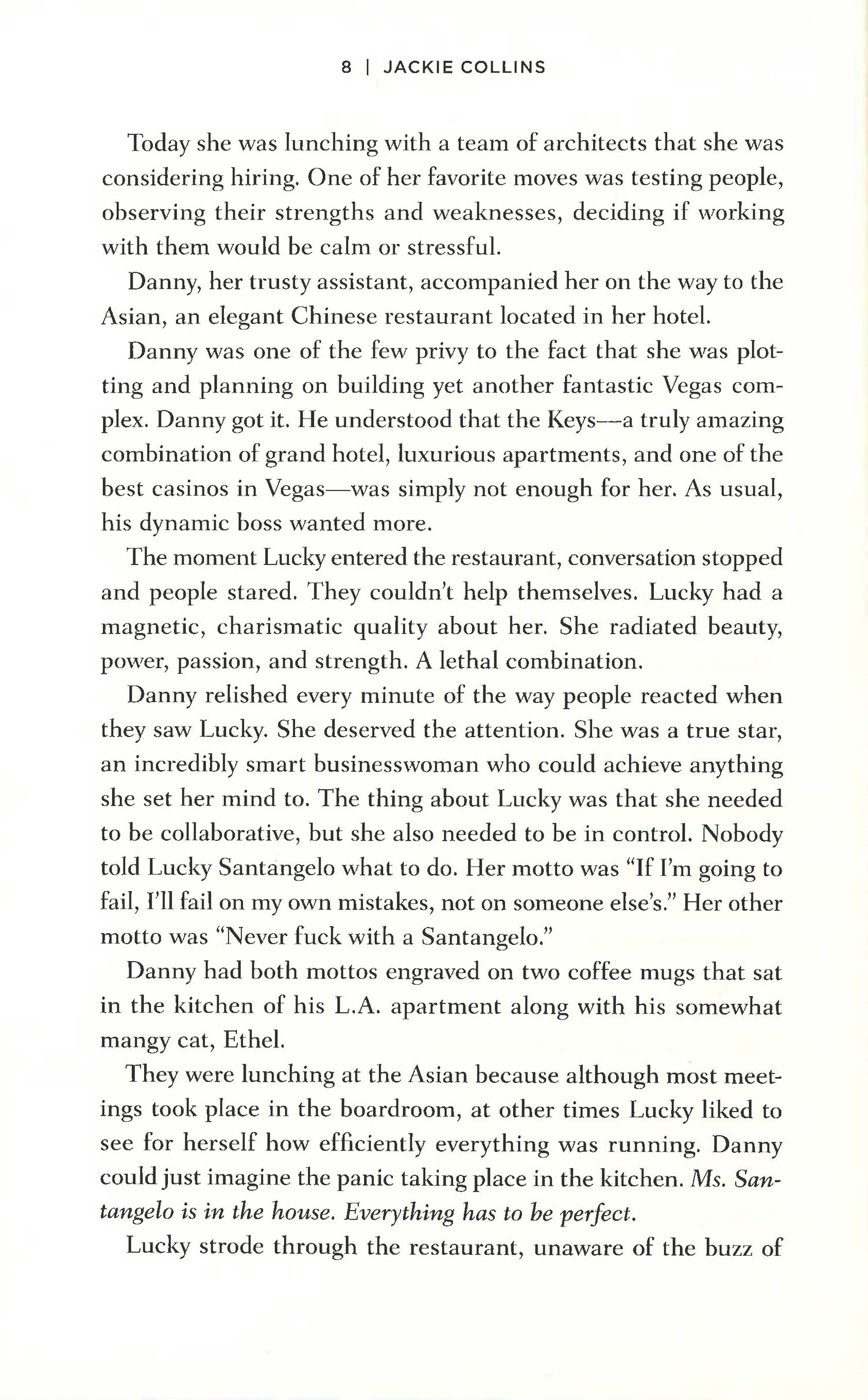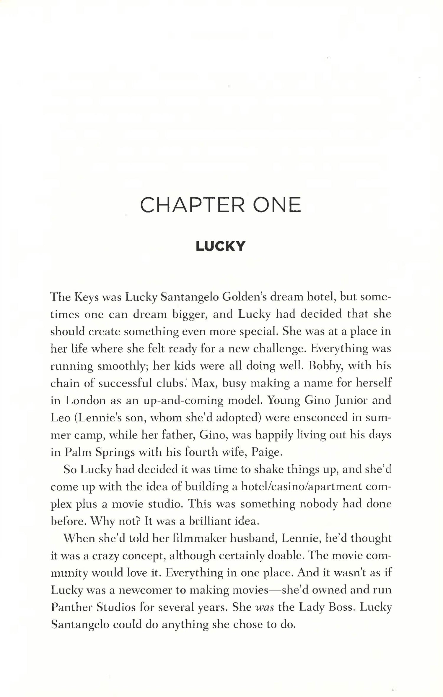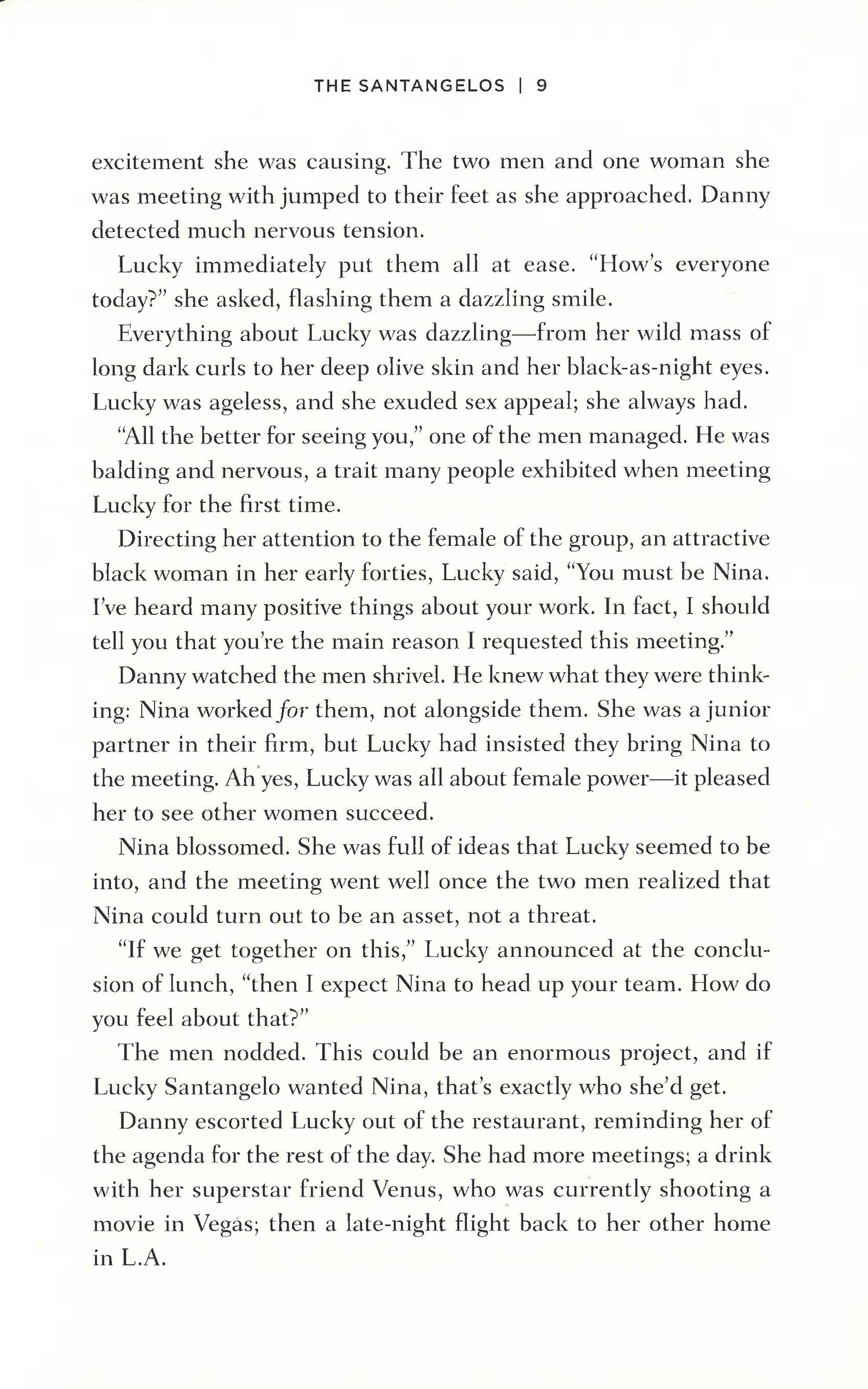A vicious hit, a vengeful enemy, a drug addled Colombian club owner and a sex crazed Italian family... the ever powerful Lucky Santangelo has to deal with them all. Meanwhile Max - her teenage daughter - is becoming the "It" girl in Europe's modelling world. And her Kennedyesque son, Bobby, is being set up for a murder he didn't commit. But Lucky can deal. Always strong and unpredictable, with her husband Lennie by her side, she lives up to the family motto - Never fuck with a Santangelo. Lucky rules ... the Santangelos always come out on top. The Santangelo is an epic family saga filled with love, lust, revenge and passion.