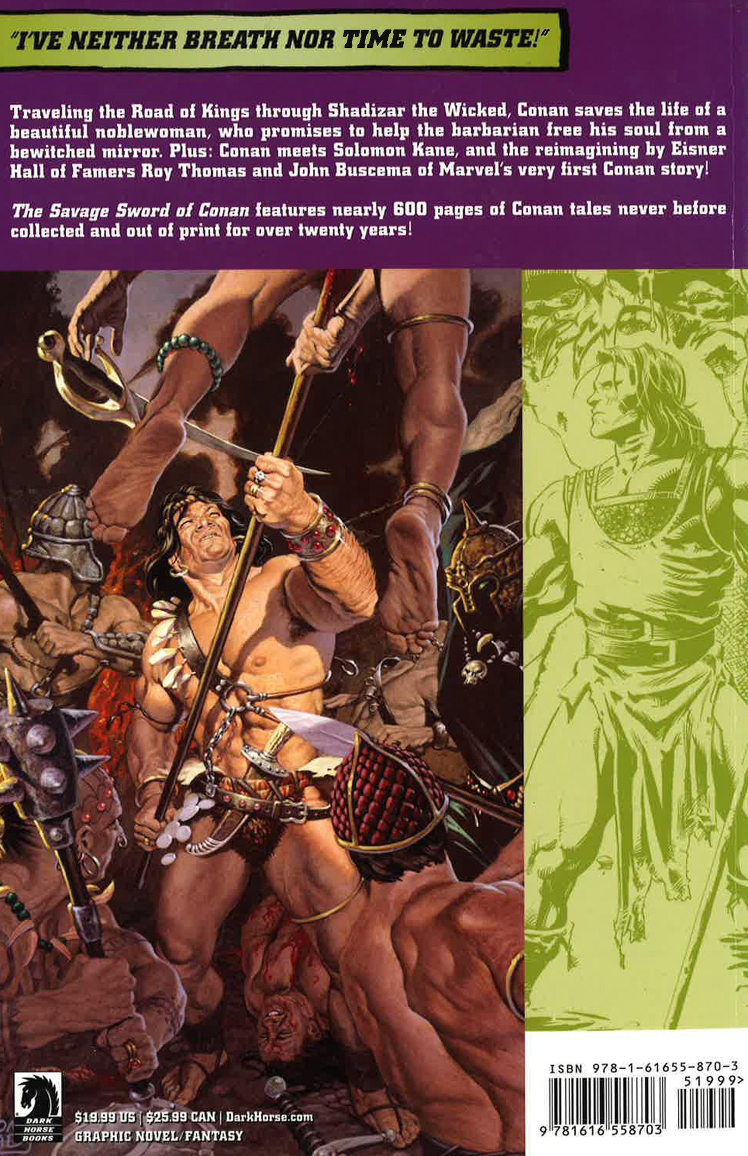 Traveling the Road of Kings through Shadizar the Wicked, Conan saves the life of a beautiful noblewoman, who promises to help the barbarian free his soul from a bewitched mirror. Plus: Conan meets Solomon Kane, and the reimagining by Eisner Hall of Famers Roy Thomas and John Buscema of Marvel's very first Conan story! The Savage Sword of Conan features over 500 pages of Conan tales never-before collected and out of print for over twenty years! Collects Conan stories from Marvel's The Savage Sword of Conan the Barbarian #213-223. *This book may have remainder mark and minor shelfwear*