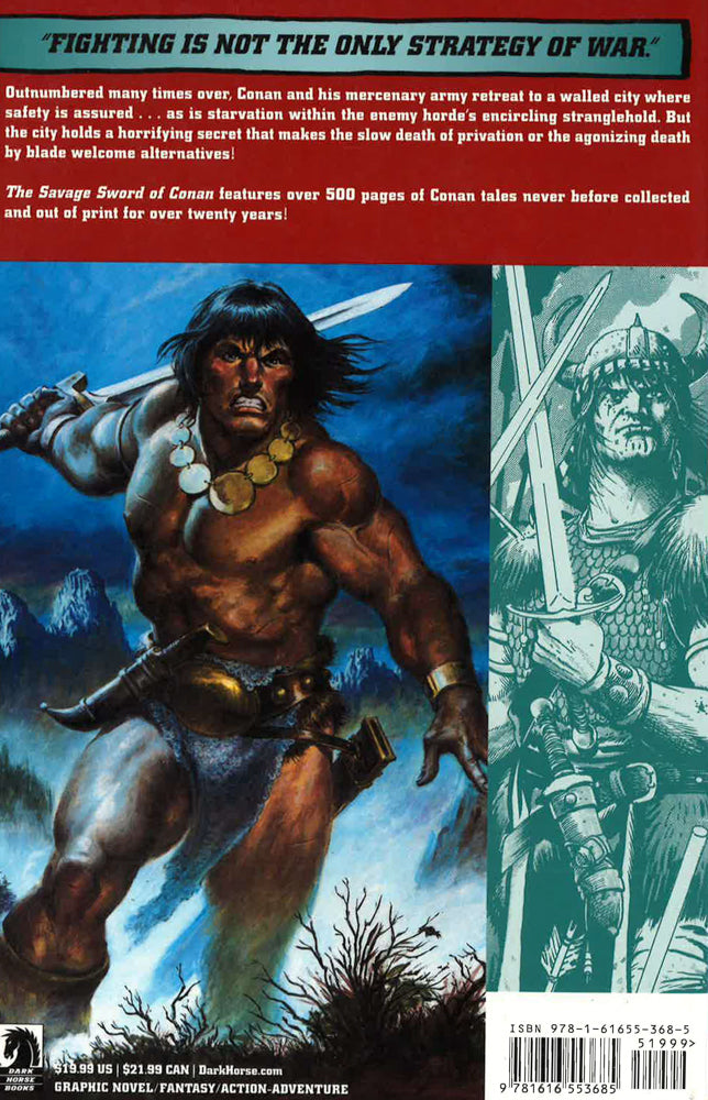 Fighting is not the only strategy of war." Outnumbered many times over, Conan and his mercenary army retreat to a walled city where safety is assured . . . as is starvation within the enemy horde's encircling stranglehold. But the city holds a horrifying secret that makes the slow death of privation or the agonizing death by blade welcome alternatives! The Savage Sword of Conan features over 500 pages of Conan tales never-before collected and out of print for over twenty years!