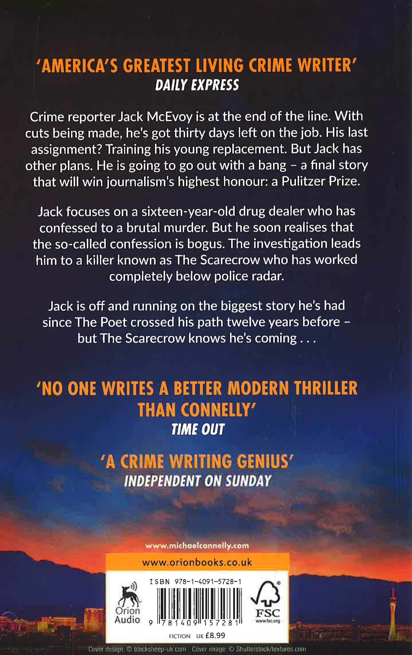 A standalone crime thriller featuring Jack McEvoy, hero of The Poet, from the global bestselling author of THE LINCOLN LAWYER and BRASS VERDICT.Jack McEvoy is at the end of the line as a crime reporter. Forced to take a buy-out from the Los Angeles Times, he's got 30 days left on the job. His last assignment? Training his replacement, a low-cost reporter just out of J-school. But Jack has other plans for his exit. He is going to go out with a bang: a final story that will win the newspaper journalism's highest honour - a Pulitzer Prize.Jack focuses on Alonzo Winslow, a sixteen-year-old drug dealer from the projects who has confessed to police that he brutally raped and strangled one of his crack clients. But as Jack delves into the story he soon realises that Alonzo's so-called confession is bogus. The investigation leads him to a serial killer known as The Scarecrow, who has worked completely below the police and FBI radar.Jack is soon off on the crime beat and running on the biggest story he's had since The Poet crossed his path twelve years before - but The Scarecrow knows he's coming . . .