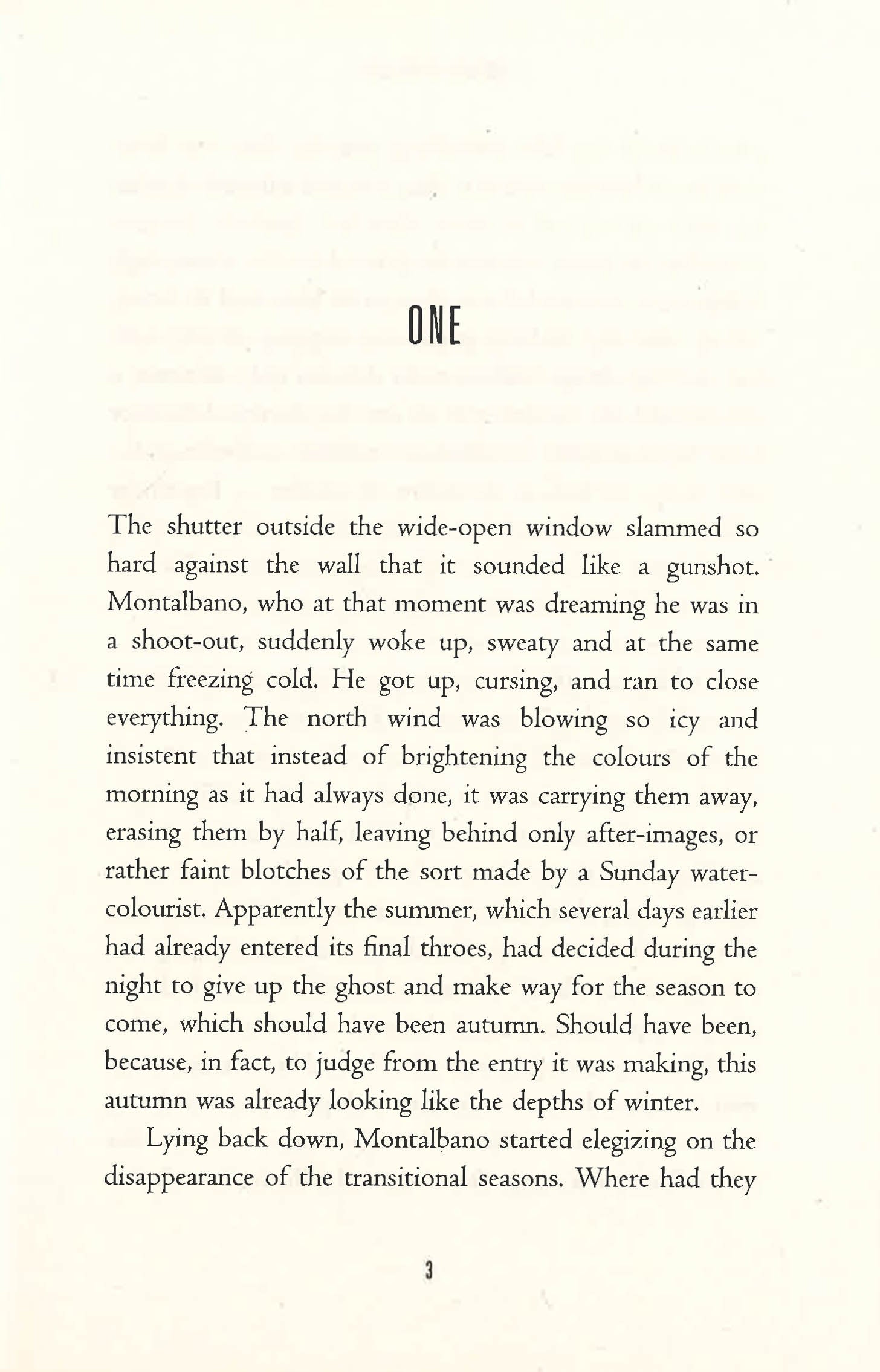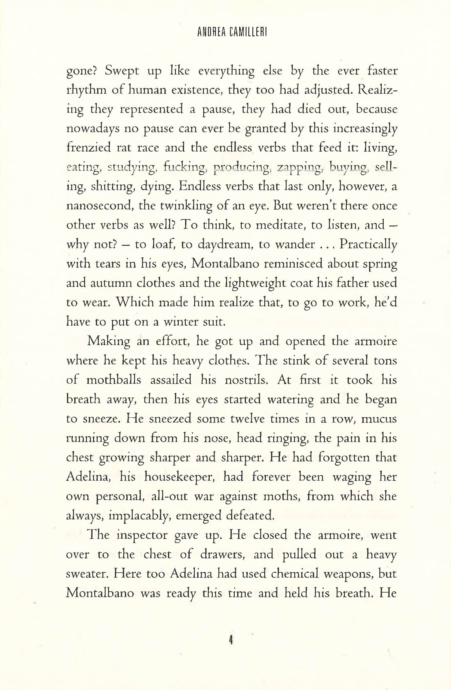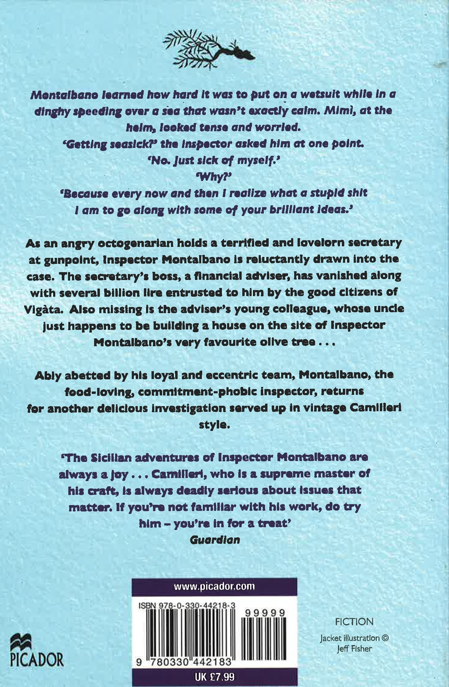 When an angry octogenarian holds a terrified and lovelorn secretary at gunpoint, Inspector Montalbano is reluctantly drawn into the case. The secretary's boss, a financial advisor, has vanished along with several billion lire entrusted to him by the good citizens of Vigata. Also missing is the advisor's young colleague, whose uncle just happens to be building a house on the site of Inspector Montalbano's very favourite olive tree . . .