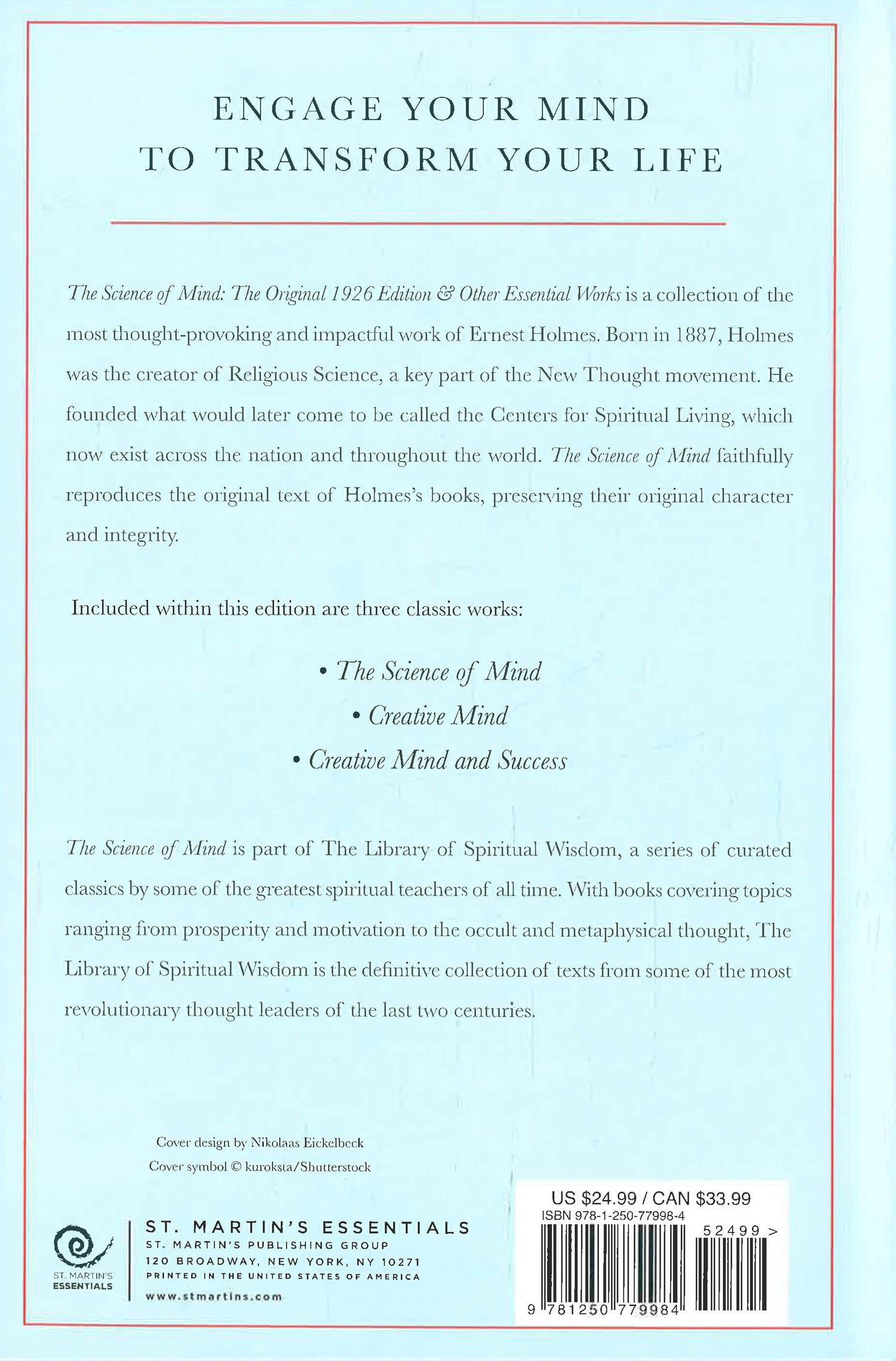The Science of The Mind: The Original 1926 Edition & Other Essential Works is a collection of the most thought-provoking and impactful work of Ernest Holmes. Born in 1887, Holmes was the founder of Religious Science, a key part of the New Thought movement. He founded what would later come to be called the Centers for Spiritual Living which now exist across the nation and throughout the world. The Science of Mind faithfully reproduces the original text of Holmes’s books, preserving their original character and integrity. Included within this edition are three classic works: The Science of Mind, The Creative Mind, and The Creative Mind and Success.