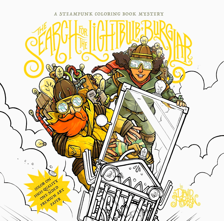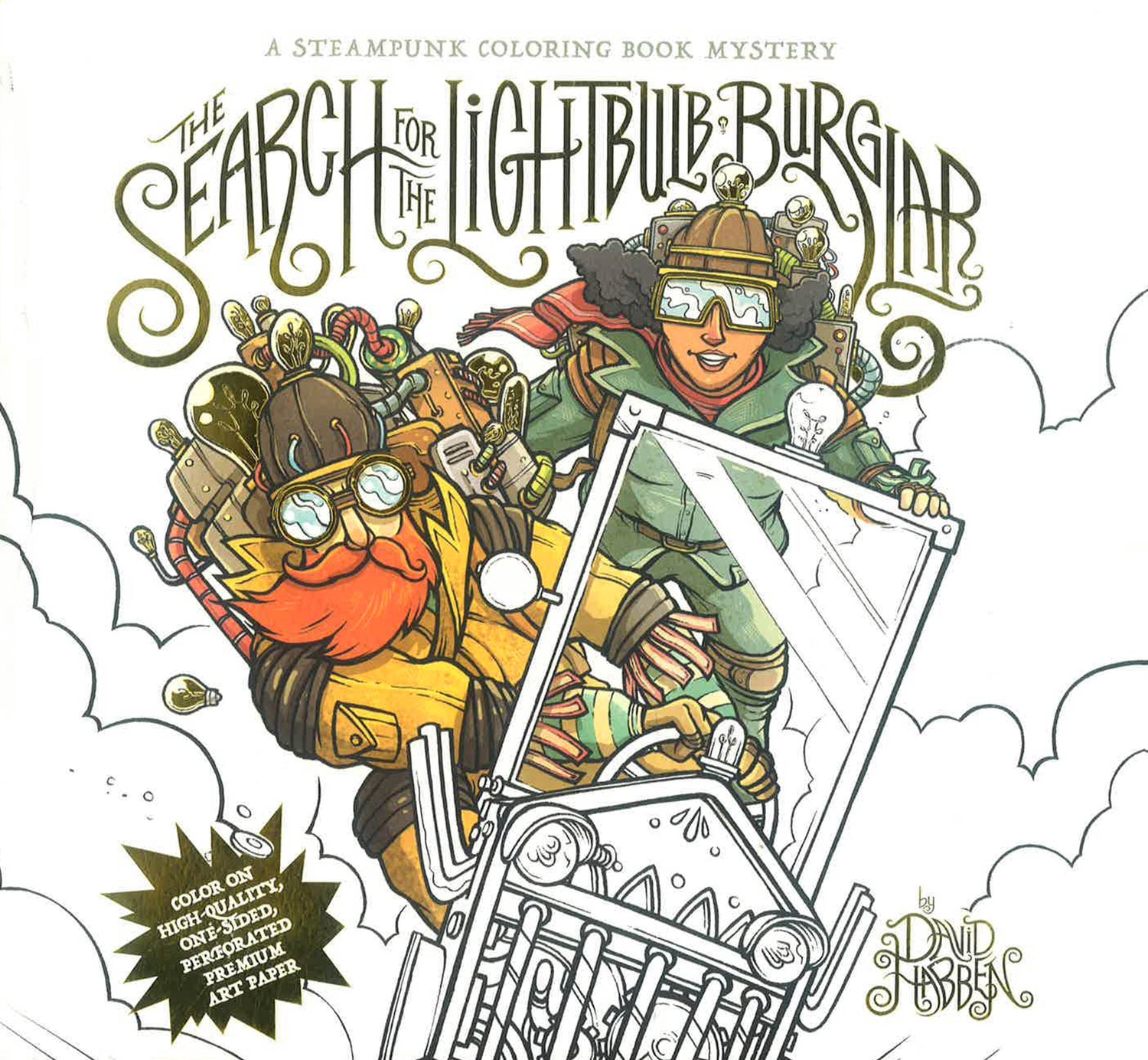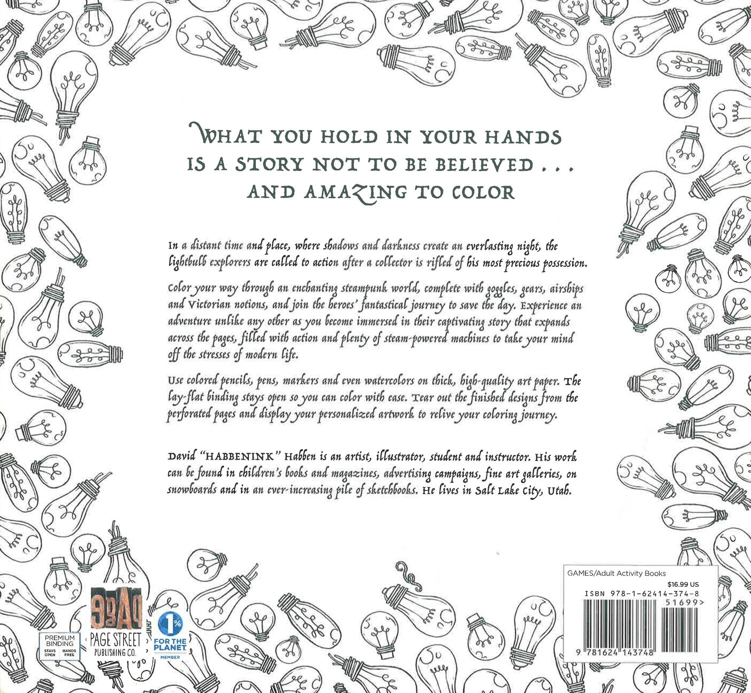 David takes readers to an exciting and inspiring fantasy world where the light bulb explorers are on a journey to rescue a rare light bulb from an evil collector, complete with gears and airships, often seen as hallmarks of the steampunk style. This coloring book is unique because it not only provides a topic that has not been used in the coloring book world, but it also tells a story. It features 50 unique illustrations and gold foil on the front cover.