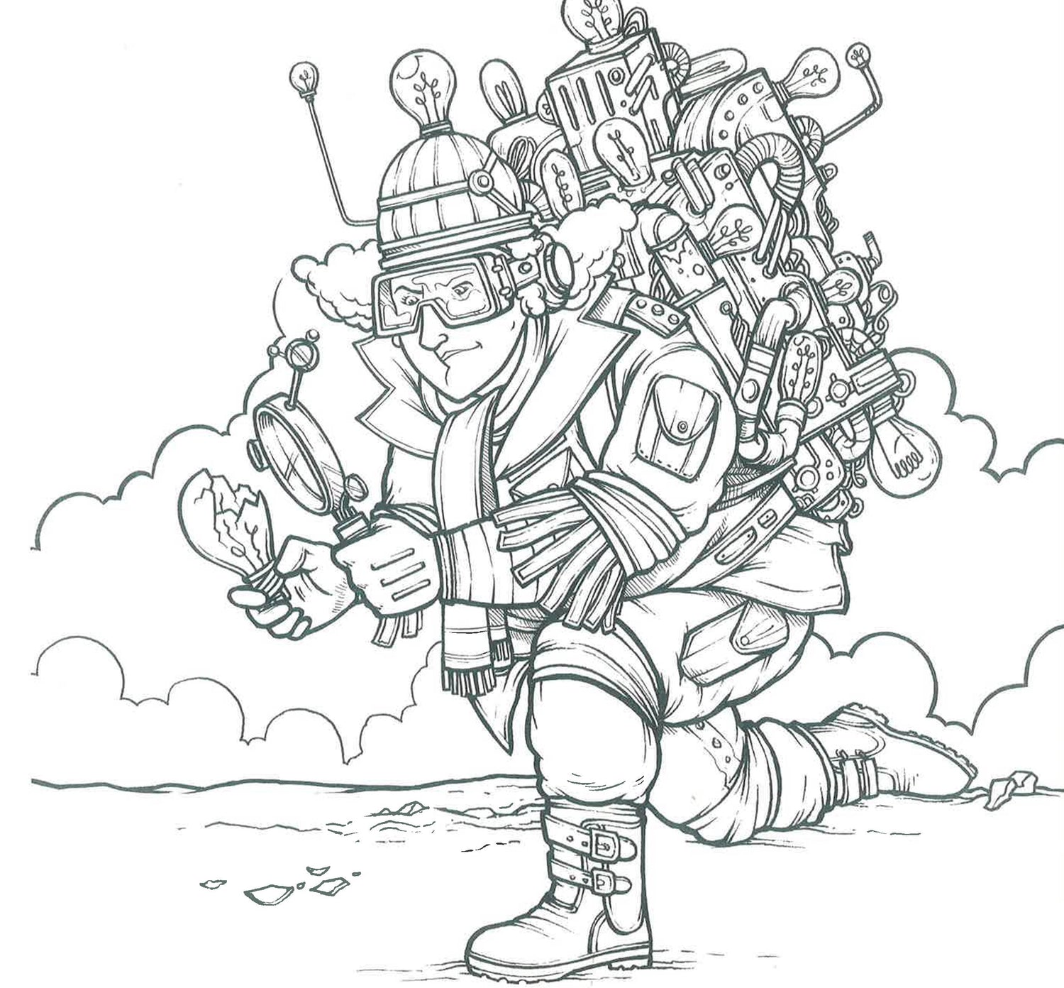Escape the modern world and travel to a land of fantasy with The Search for the Lightbulb Burglar. David Habben’s illustrations follow the journey of the light bulb explorers through their steampunk world. Steampunk is a genre of fantasy/science fiction that reimagines Victorian era designs with modern technology, often through the use of steam. It spans from literature (Jules Verne; H.G. Wells) to fashion, music, lifestyle, etc. The style of the characters with lightbulbs on their heads can be seen as steampunk in style, with the goggles, Victorian-esque clothing, gears and backpack apparatus.