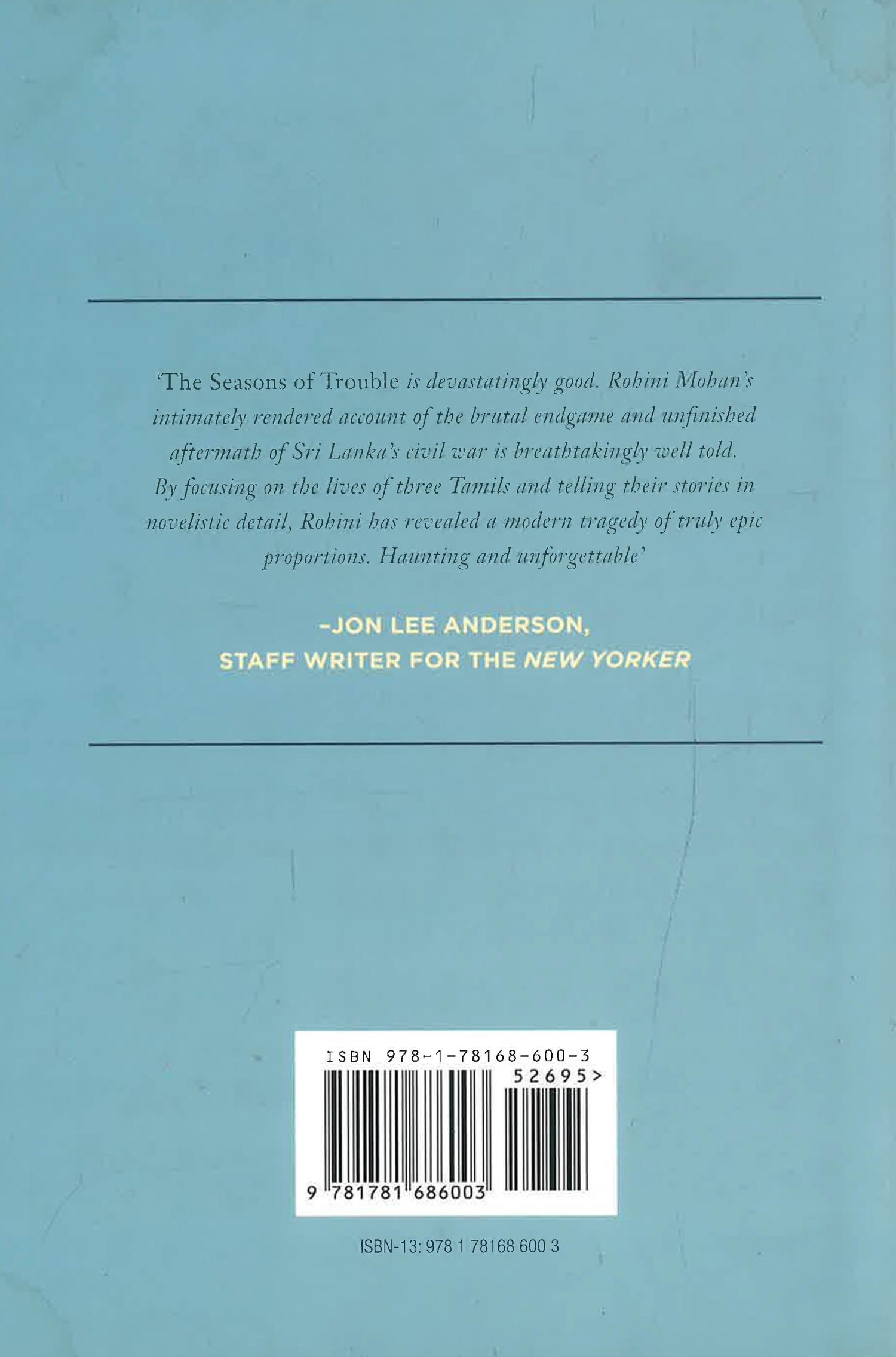 For three decades, Sri Lanka’s civil war tore communities apart. In 2009, the Sri Lankan army finally defeated the separatist Tamil Tigers guerrillas in a fierce battle that swept up about 300,000 civilians and killed more than 40,000. More than a million had been displaced by the conflict, and the resilient among them still dared to hope. But the next five years changed everything.Rohini Mohan’s searing account of three lives caught up in the devastation looks beyond the heroism of wartime survival to reveal the creeping violence of the everyday. When city-bred Sarva is dragged off the streets by state forces, his middle-aged mother, Indra, searches for him through the labyrinthine Sri Lankan bureaucracy. Meanwhile, Mugil, a former child soldier, deserts the Tigers in the thick of war to protect her family.Having survived, they struggle to live as the Sri Lankan state continues to attack minority Tamils and Muslims, frittering away the era of peace. Sarva flees the country, losing his way - and almost his life - in a bid for asylum. Mugil stays, breaking out of the refugee camp to rebuild her family and an ordinary life in the village she left as a girl. But in her tumultuous world, desires, plans, and people can be snatched away in a moment.The Seasons of Trouble is a startling, brutal, yet beautifully written debut from a prize-winning journalist. It is a classic piece of reportage, five years in the making, and a trenchant, compassionate examination of the corrosive effect of conflict on a people.