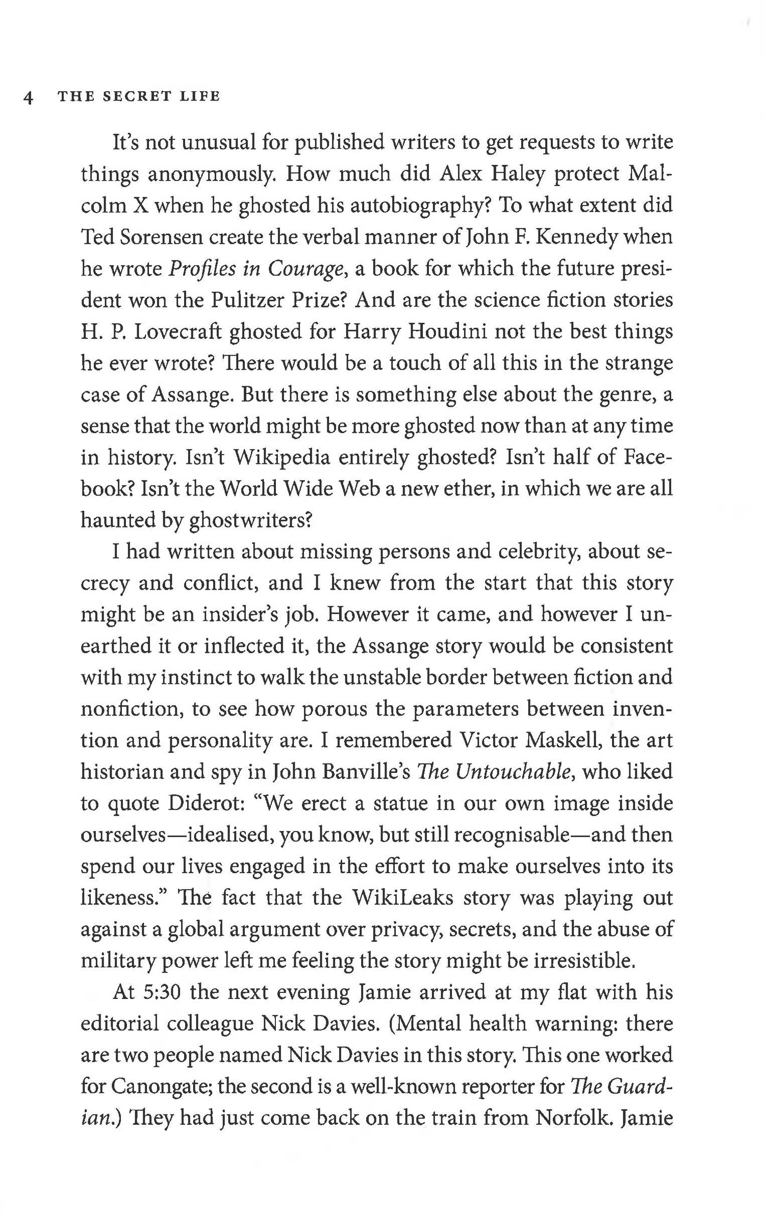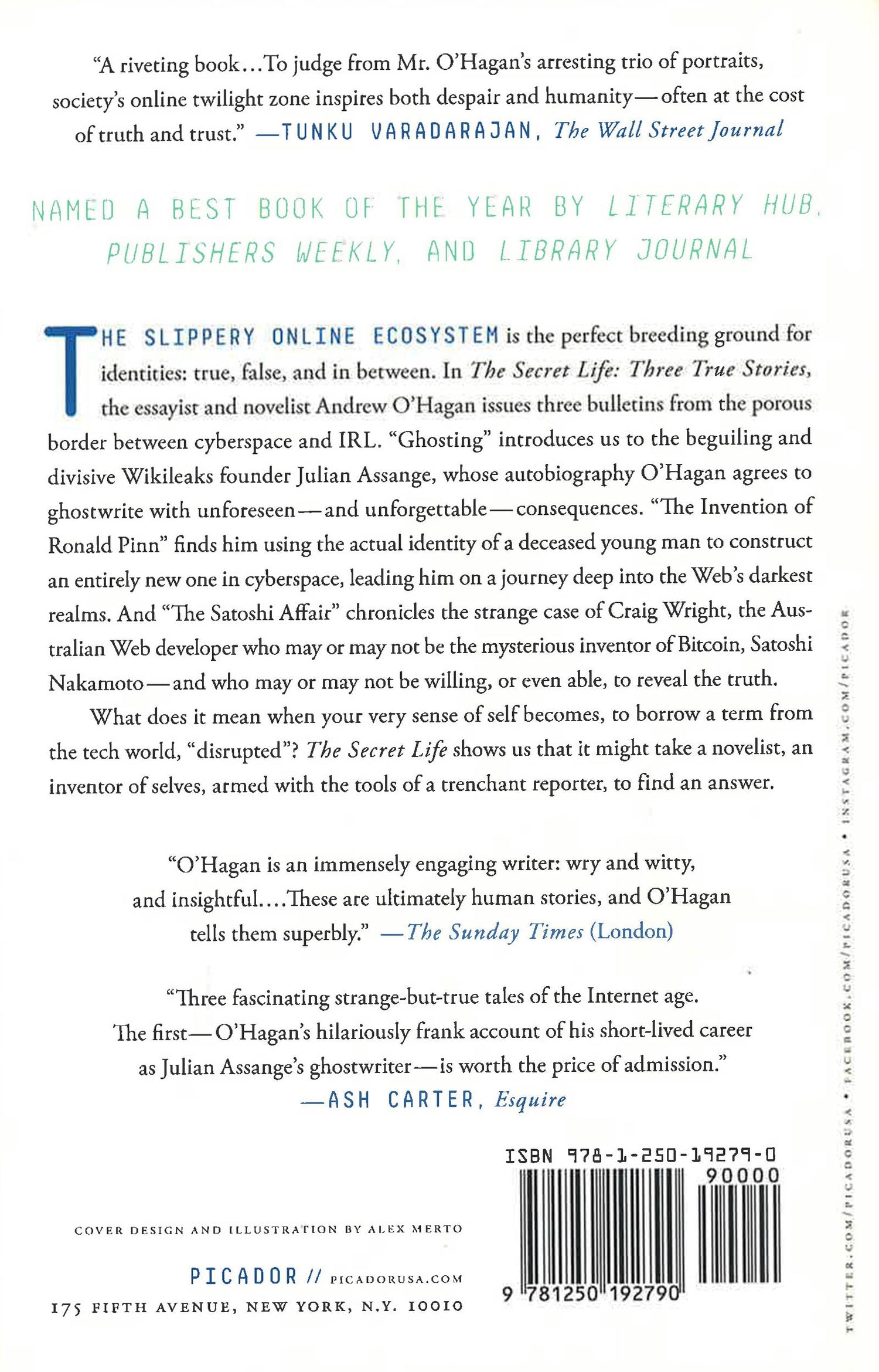 A Publishers Weekly Best Book of the Year • One of Publishers Weekly 's Top 10 Book of Essays and Literary Criticism • One of Chicago Reader 's Books We Can’t Wait to Read in the Rest of 2017 The Secret Life issues three bulletins from the porous border between cyberspace and IRL. “Ghosting” introduces us to the beguiling and divisive Wikileaks founder Julian Assange, whose autobiography O’Hagan agrees to ghostwrite with unforeseen―and unforgettable―consequences. “The Invention of Ronnie Pinn” finds him using the actual identity of a deceased young man to construct an entirely new one in cyberspace, leading him on a journey deep into the Web’s darkest realms. And “The Satoshi Affair” chronicles the strange case of Craig Wright, the Australian Web developer who may or may not be the mysterious inventor of Bitcoin, Satoshi Nakamoto―and who may or may not be willing, or even able, to reveal the truth. These fascinating pieces take us to the weirder fringes of life in a digital world while also casting light on our shared predicaments. What does it mean when your very sense of self becomes, to borrow a term from the tech world, “disrupted”? The Secret Life shows us that it might take a novelist, an inventor of selves, armed with the tools of a trenchant reporter, to find an answer.