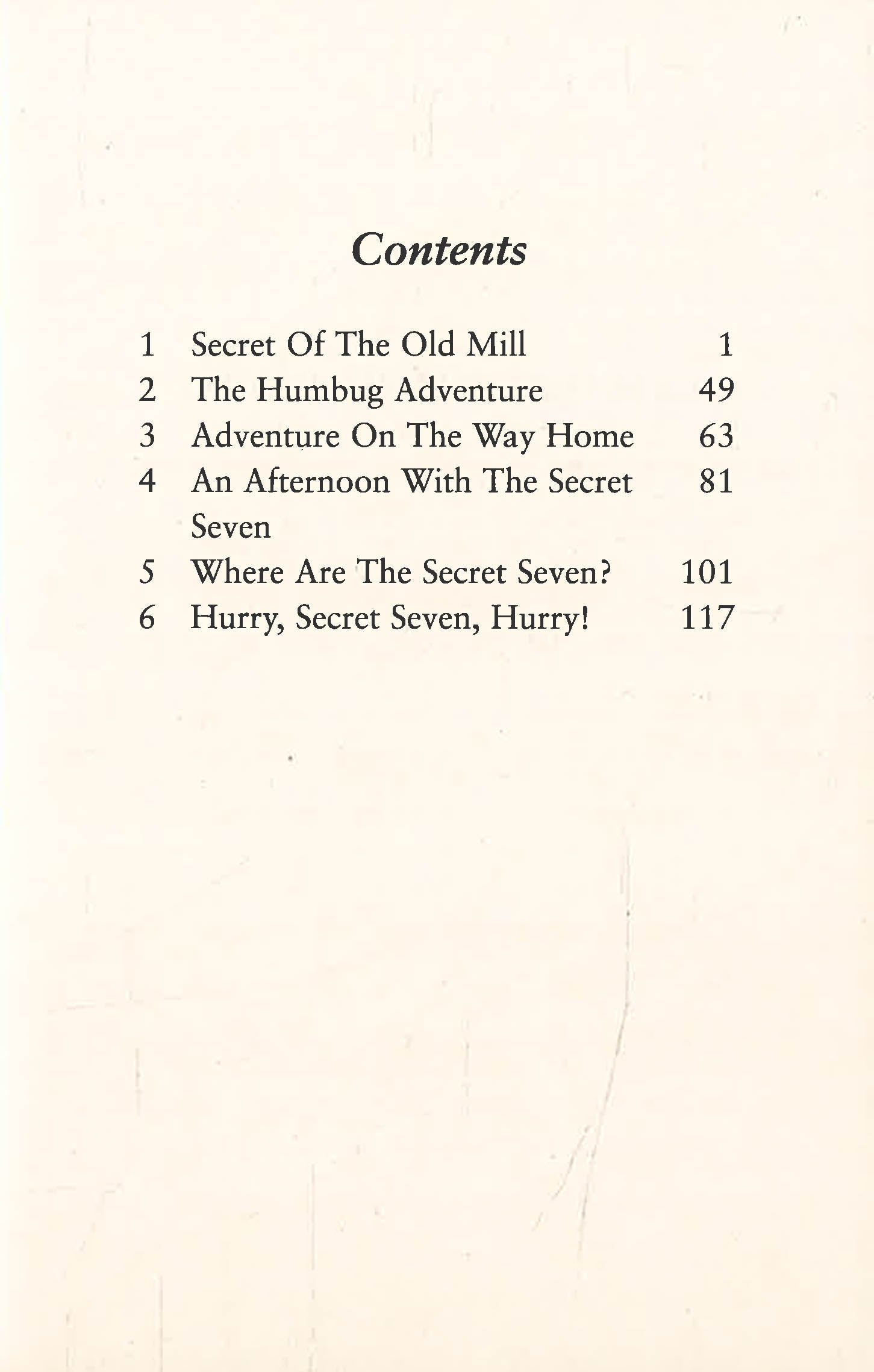 The stories are: The Secret of Old Mill; The Humbug Adventure; Adventure on the Way Home; An Afternoon With the Secret Seven; Where Are the Secret Seven?; Hurry, Secret Seven, Hurry.