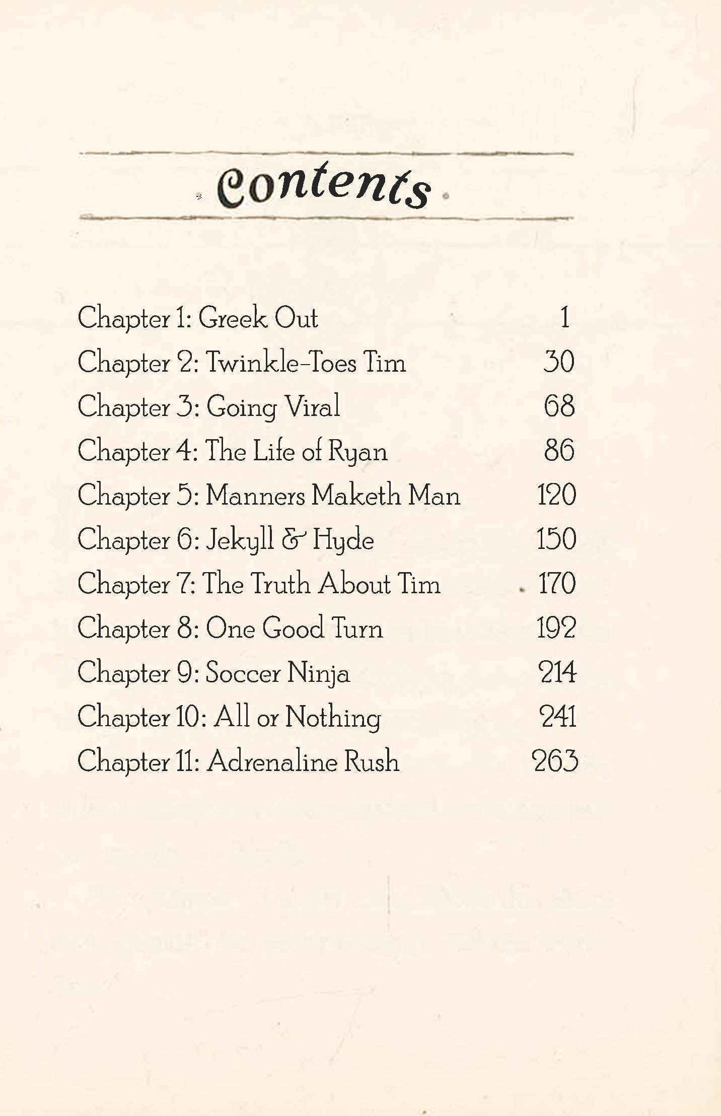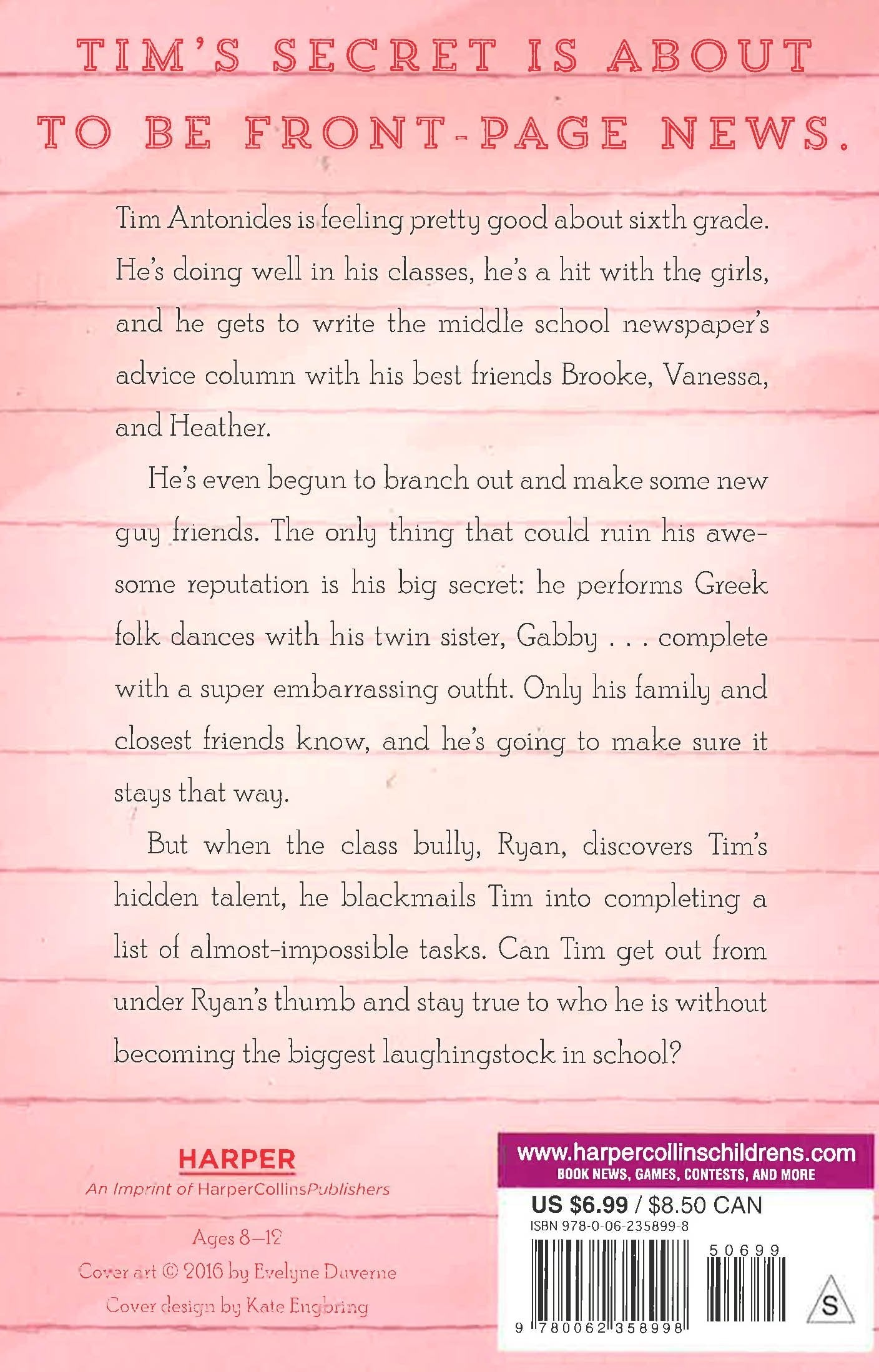 This series features best friends Brooke, Vanessa, Heather, and Tim, who are in charge and confidentially yours when writing their middle school newspaper’s advice column.Tim Antonides is feeling pretty good about sixth grade. He’s even begun to branch out and make some new guy friends. The only thing that could ruin his awesome reputation is his big secret - he performs Greek folk dances with his twin sister, Gabby . . . complete with a super embarrassing outfit. Only his family and closest friends know, and he’s going to make sure it stays that way.But when the class bully, Ryan, discovers Tim’s hidden talent, he blackmails Tim into completing a list of almost-impossible tasks. Can Tim get out from under Ryan’s thumb and stay true to who he is without becoming the biggest laughingstock in school?