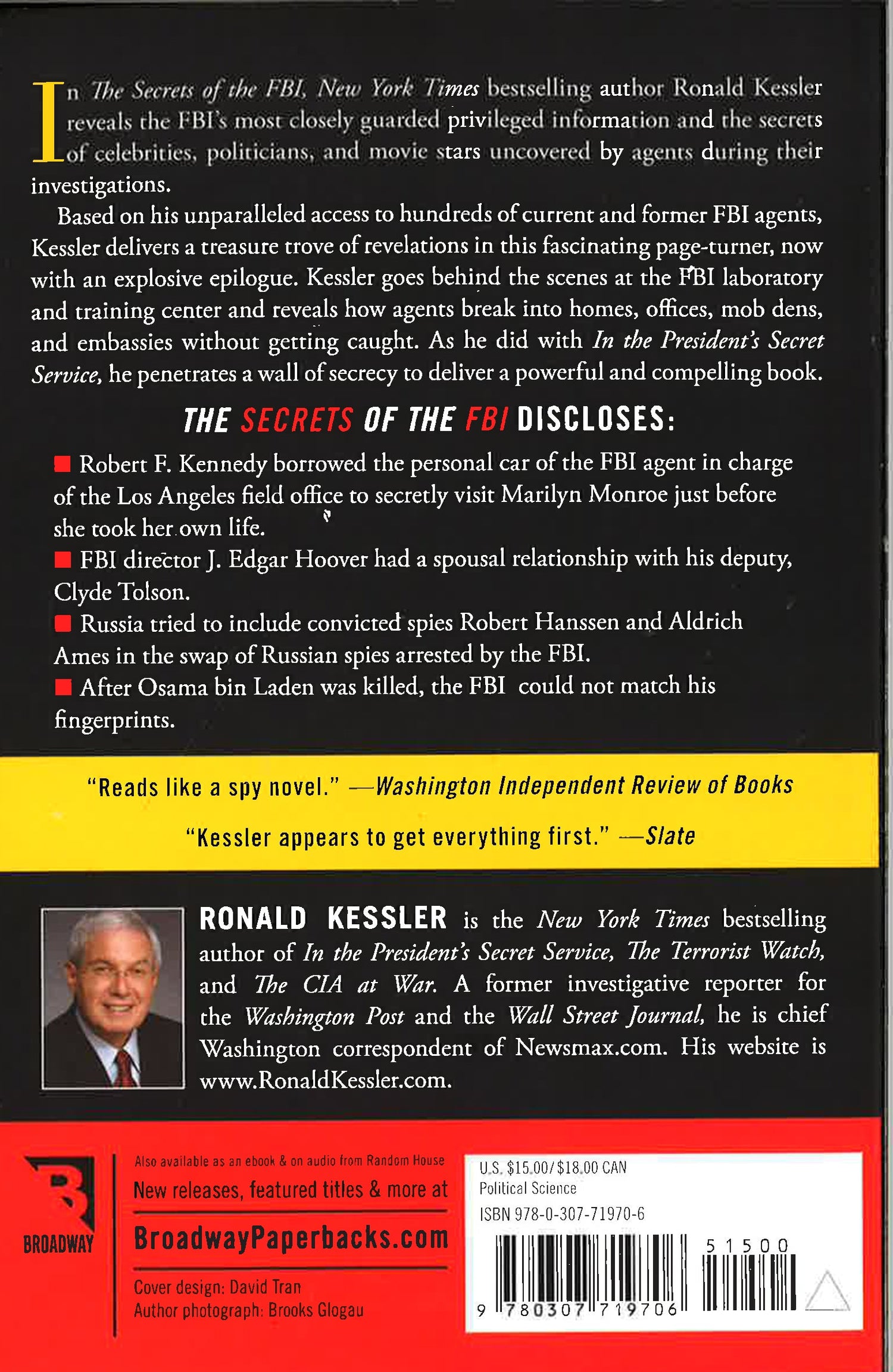 New York Times bestselling author reveals the FBI's most closely guarded secrets, with an insider look at the bureau's inner workings and intelligence investigations. Based on inside access and hundreds of interviews with federal agents, the book presents an unprecedented, authoritative window on the FBI's unique role in American history. From White House scandals to celebrity deaths, from cult catastrophes to the investigations of terrorists, stalkers, Mafia figures, and spies, the FBI becomes involved in almost every aspect of American life. Kessler shares how the FBI caught spy Robert Hanssen in its midst as well as how the bureau breaks into homes, offices, and embassies to plant bugging devices without getting caught. With revelations about the raid on Osama bin Laden's compound, the recent Russian spy swap, Marilyn Monroe's death, Vince Foster's suicide, and even J. Edgar Hoover, The Secrets of the FBI presents headline-making disclosures about the most important figures and events of our time.