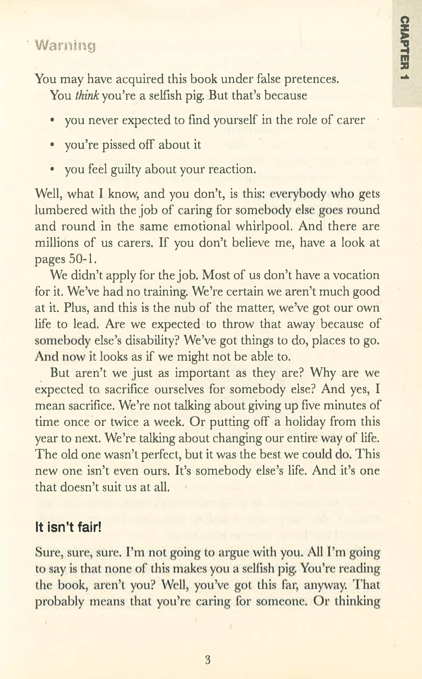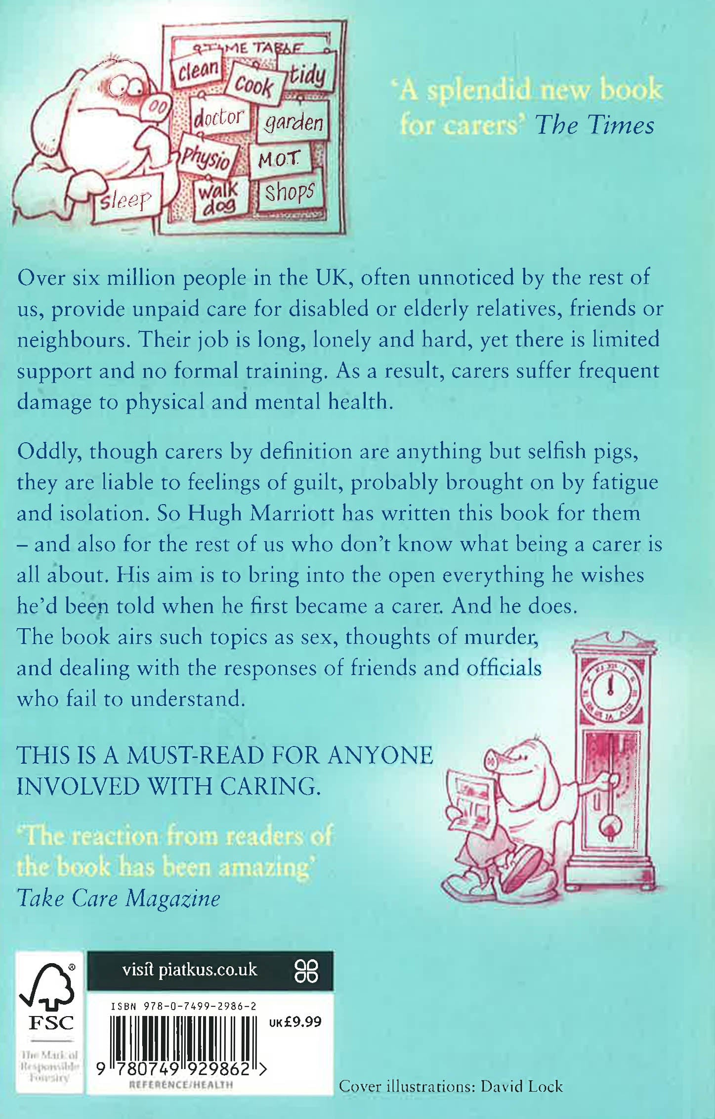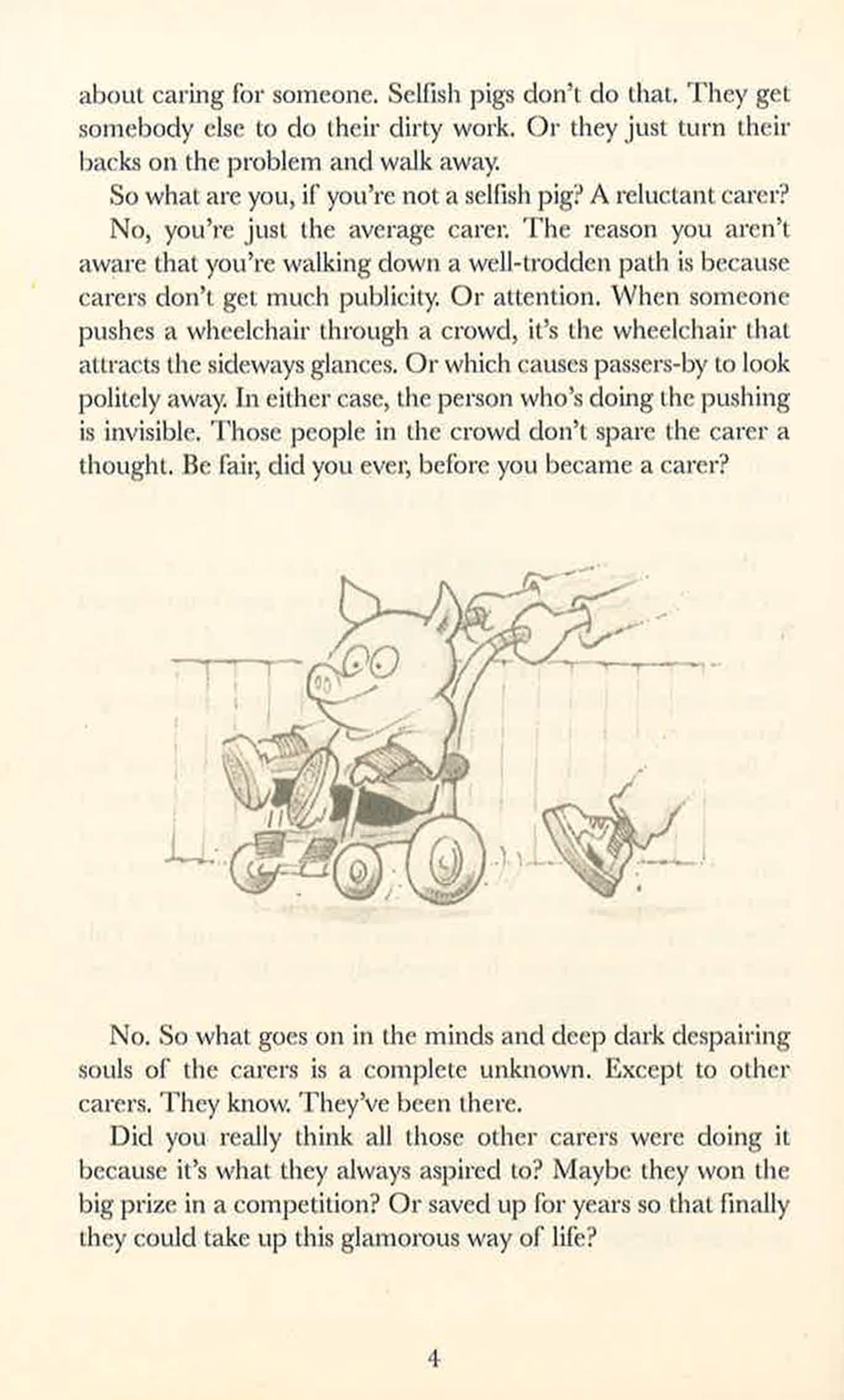 Six million people in the UK, often unnoticed by the rest of us, provide unpaid care for disabled or elderly relatives, friends or neighbours. Their job is long, lonely and hard, yet there is limited support and no formal training. As a result, carers suffer frequent damage to physical and mental health. Oddly, though carers by definition are anything but selfish pigs, they are liable to feelings of guilt, probably brought on by fatigue and isolation. So Hugh Marriott has written this book for them - and also for the rest of us who don't know what being a carer is all about. His aim is bring into the open everything he wishes he'd been told when he first became a carer. And he does. The book airs such topics as sex, thoughts of murder, and dealing with the responses of friends and officials who fail to understand. This is a must-read for anyone involved with caring.